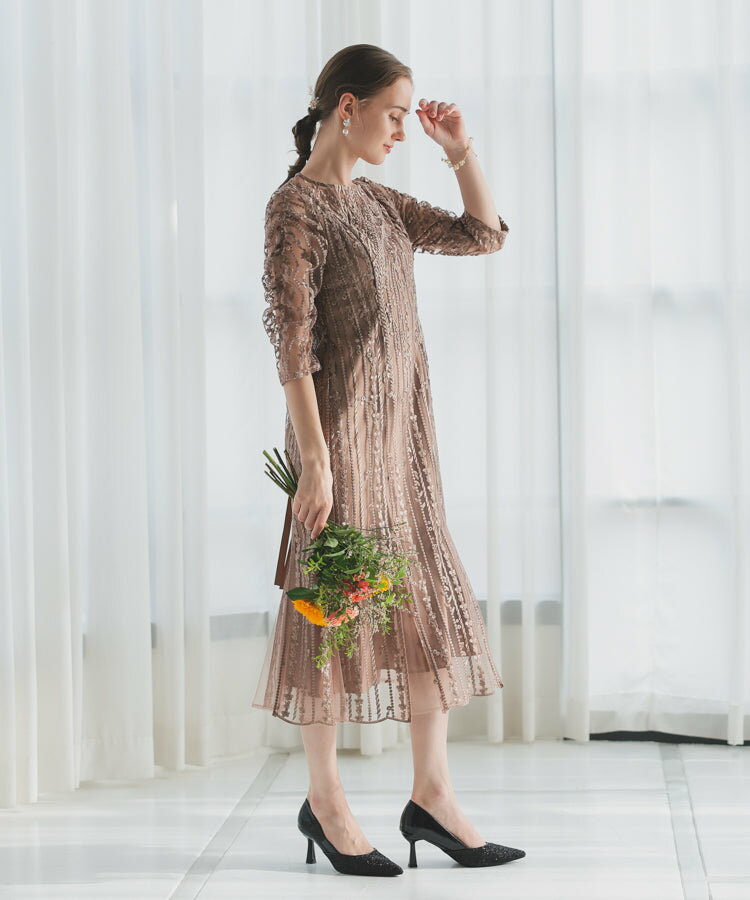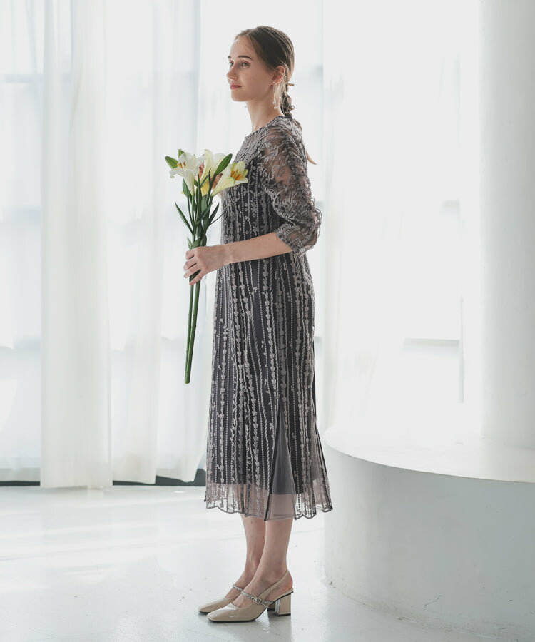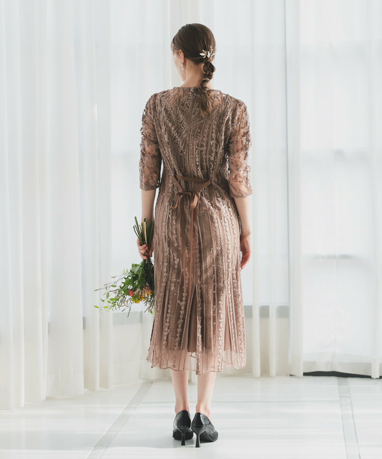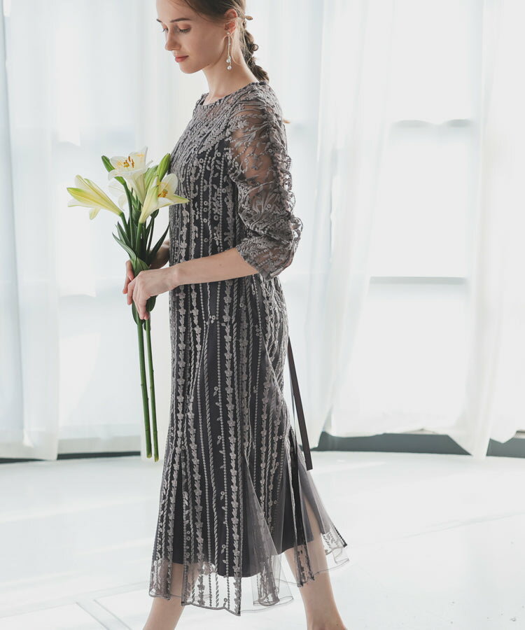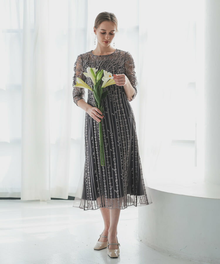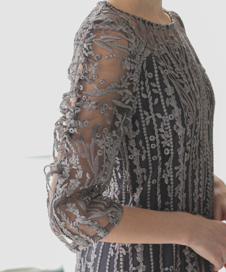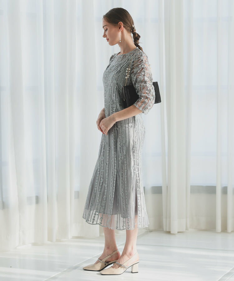 レースレディース ドレス ソフトマーメイド ストライプ 刺繍 低身長 お呼ばれ 同窓会 結婚式 フォーマル 50代 参列 ワンピース ひざ下丈 お見合い ウエスト絞り 披露宴 食事会 パーティードレス 秋 ミモレ丈 きれいめ 親族 着やすい 背中ファスナー リーフ柄 ハレモード 公式