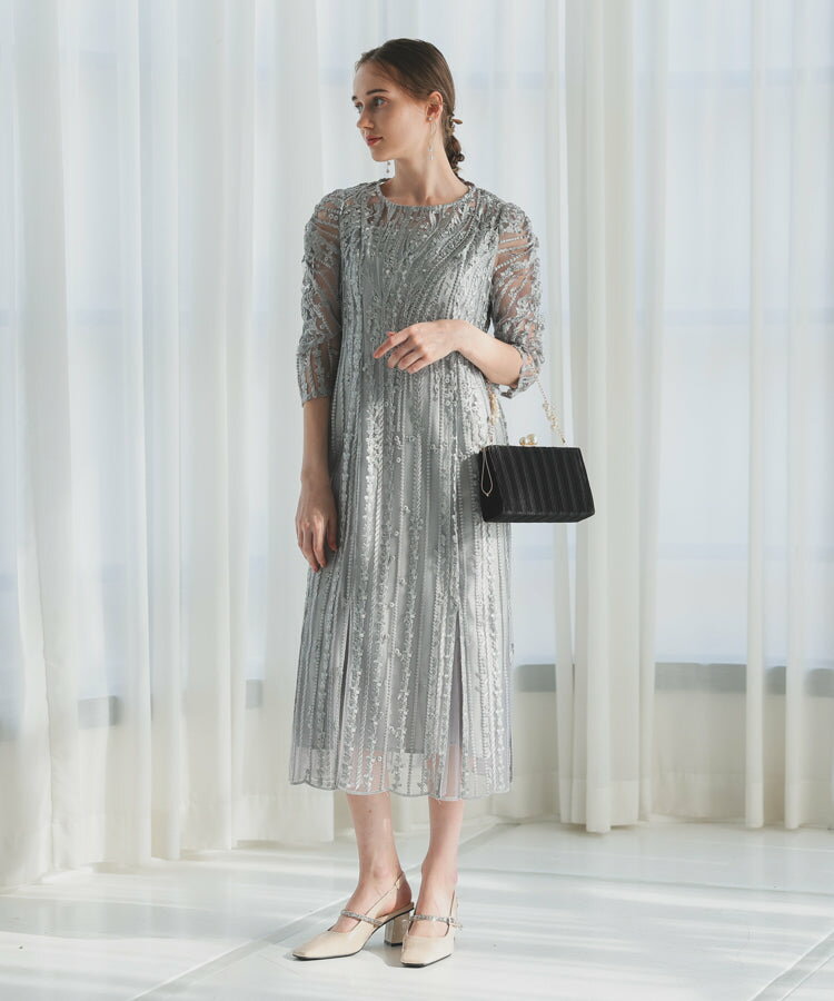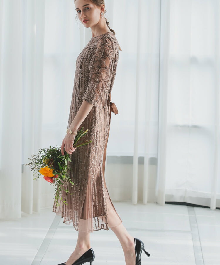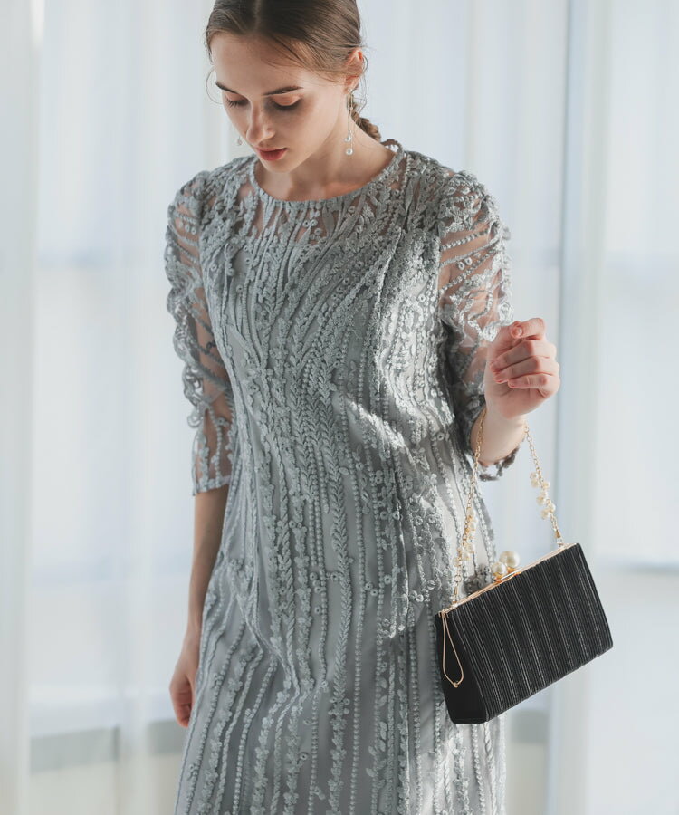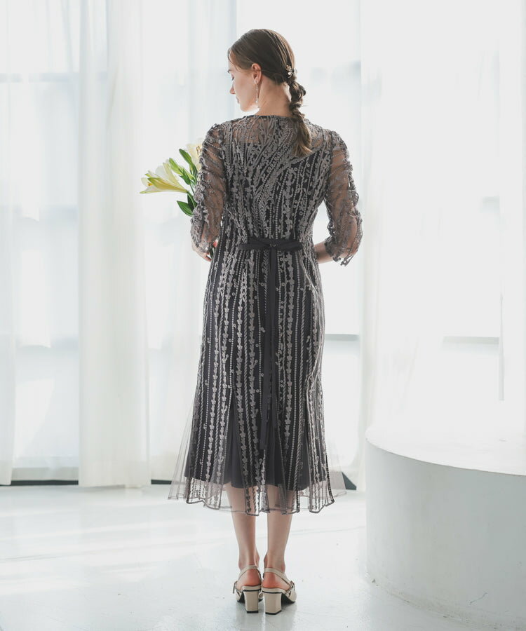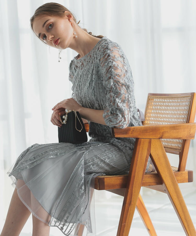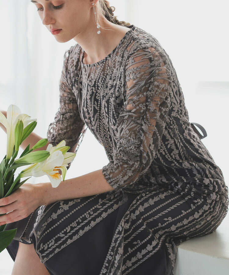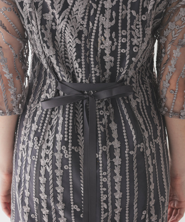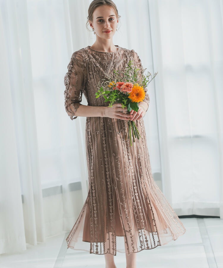 レースレディース ドレス ソフトマーメイド ストライプ 刺繍 低身長 お呼ばれ 同窓会 結婚式 フォーマル 50代 参列 ワンピース ひざ下丈 お見合い ウエスト絞り 披露宴 食事会 パーティードレス 秋 ミモレ丈 きれいめ 親族 着やすい 背中ファスナー リーフ柄 ハレモード 公式