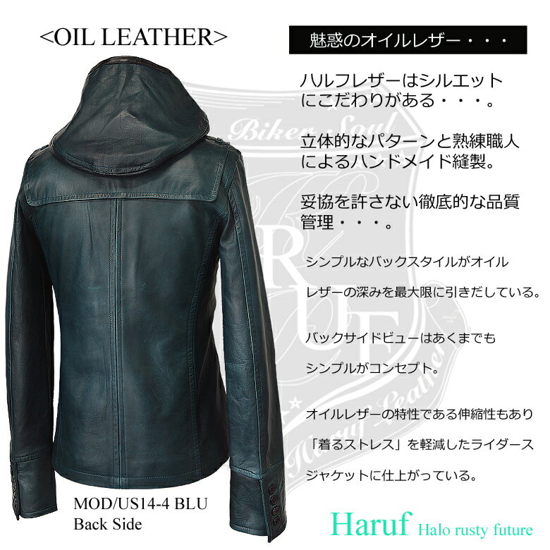 Haruf 本革 レザージャケット メンズ ライダースジャケット 本革 革ジャン 皮ジャン ラムレザージャケット フード レザーコート ダッフルコート 本革ジャケット 本皮ジャケット ブルー 青 BLUE 秋冬 US144BLU 春