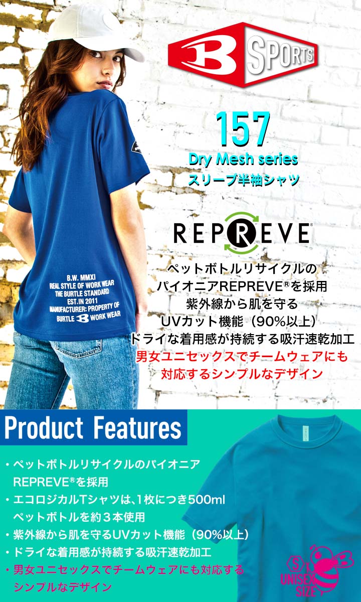 バートル Tシャツ 157 半袖 無地 BURTLE ドライ DRY 吸汗 速乾 男女兼用 メンズ レディース Tシャツ エコ ストレッチ 吸汗速乾加工 UVカット ユニフォーム 制服 無地シャツ オールシーズン 作業着 作業服 BURTLE