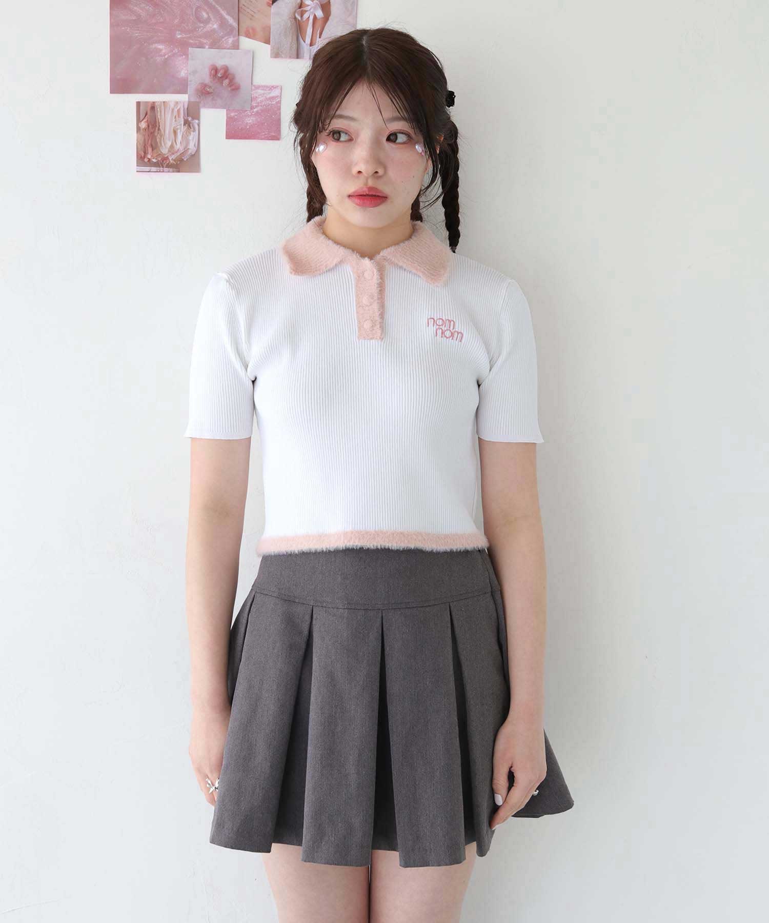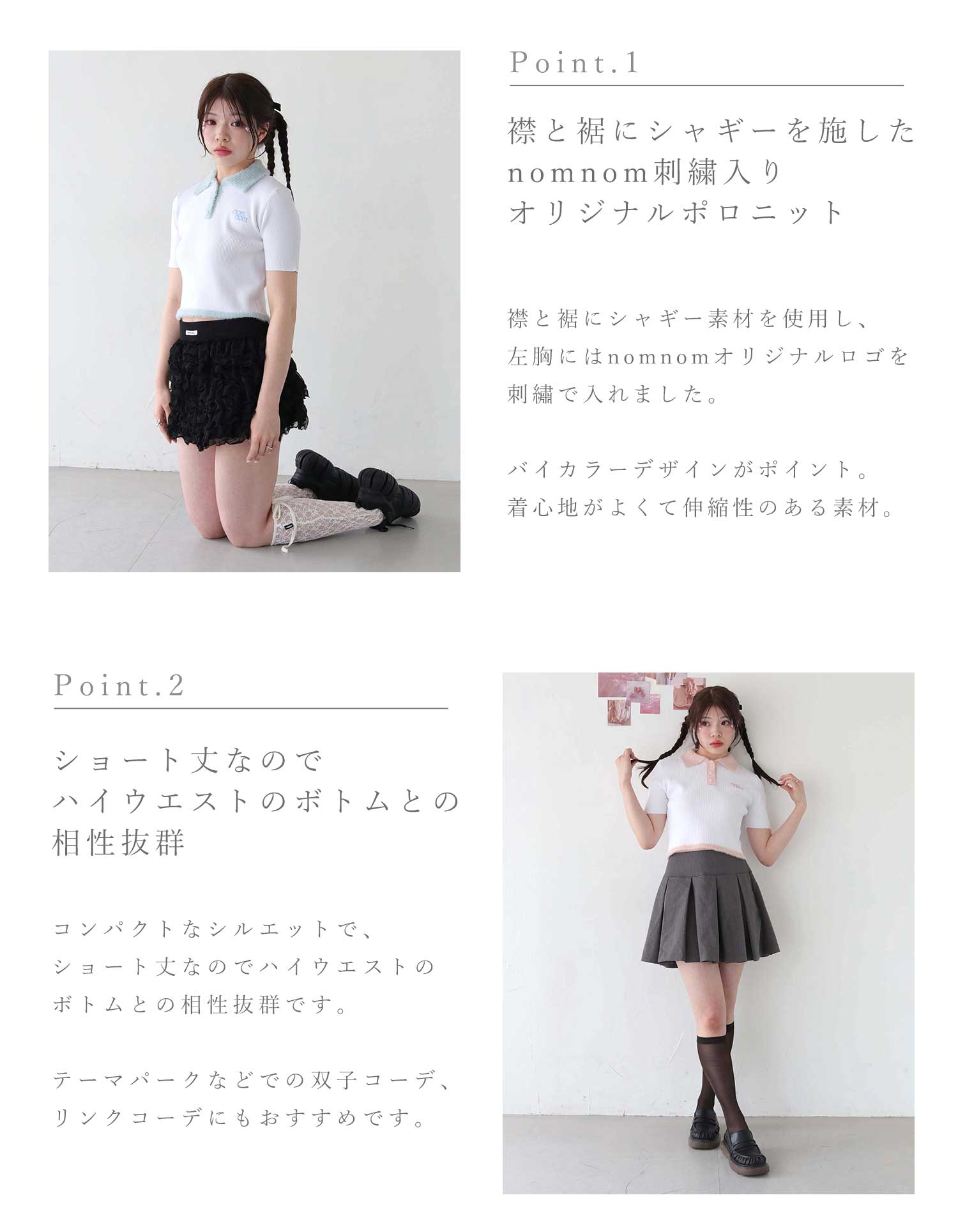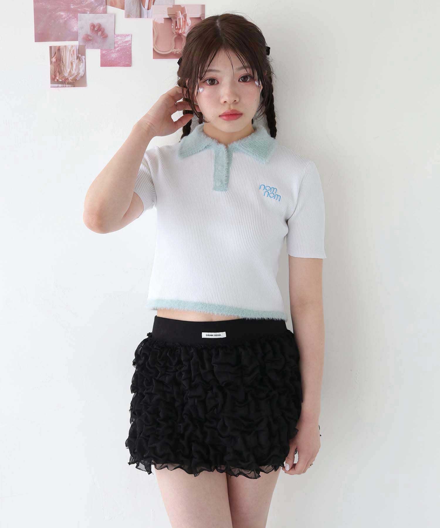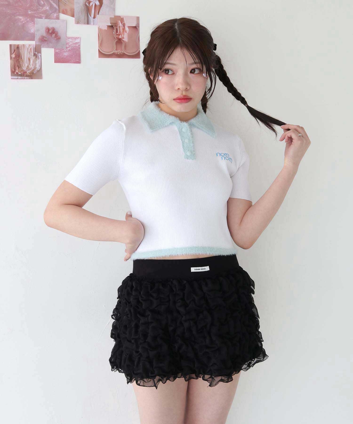 【60%OFF】シャギー デザイン ポロニット サマーニット ニット ポロシャツ 半袖 レディース 春 夏 秋 えりつきニット バイカラー ガーリー 可愛い 韓国ファッション フェミニン ふわふわ ロゴ ショート丈 ポロネック パステル 異素材 ポロネック