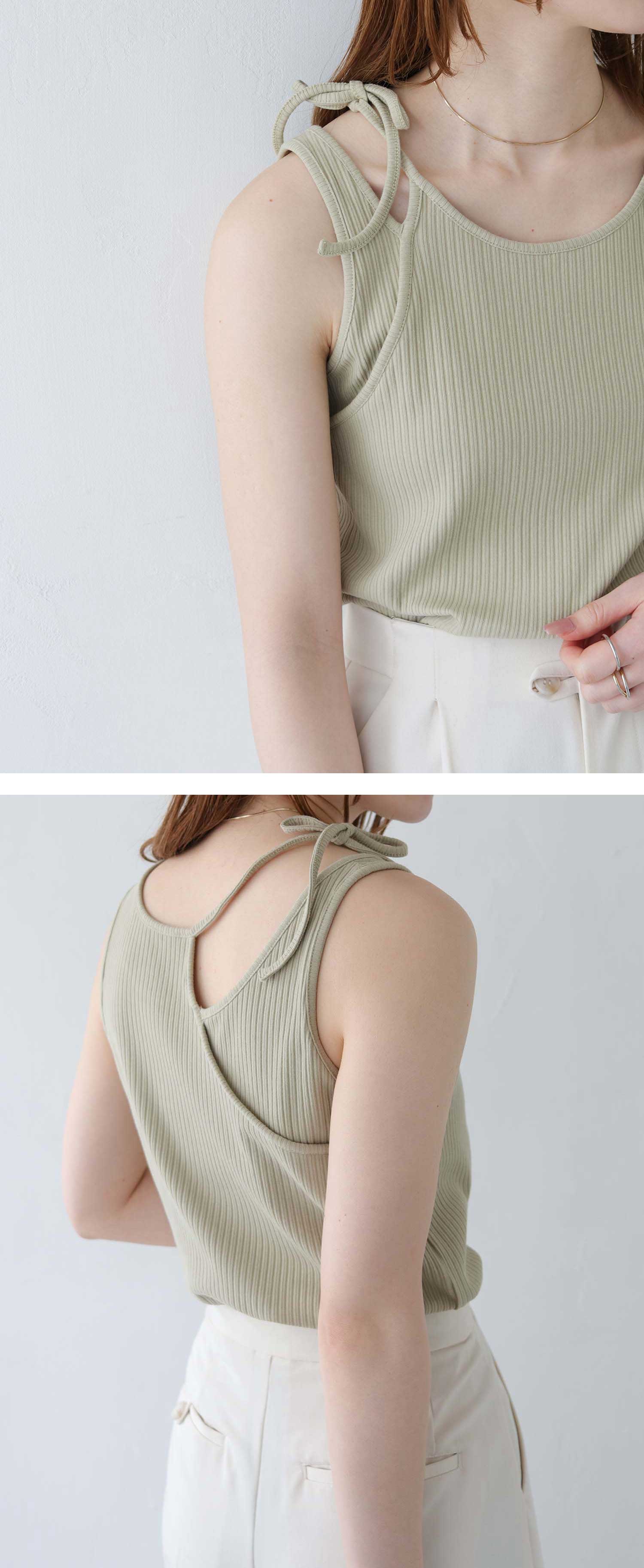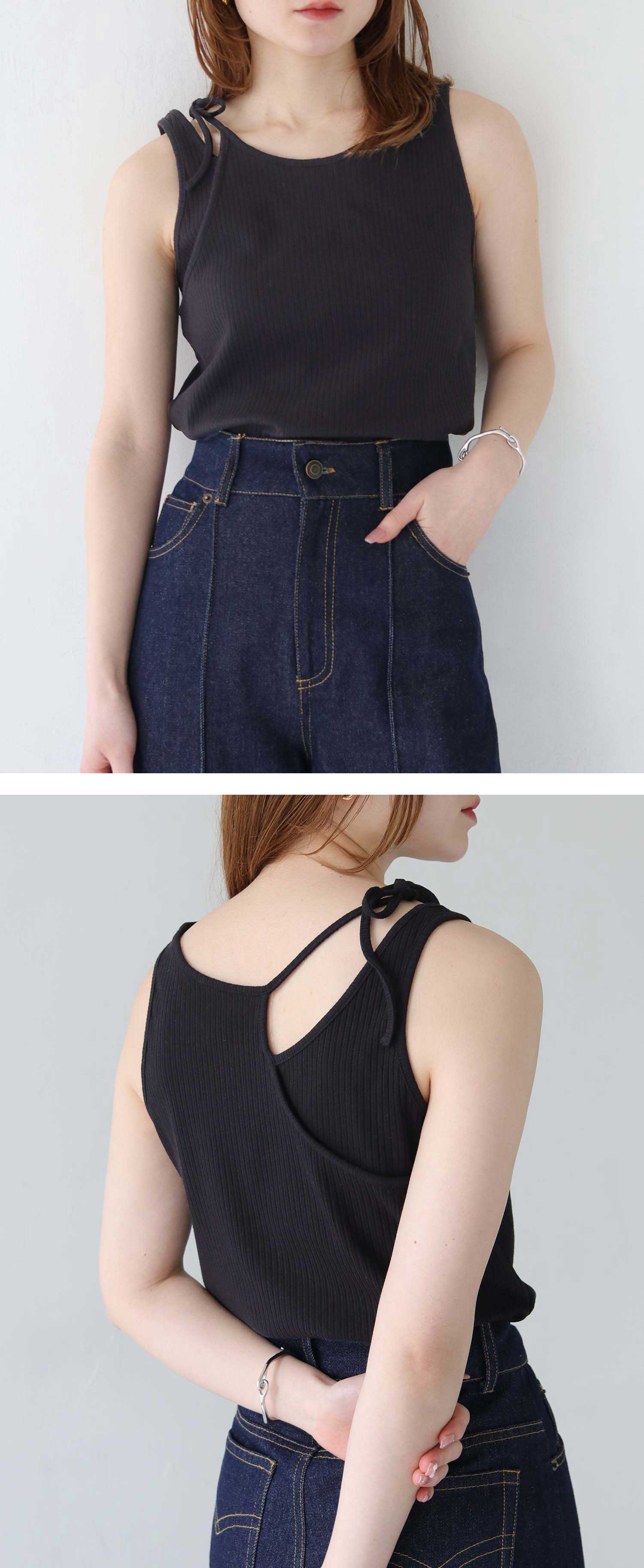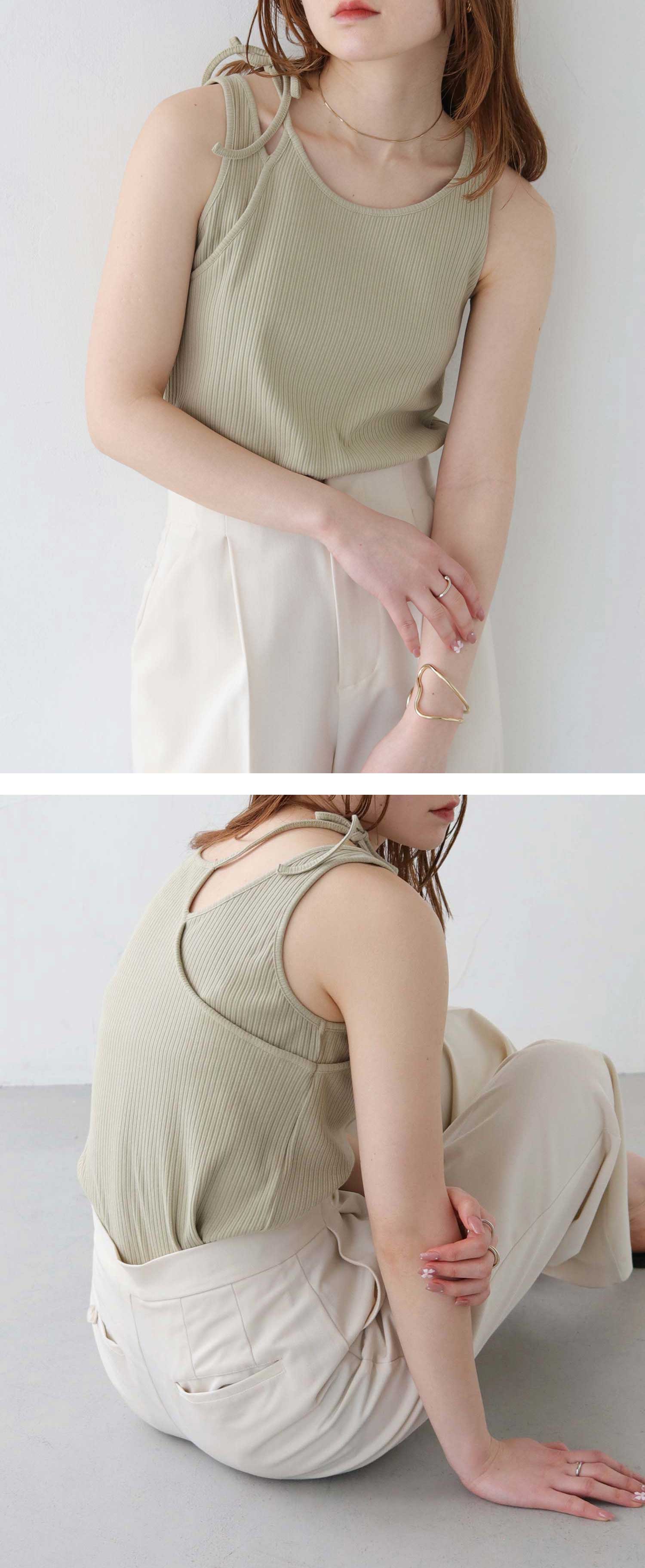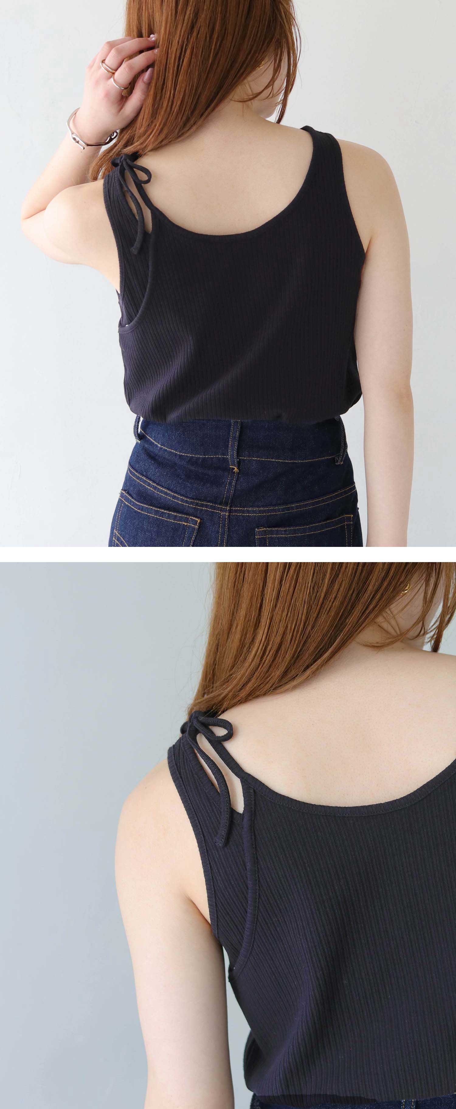 【C服袋対象】前後2WAY アシンメトリー リブ タンクトップ トップス ノースリーブ カットソー キャミ インナー レディース 春夏 秋冬 アシメネック リボン クルーネック 肩紐 おしゃれ シンプル きれいめ 大人可愛い 大人カジュアル フェミニン 上品 カットアウト