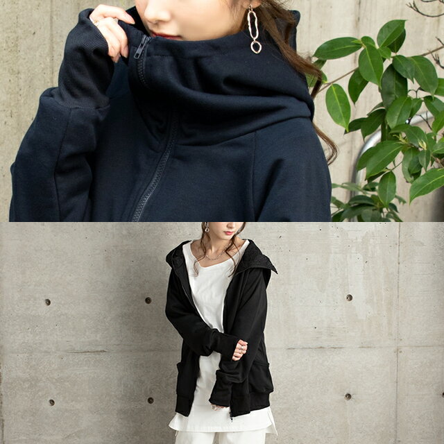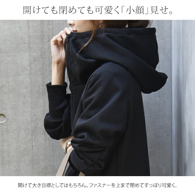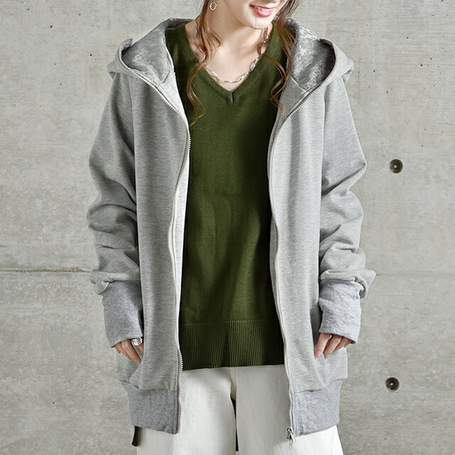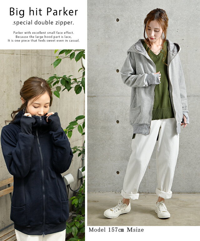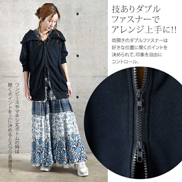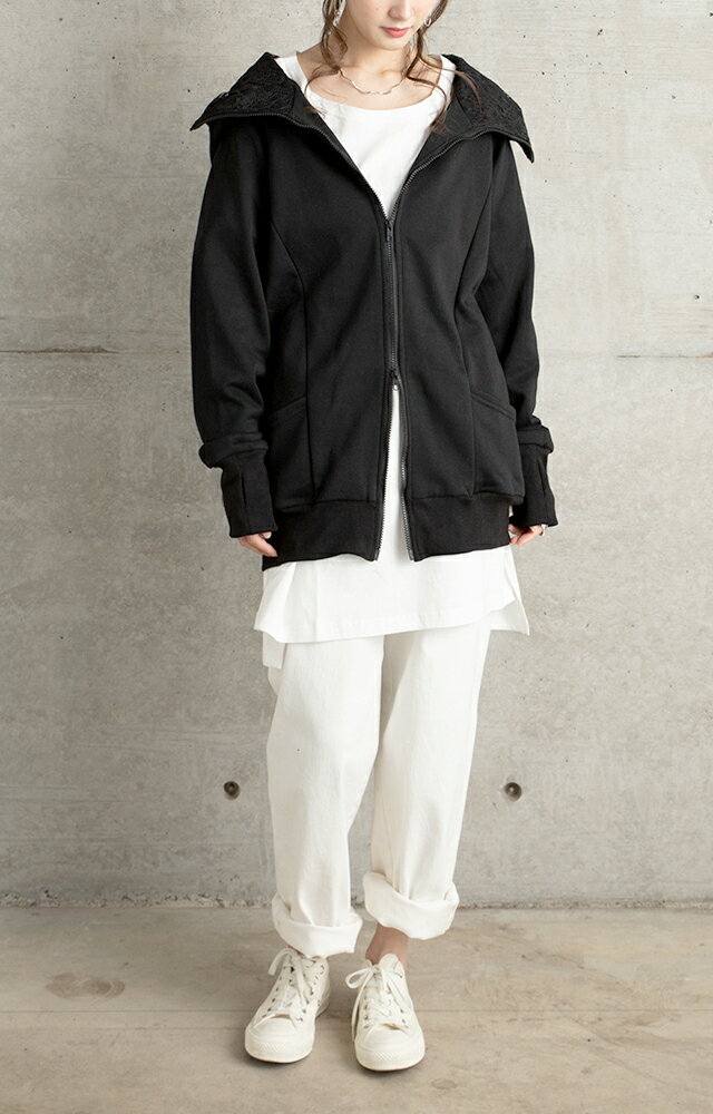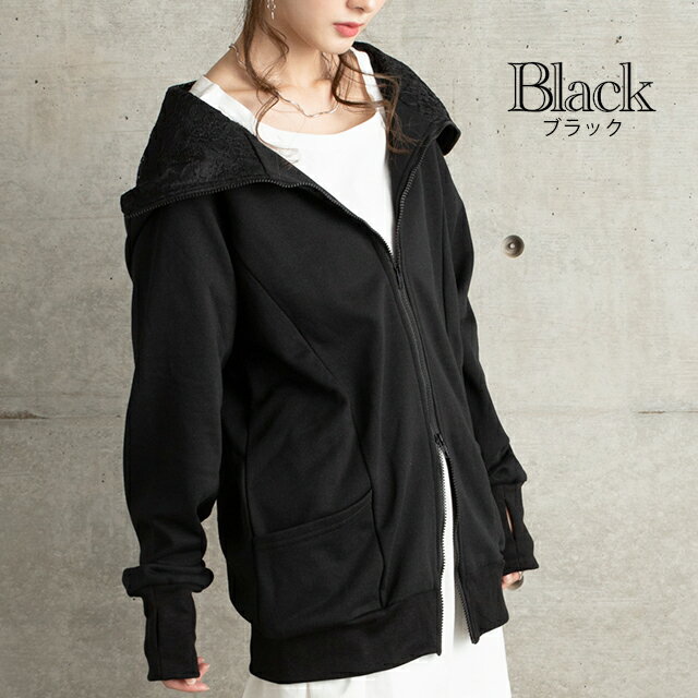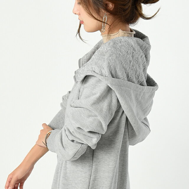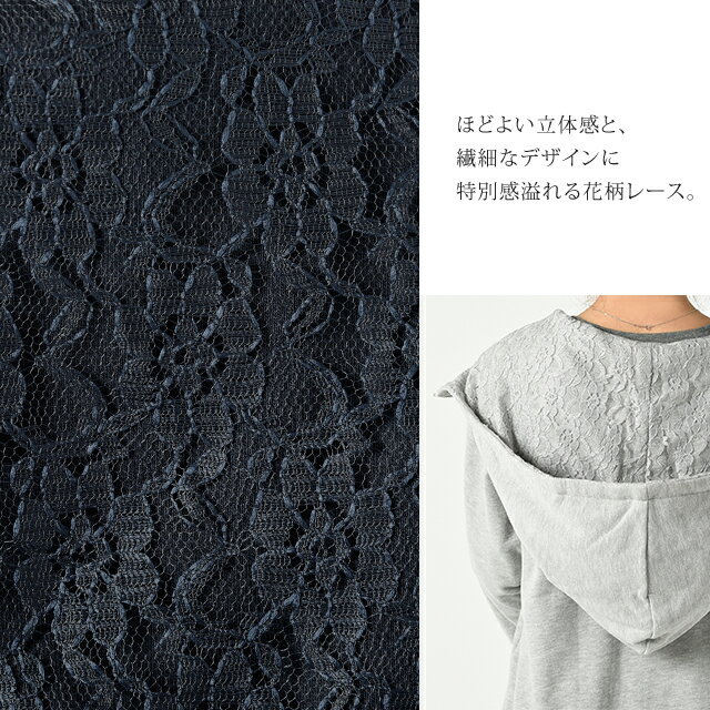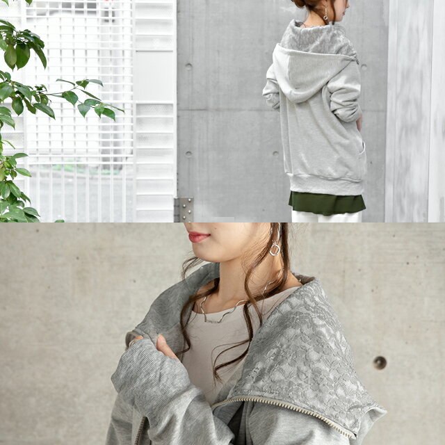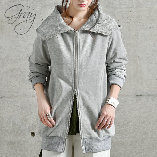 パーカー ロングパーカー レース スウェット スエット 【あす楽】 レースパーカー 花柄 ミディアム ファスナー レディース トレーナー フーディ ジップアップ ダブルジップ 大きいサイズ ビッグシルエット トップス アウター 無地 黒 グレー 秋 冬 HUG.U