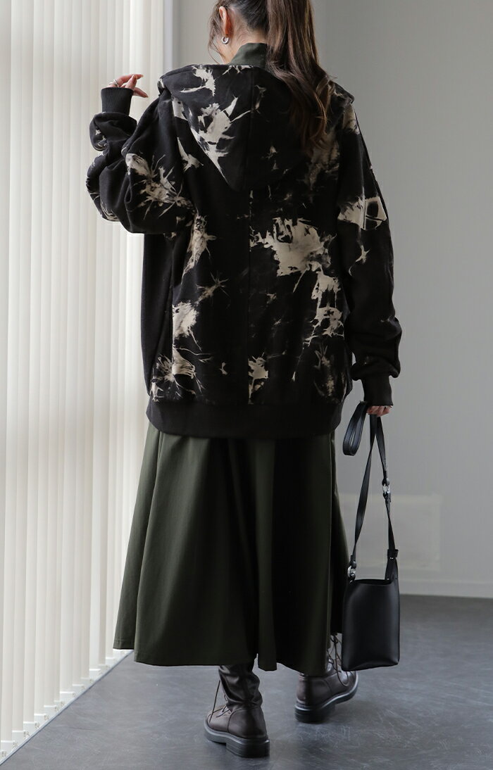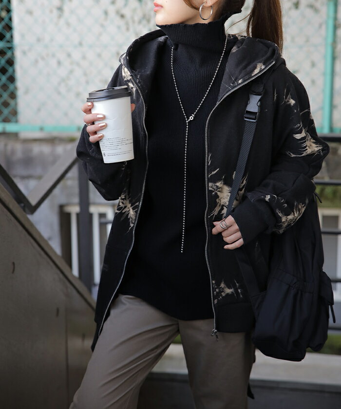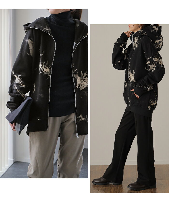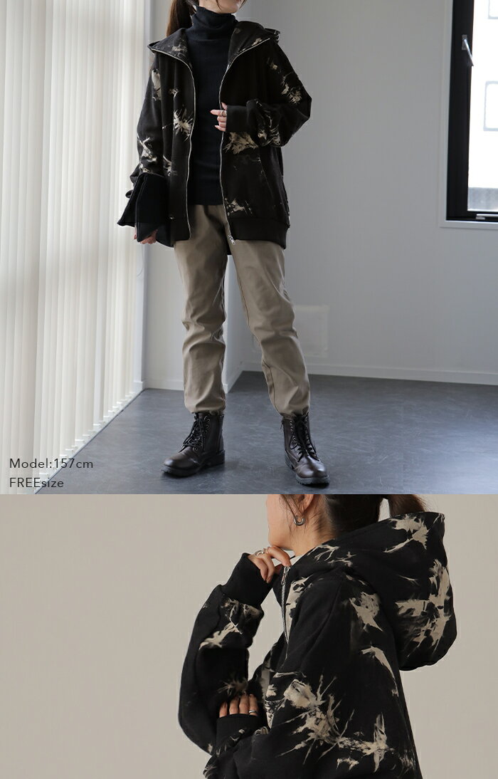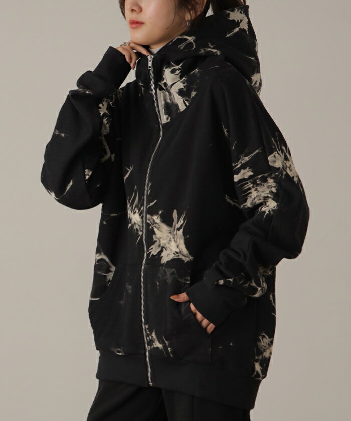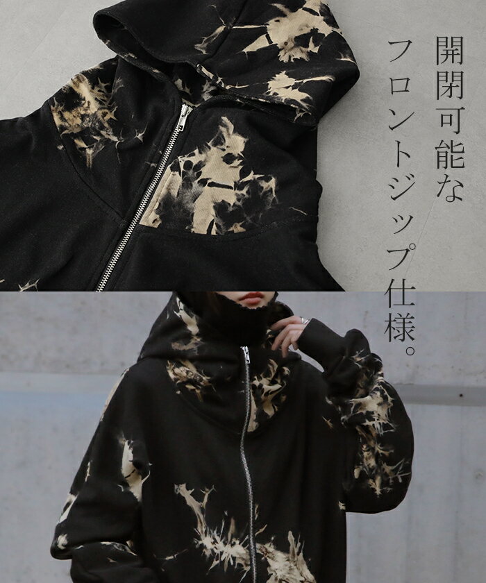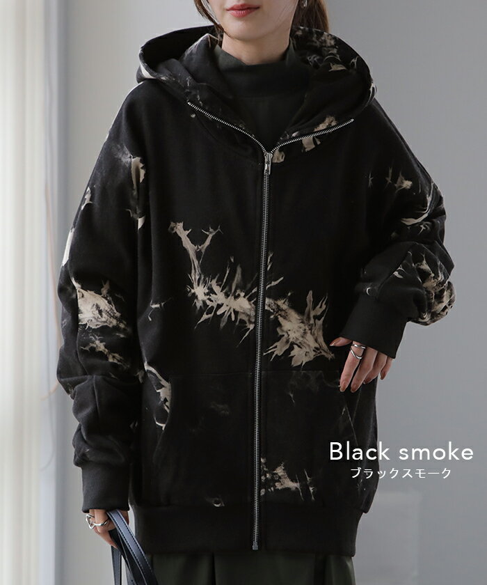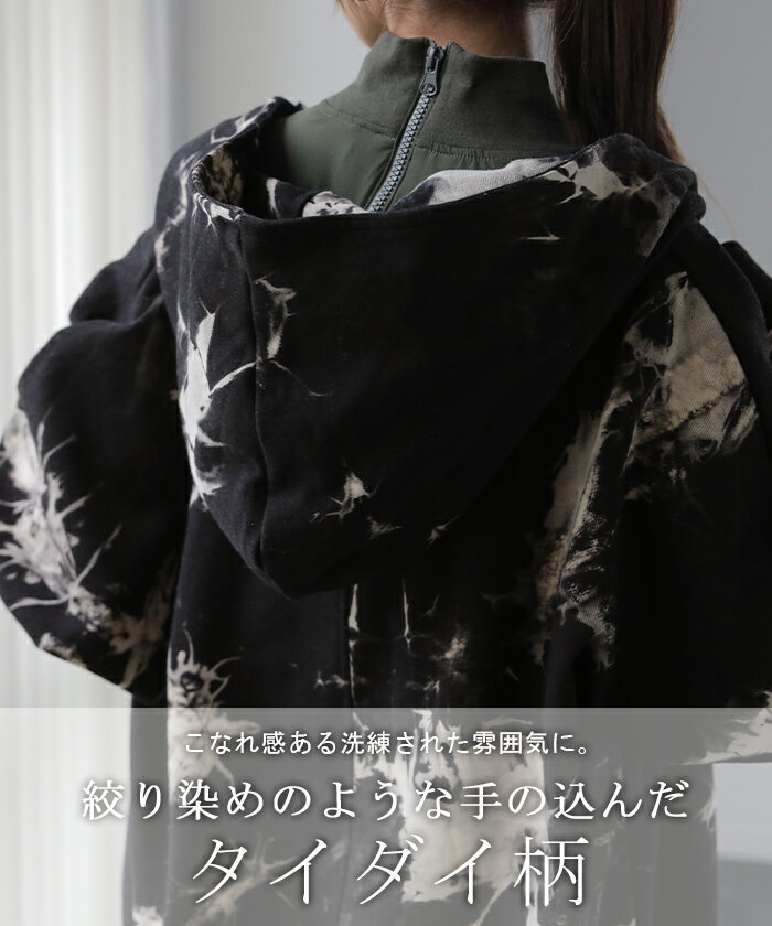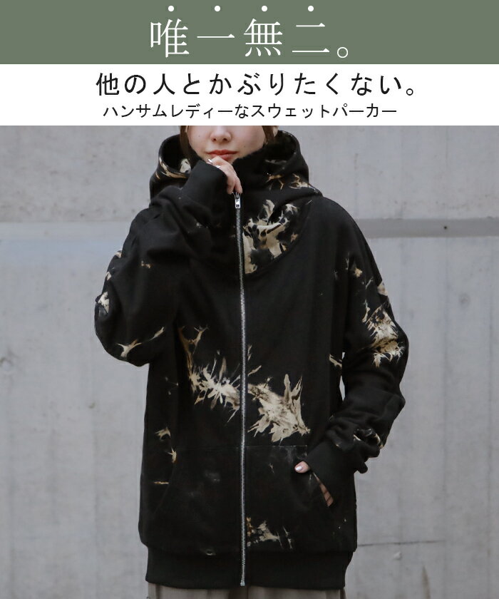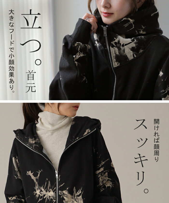 パーカー レディース タイダイ柄 絞り染め 【あす楽】 アウター ジップアップ フード コート フードコート スウェット スエット リブ トレーナー ビッグシルエット ビッグ モノトーン ハイネック 総柄 黒 大きめ 大きいサイズ 春 夏 HUG.U