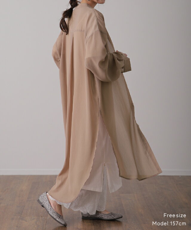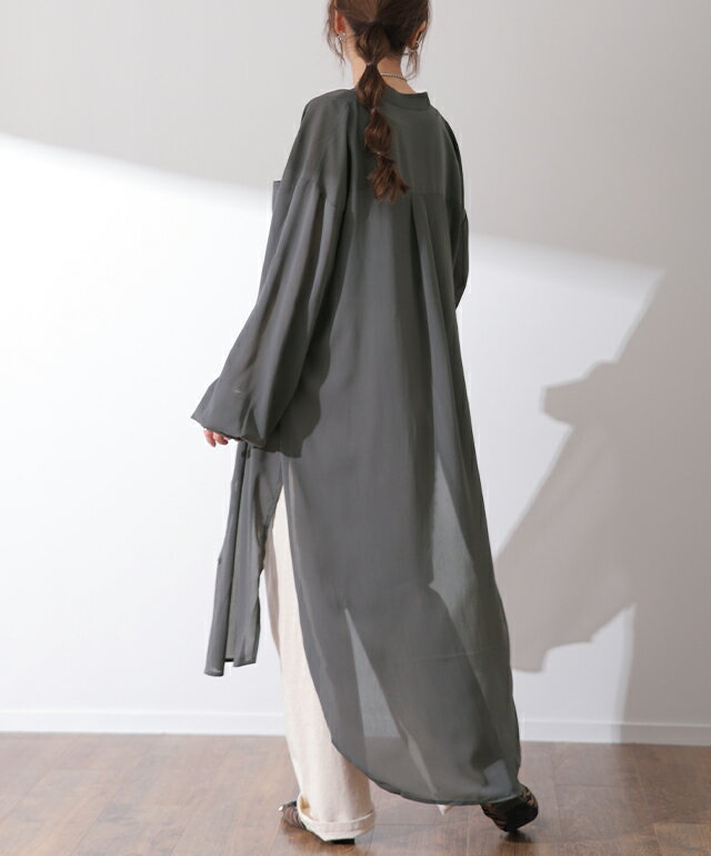 シアーシャツ ロングシャツ シャツ ロング ワンピース シフォンワンピース シフォンワンピ シフォン マキシ ノーカラー 長袖 レディース シアー バンドカラー きれいめ シースルー 黒 白 春 夏 HUG.U