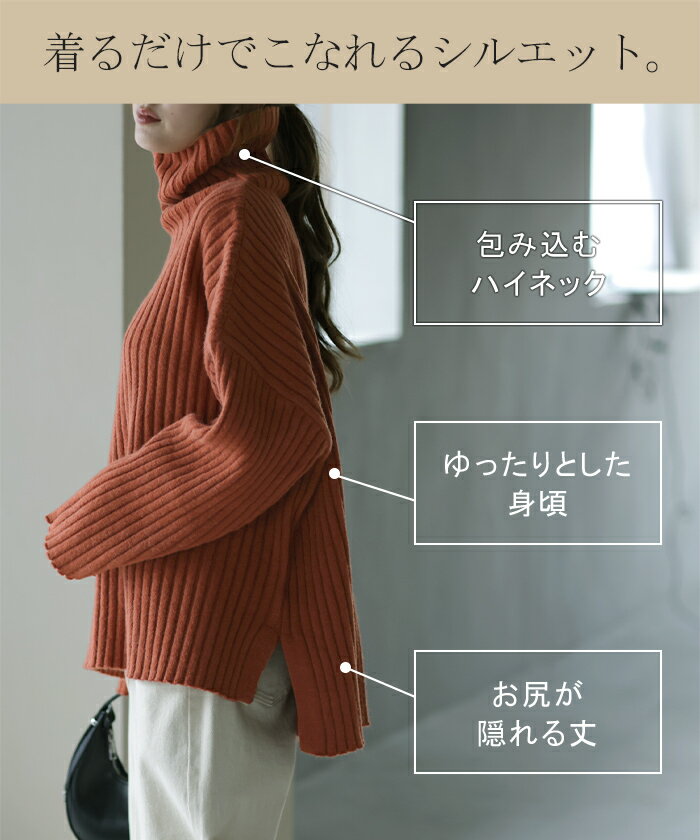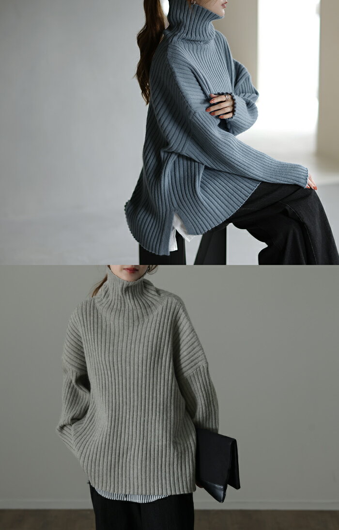 こなれた緩さの小顔ニットニット タートルネック レディース リブ ■一部8月下旬入荷 リブニット セーター モヘア モヘアニット スリット トップス 長袖 ハイネック ビッグシルエット ボトルネック タートル レイヤード プルオーバー 黒 グレー ベージュ 春 夏 HUG.U