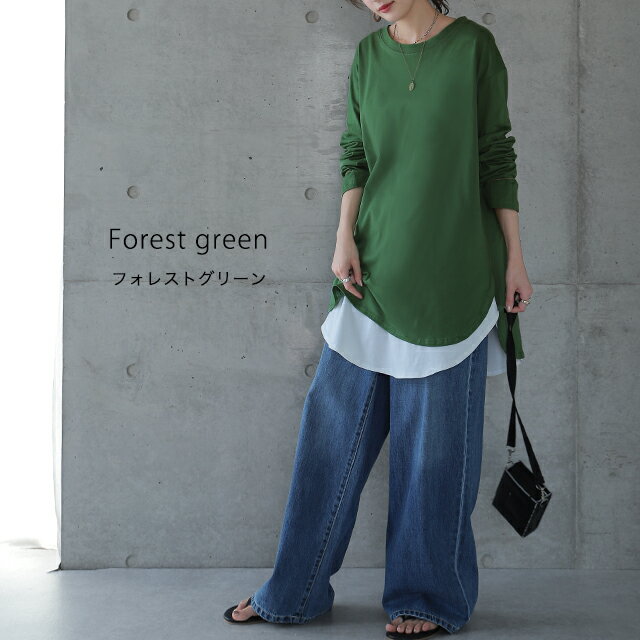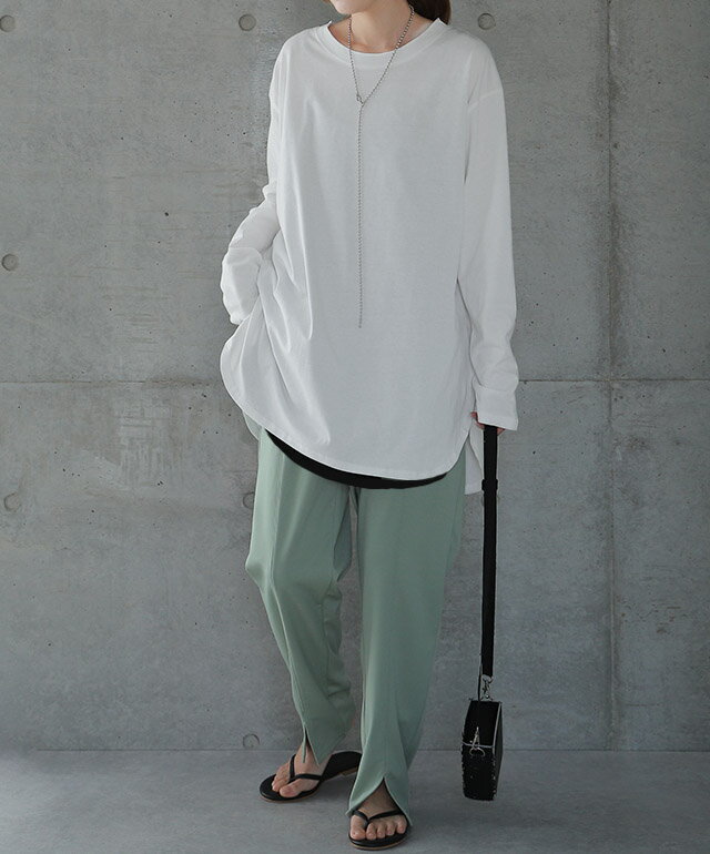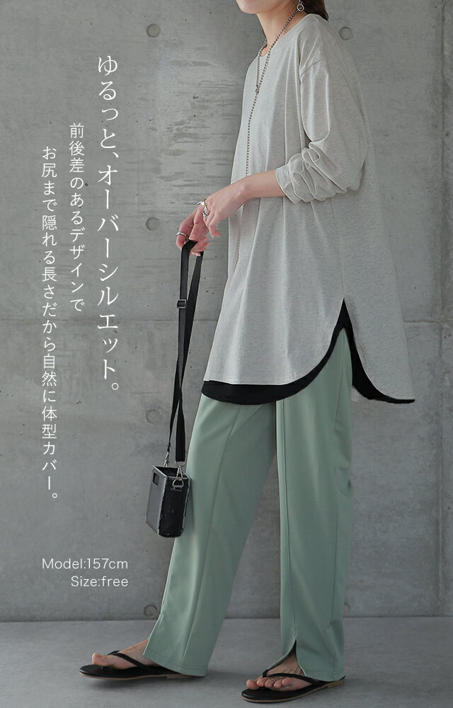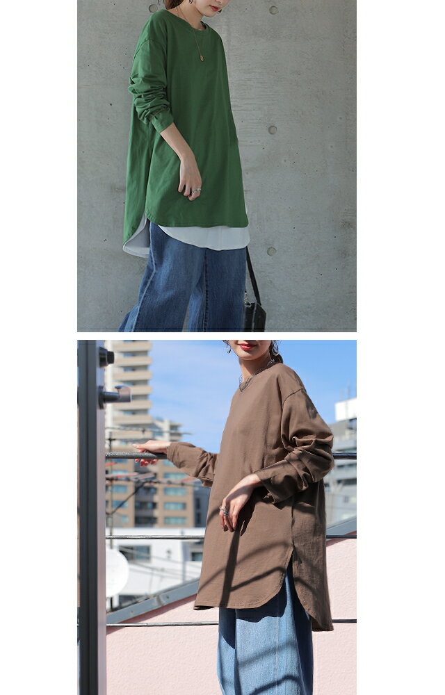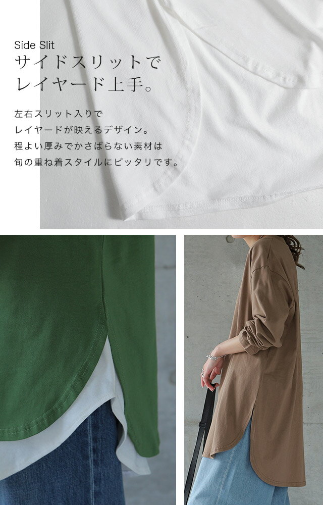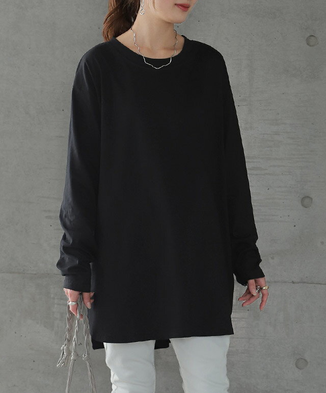 「 お尻が隠れる・長め丈 」ルーズなロンT トップス カットソー 【即納】 ロンT 長袖 Tシャツ ロング チュニック レイヤード ラウンドカットソー Uネック 無地 クルーネック スリット 体型カバー 大きいサイズ 黒 白 秋 冬 HUG.U