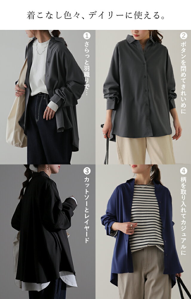 舞う ドレープ オーバー フレア トップス 【即納】 ブラウス レディース 襟 前開き ドロップショルダー 体型カバー 大きいサイズ お尻が隠れる オーバーサイズ 長袖 ドルマン アシメ チュニック きれいめ オフィス ビッグ 無地 黒 秋 冬 HUG.U