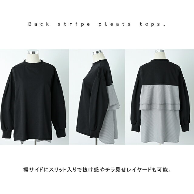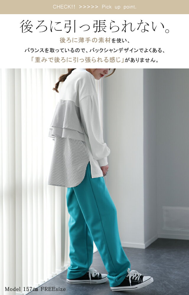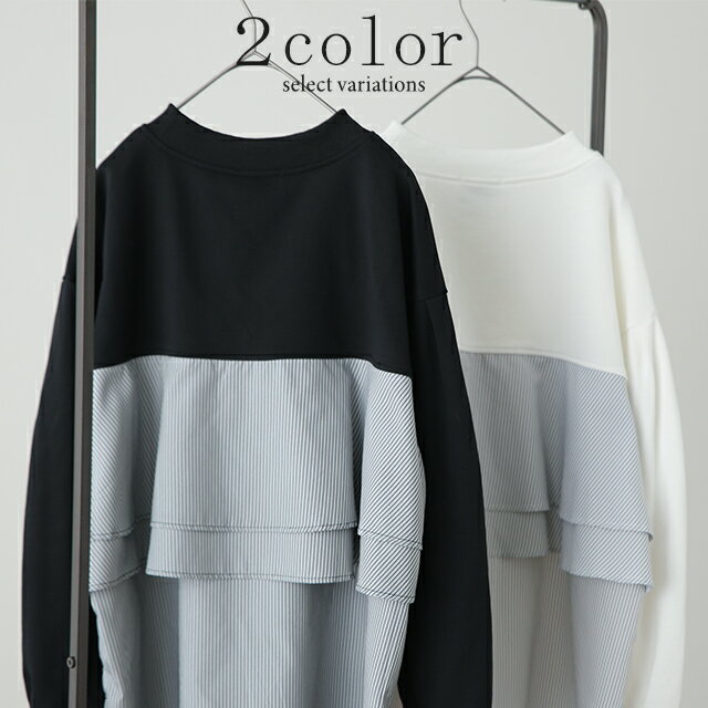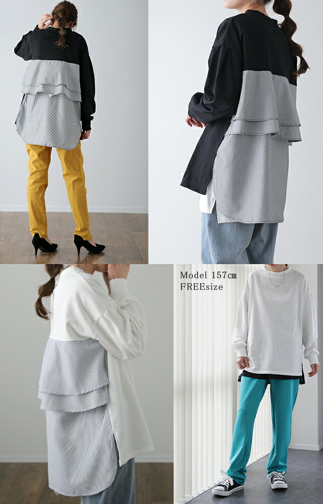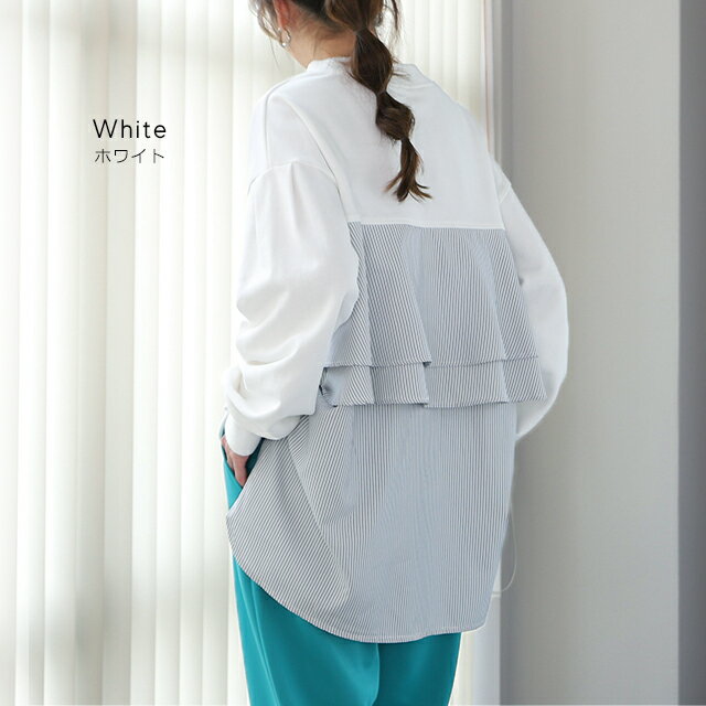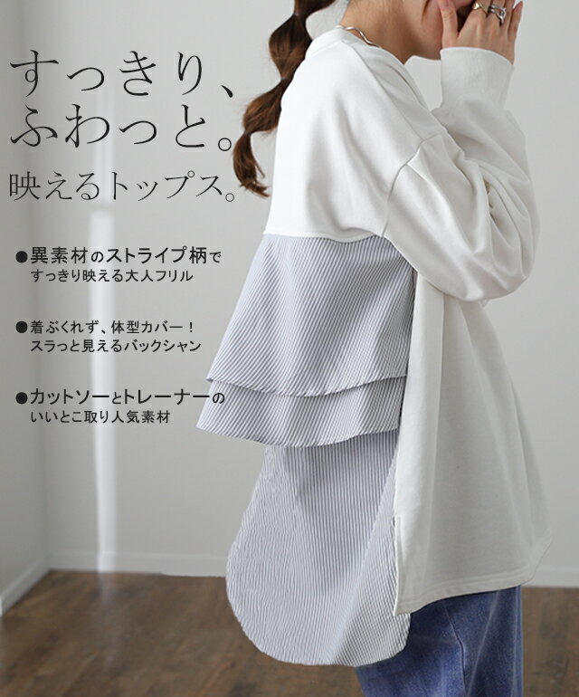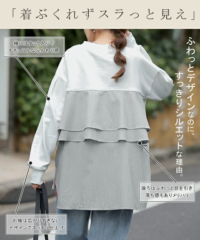 SALE カットソー 「 ふわり* バックフリル 」 トレーナー 【あす楽】 長袖 レディース 切り替え スウェット ストライプ バックシャン スエット 大きいサイズ 体型カバー ブラック ホワイト 黒 白 プルオーバー 配色 お尻が隠れる 秋冬 秋 冬 HUG.U