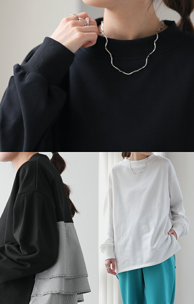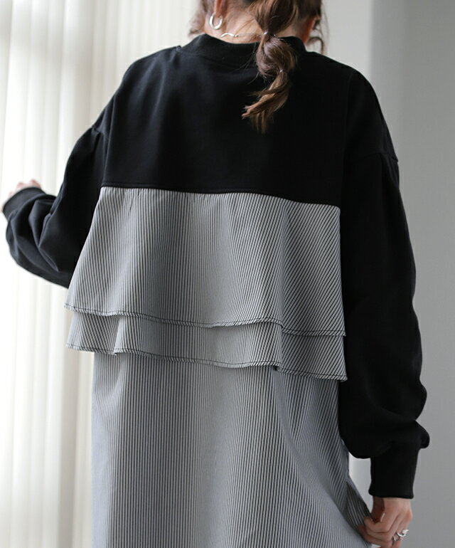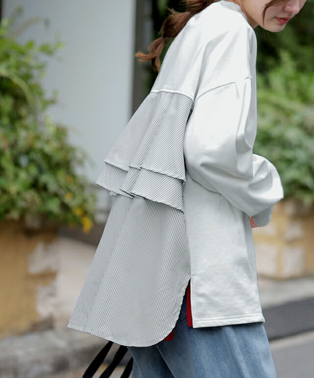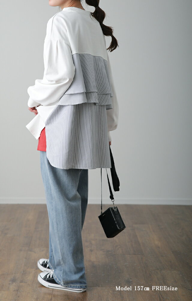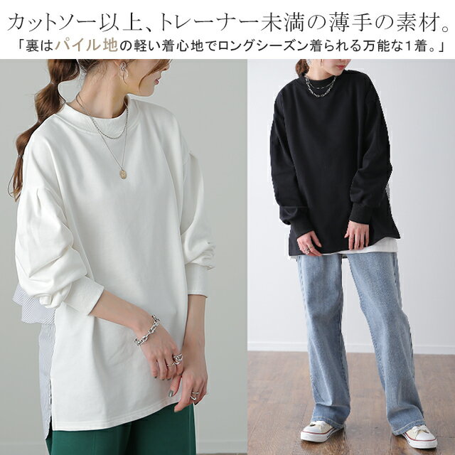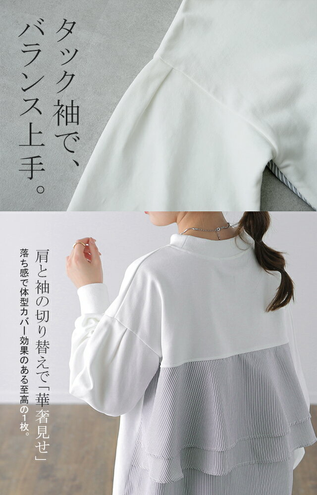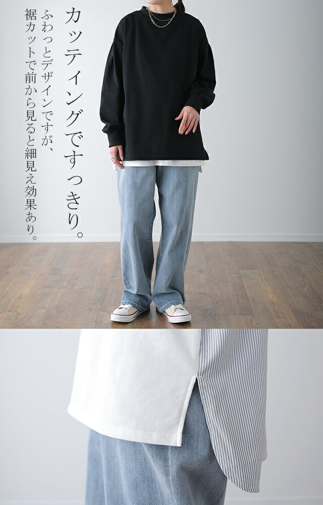 SALE カットソー 「 ふわり* バックフリル 」 トレーナー 【あす楽】 長袖 レディース 切り替え スウェット ストライプ バックシャン スエット 大きいサイズ 体型カバー ブラック ホワイト 黒 白 プルオーバー 配色 お尻が隠れる 秋冬 秋 冬 HUG.U