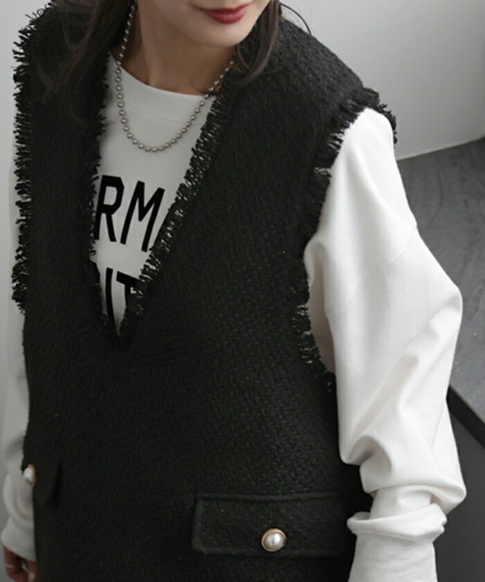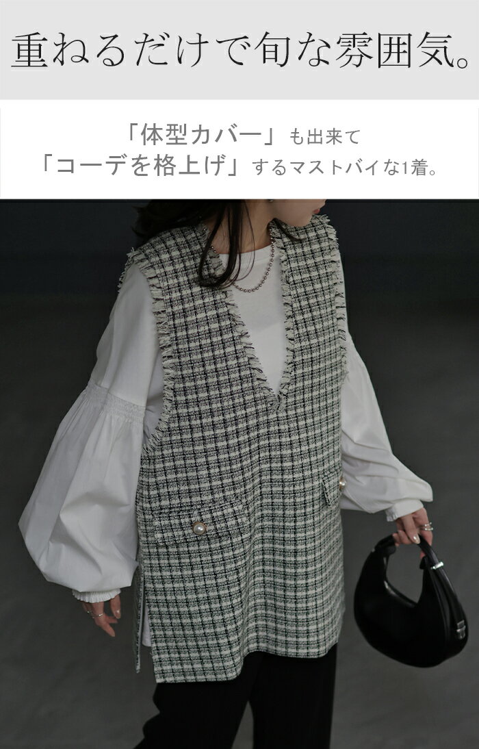 旬。「 お洒落見え 体型カバー 」ツイード ベスト 【あす楽】 チュニック ツイードベスト レディース 深V レイヤード トップス ロング スリット 深Vネック 重ね着 Vネック お洒落 袖なし お尻が隠れる キレイめ ジレ ビッグ 黒 ブラック 大きいサイズ 春 夏 HUG.U