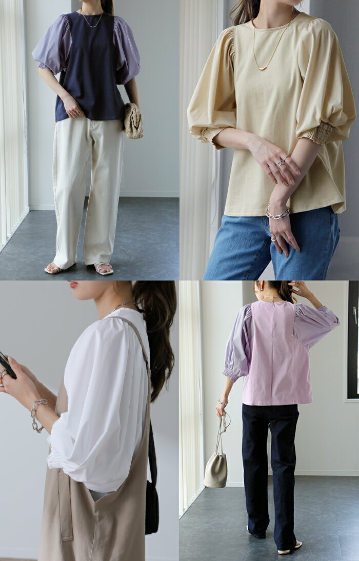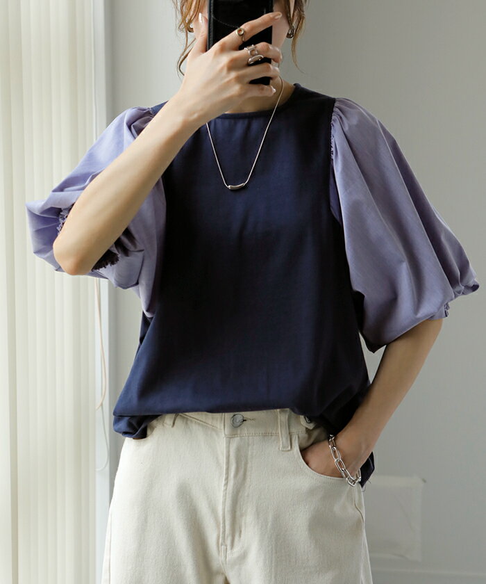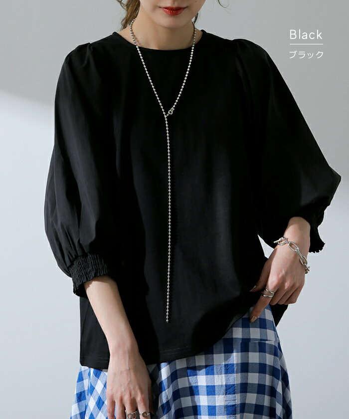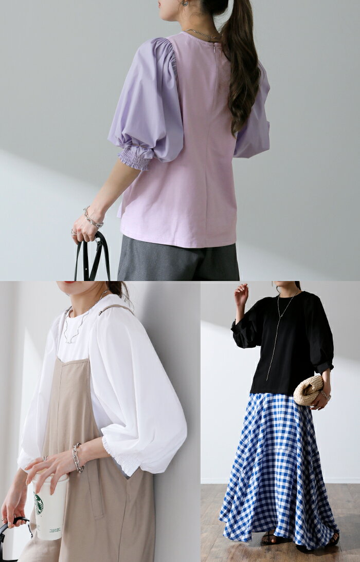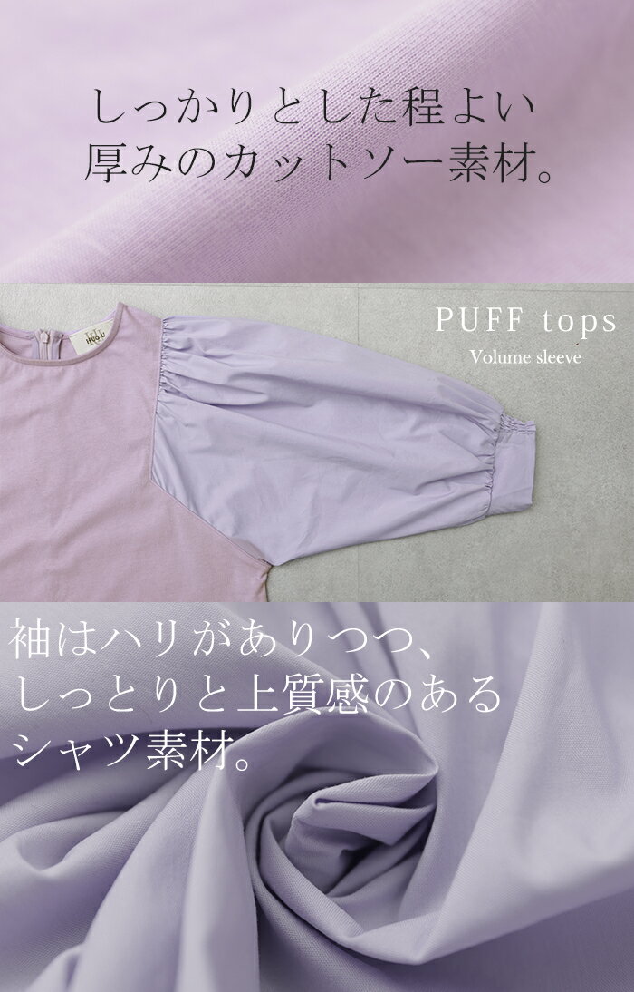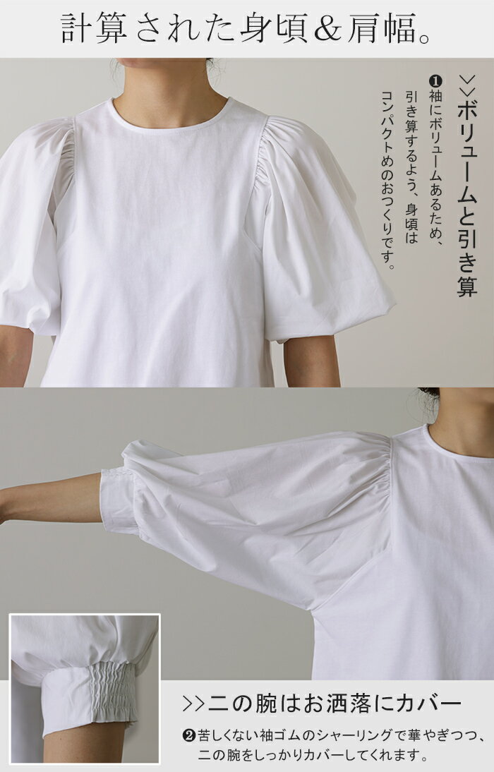 Tシャツ感覚「 パフ T 」 ■一部7月上旬入荷 袖 ぽわん ドッキング カットソー ブラウス 重ね着 レイヤード 半袖 ティーシャツ パフスリーブ バルーンスリーブ トップス レディース きれいめ シンプル 体型カバー ボリューム 白 黒 シャツ 春 夏 HUG.U
