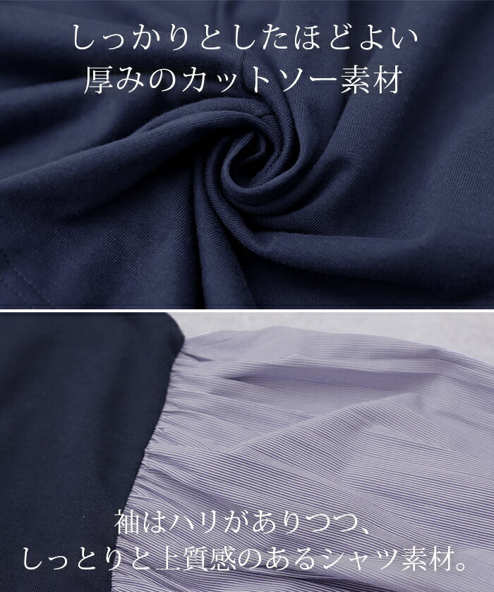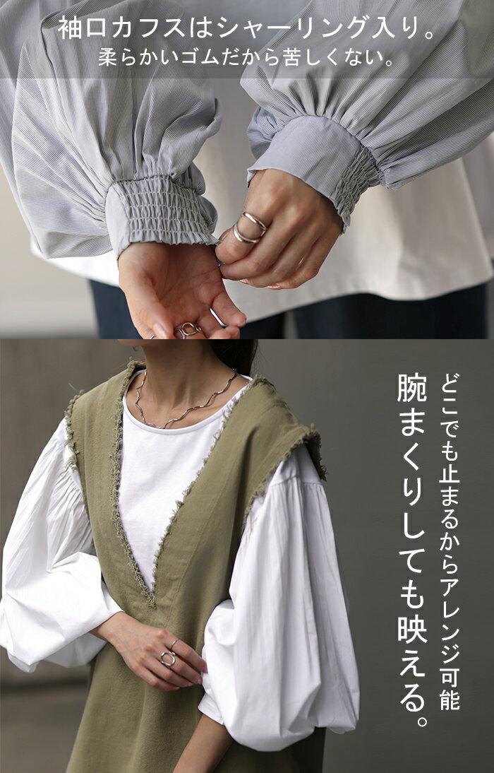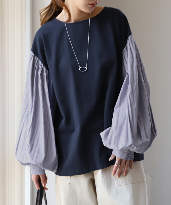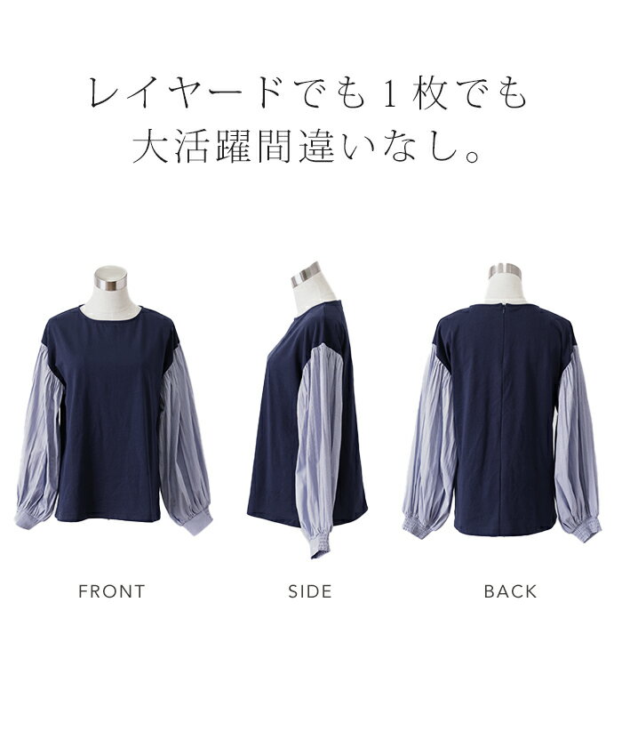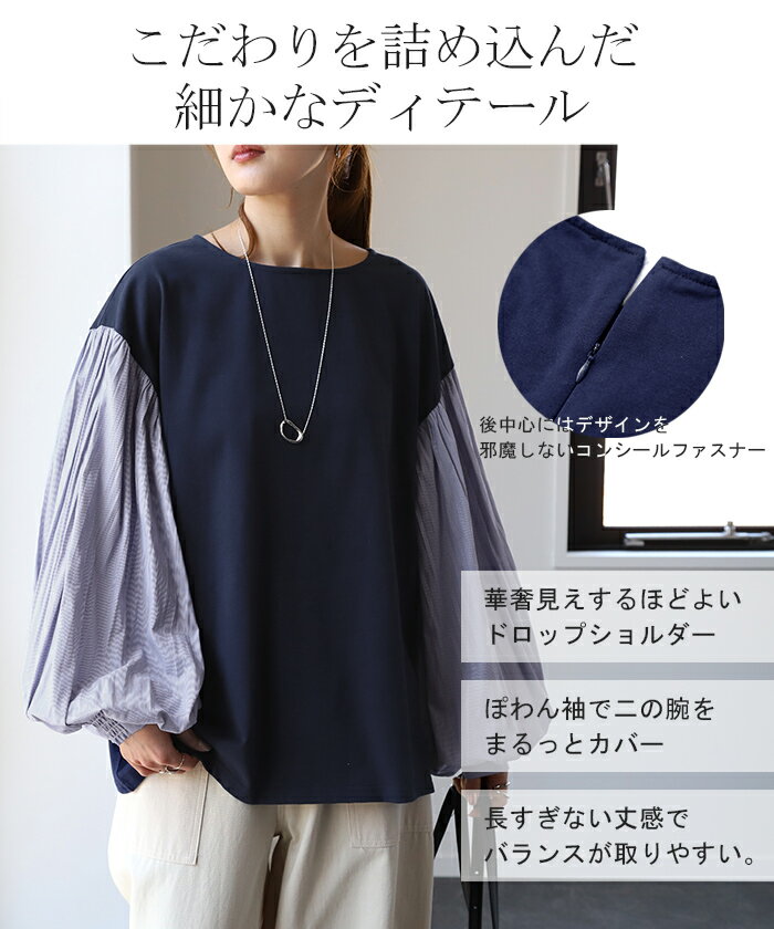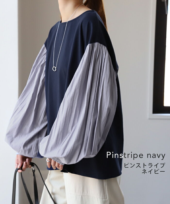 重ねても。一枚でも「 ぽわん袖 × プリーツ 」 ■一部9月下旬入荷 ドッキング トップス プルオーバー レディース カットソー ロンT シャツ ブラウス バルーン 長袖 ボリュームスリーブ ギャザー 異素材 大きいサイズ 体型カバー きれいめ 黒 白 ストライプ 秋 冬 HUG.U