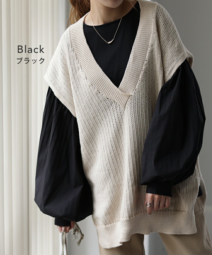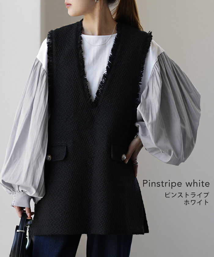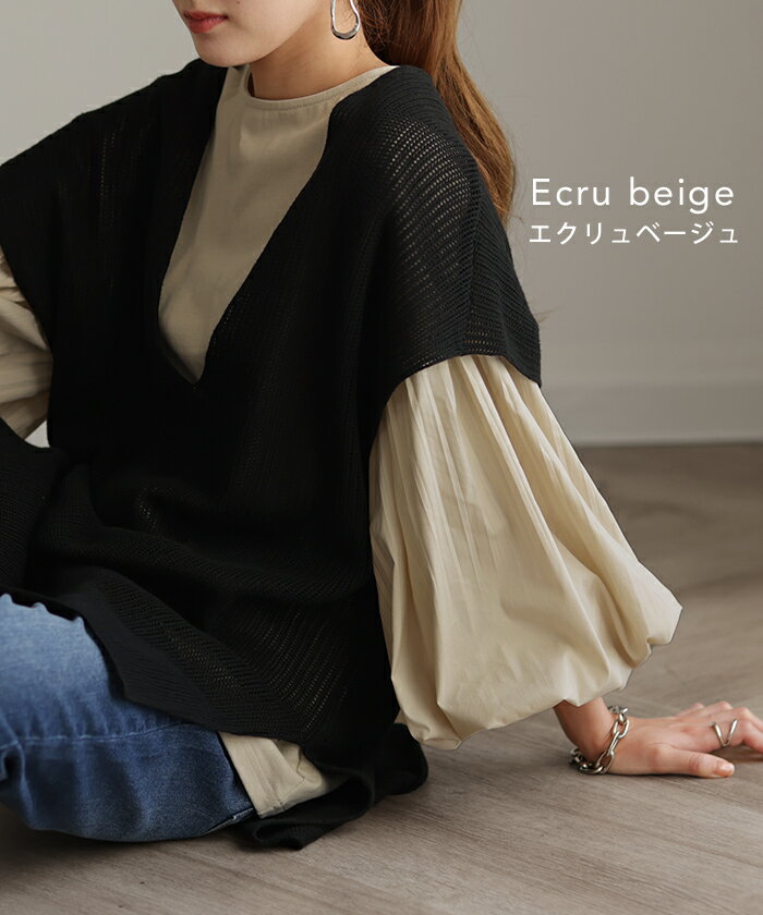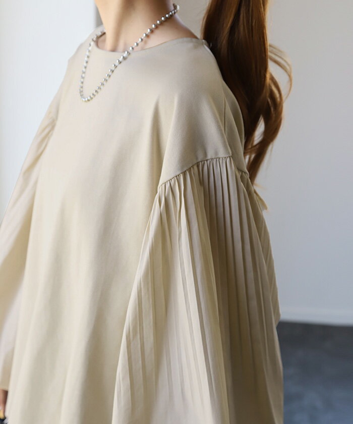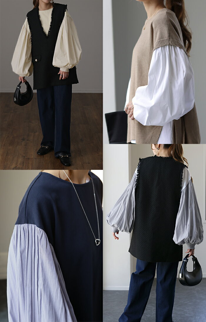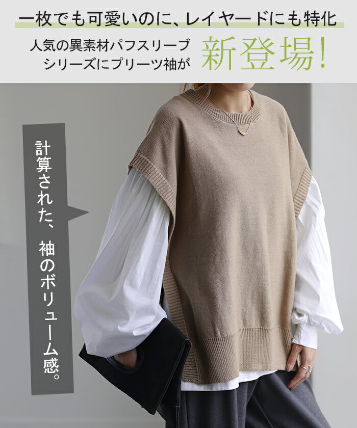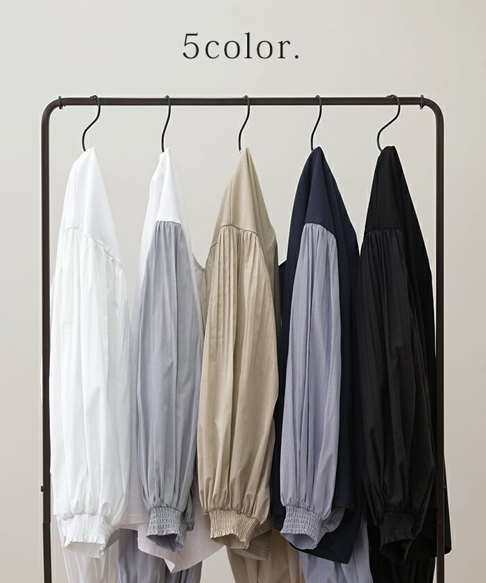 重ねても。一枚でも「 ぽわん袖 × プリーツ 」 ■一部9月下旬入荷 ドッキング トップス プルオーバー レディース カットソー ロンT シャツ ブラウス バルーン 長袖 ボリュームスリーブ ギャザー 異素材 大きいサイズ 体型カバー きれいめ 黒 白 ストライプ 秋 冬 HUG.U