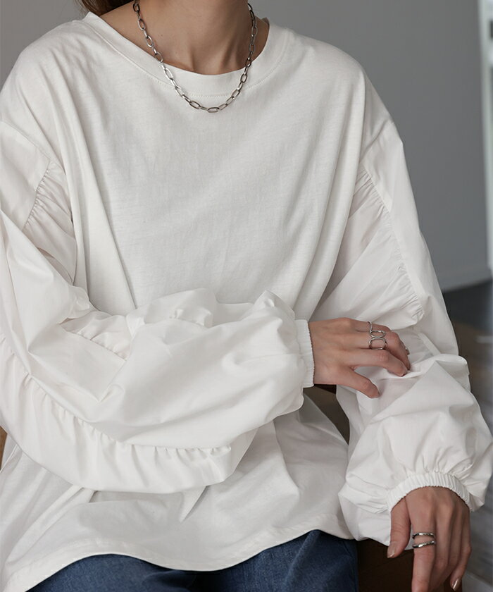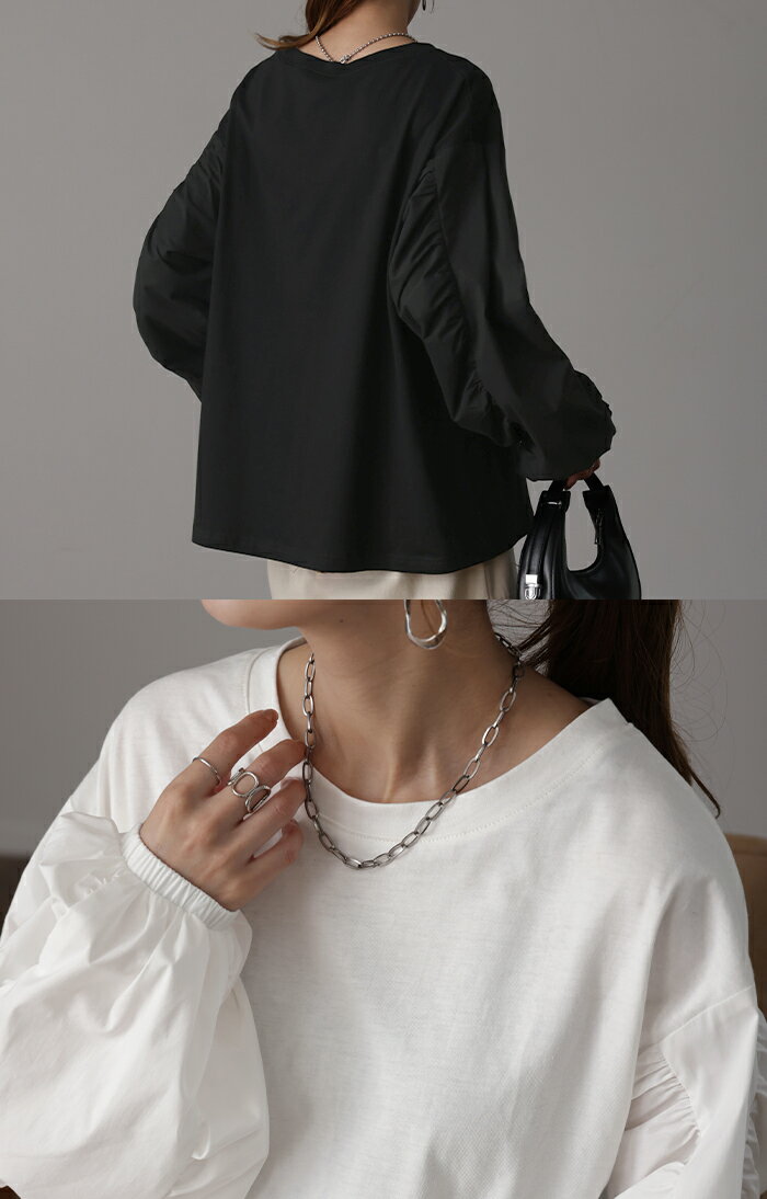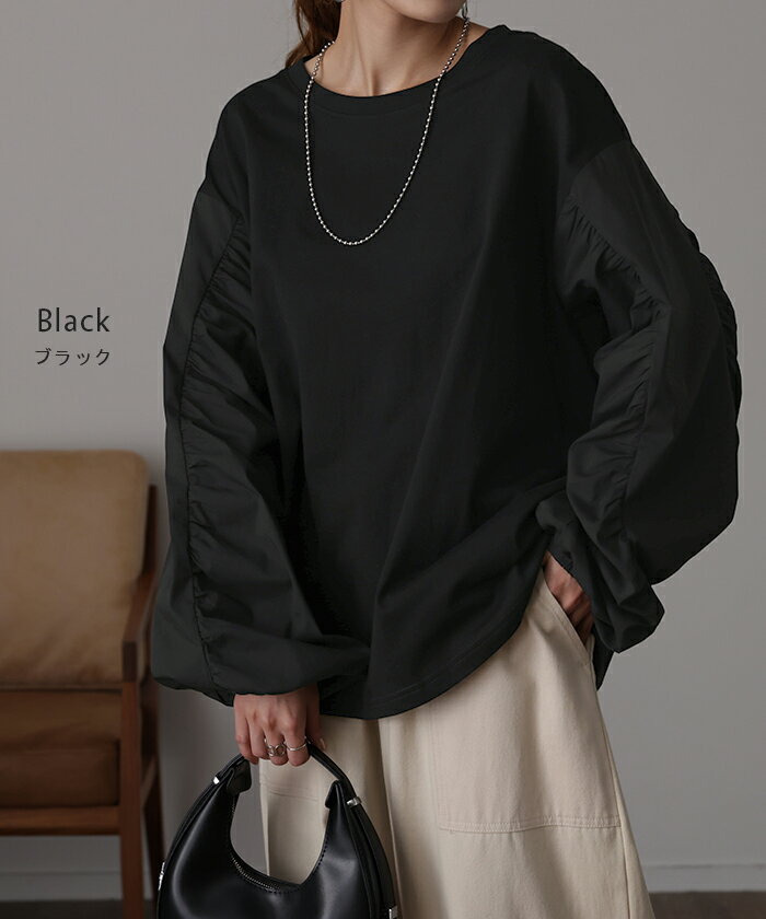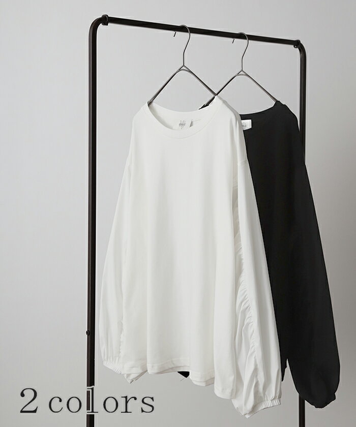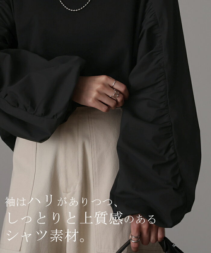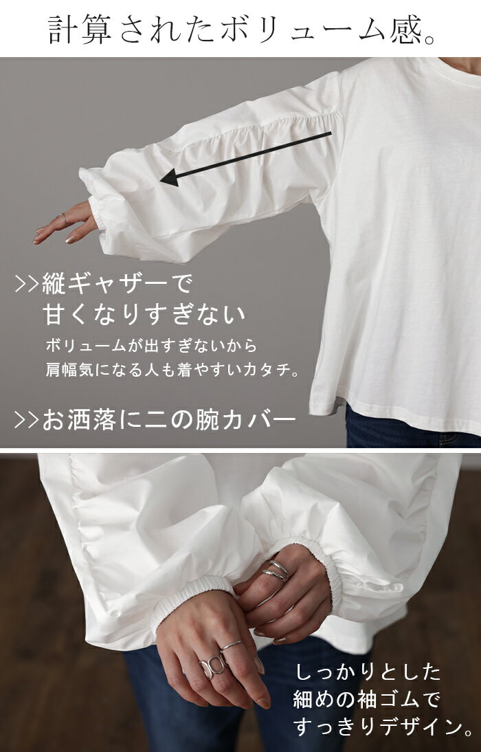 甘さ控えめ『 縦 ギャザー。』 カットソー ドッキング 【即納】 ブラウス 重ね着 レイヤード ロング Tシャツ ロンT パフスリーブ バルーンスリーブトップス レディース お尻が隠れる 体型カバー ボリューム シンプル 白 黒 シャツ 大きいサイズ 秋 冬 HUG.U