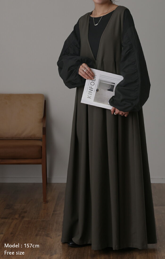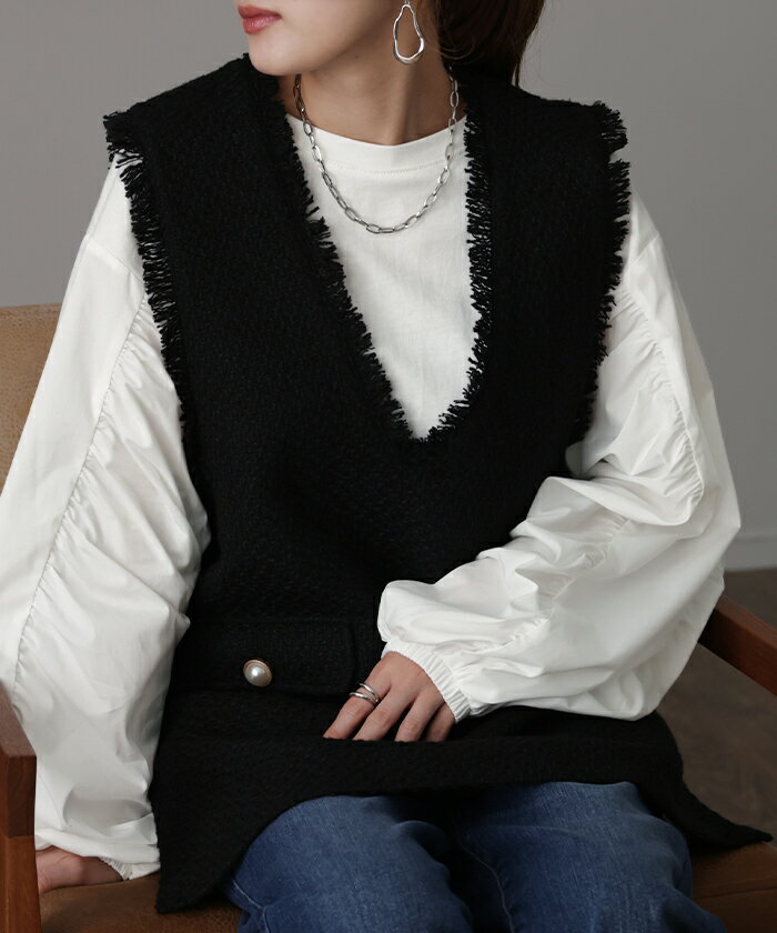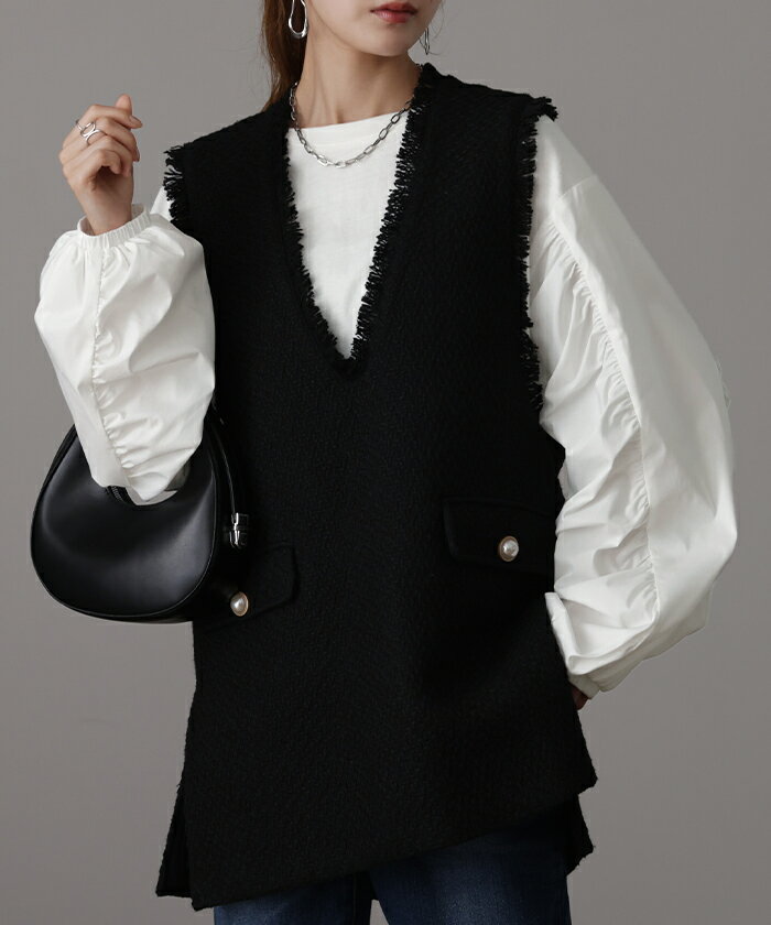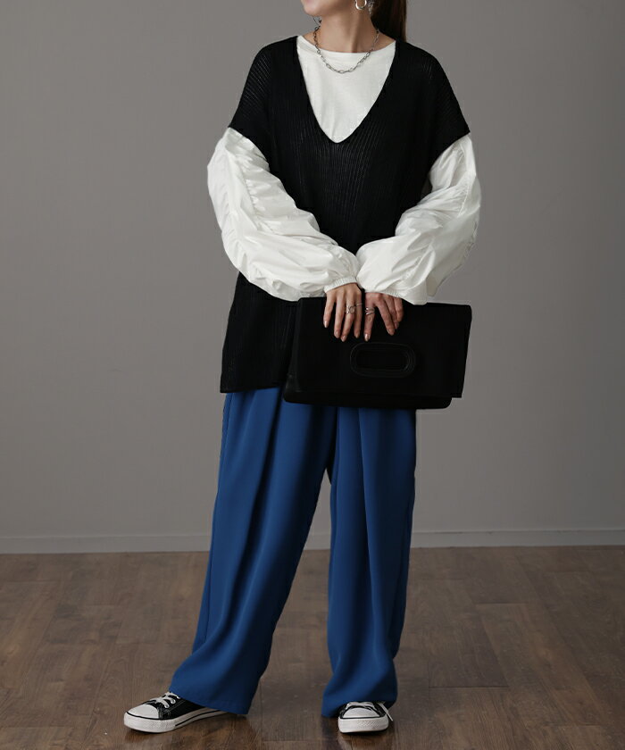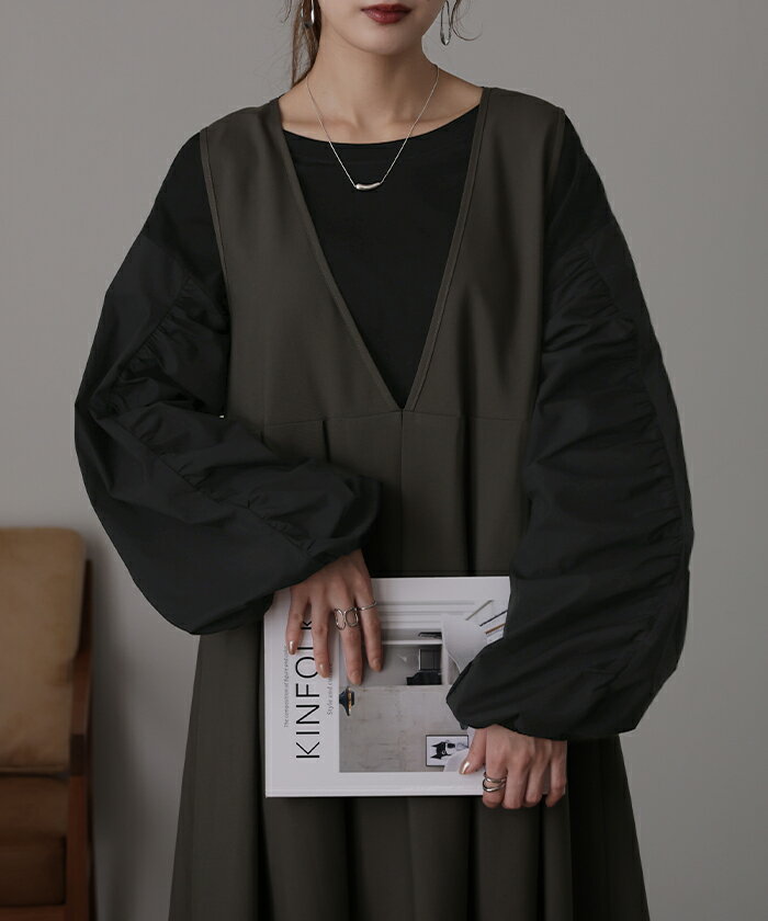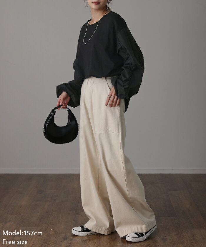 甘さ控えめ『 縦 ギャザー。』 カットソー ドッキング 【即納】 ブラウス 重ね着 レイヤード ロング Tシャツ ロンT パフスリーブ バルーンスリーブトップス レディース お尻が隠れる 体型カバー ボリューム シンプル 白 黒 シャツ 大きいサイズ 秋 冬 HUG.U