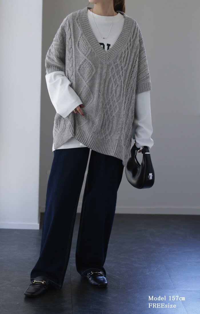 今っぽ 体型カバー 「 お洒落 に隠す。」 ニット ベスト 【あす楽】 レディース 深V ケーブル レイヤード ニットベスト トップス セーター チュニック 二の腕カバー ロング 重ね着 お尻が隠れる ケーブルニット 大きいサイズ 春 夏 HUG.U