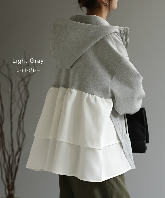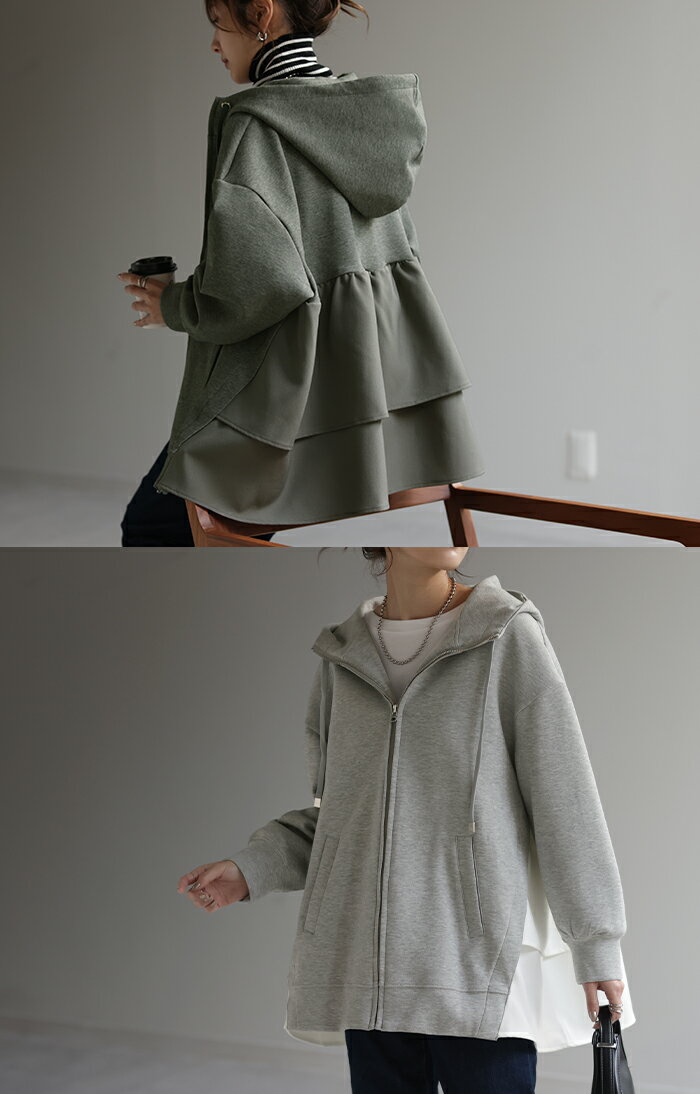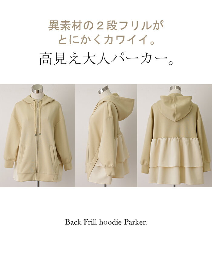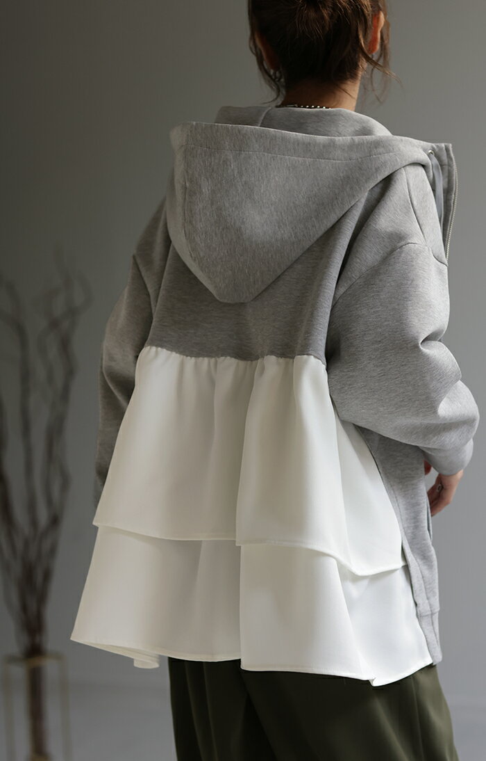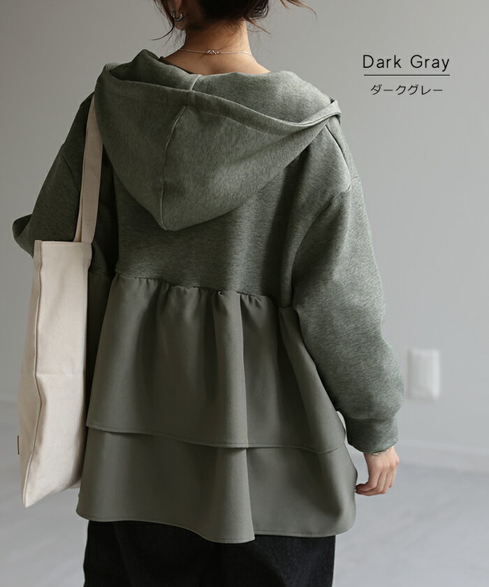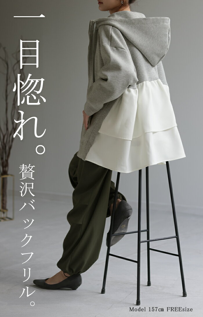 ト・リ・コ 「 大人可愛い。」 バックフリル パーカー 【あす楽】 アウター レディース ライトアウター ロング トップス トレーナー フーディー 無地 羽織 体型カバー フリル バックプリーツ プリーツ ドルマン ゆったり 変形 大きいサイズ グレー 春 夏 HUG.U