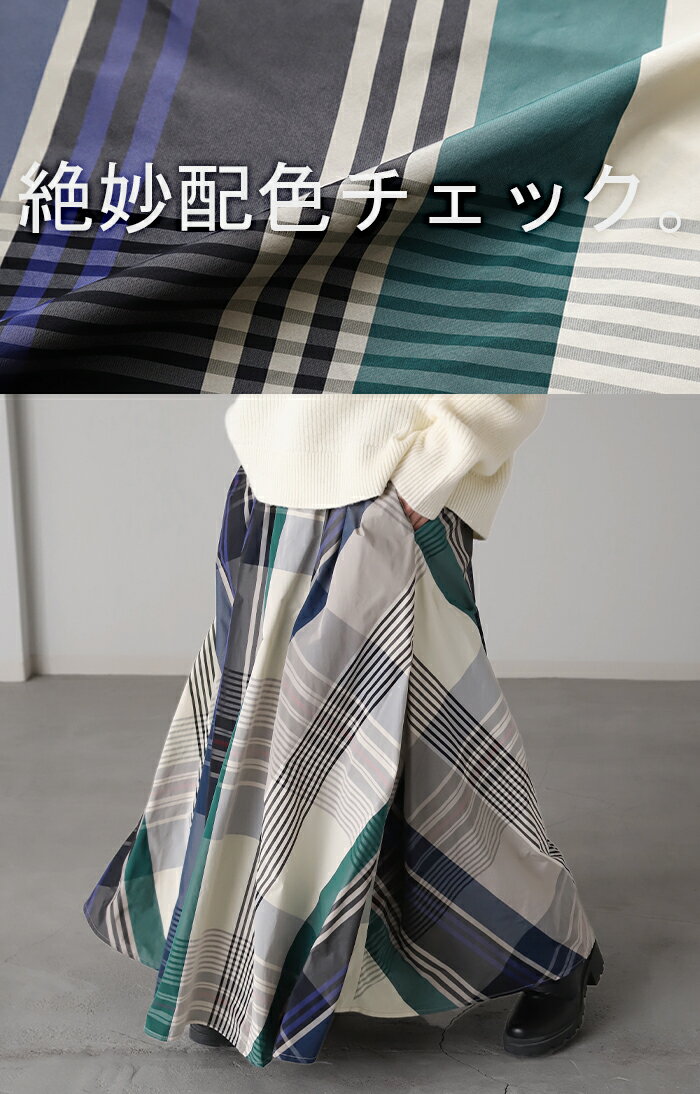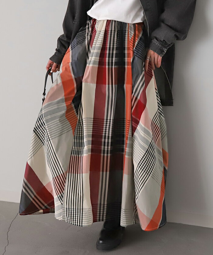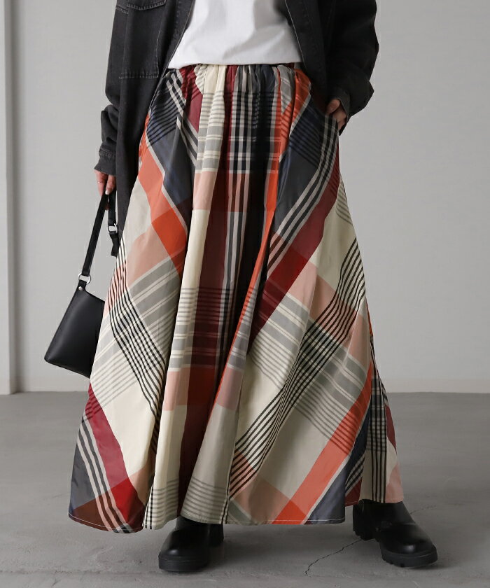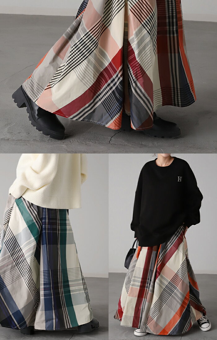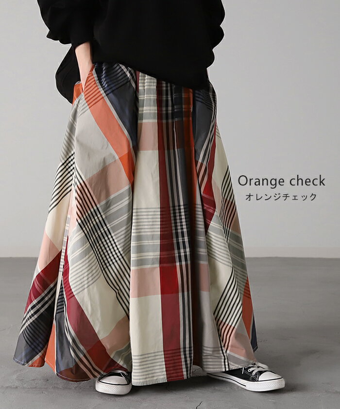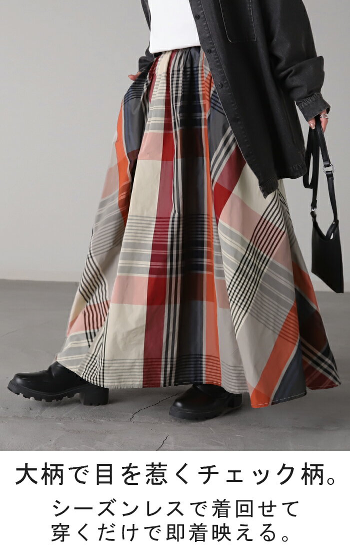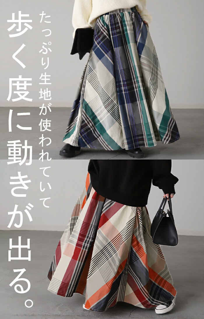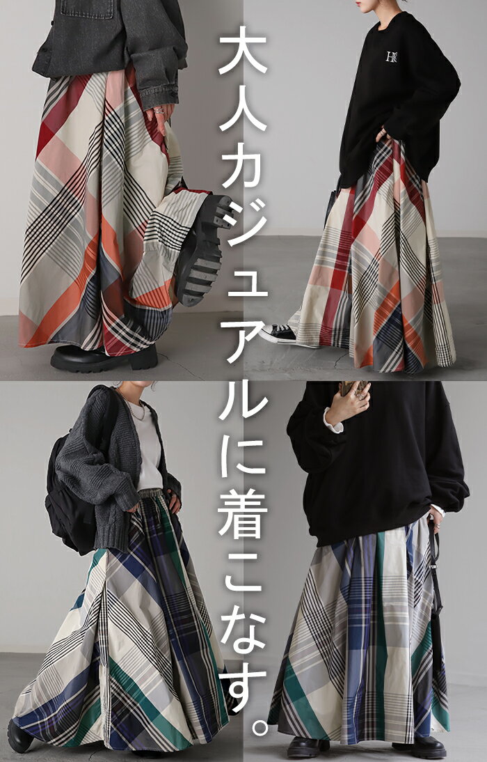 ボリューム 『 お洒落 チェック 』 【あす楽】 配色チェック スカート ロングスカート フレア Aライン レディース チェック柄 ボトムス フレアスカート 柄 おしゃれ 薄手 ゴム ロング マキシ ナチュラル マキシスカート 体型カバー きれいめ 赤 白 秋 冬 HUG.U