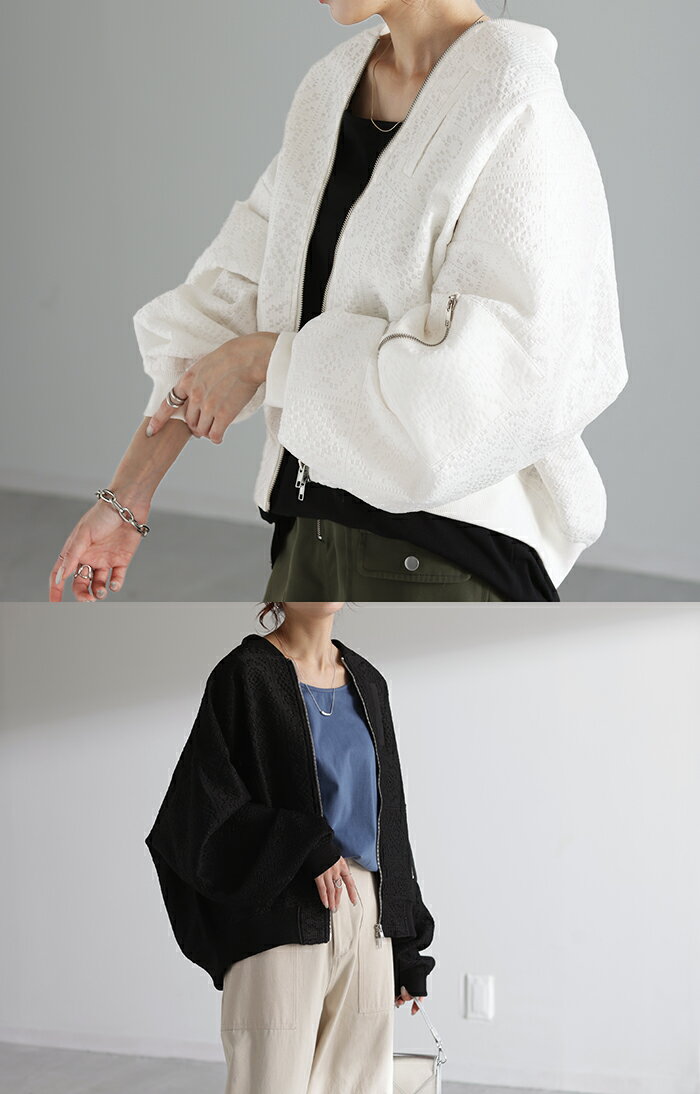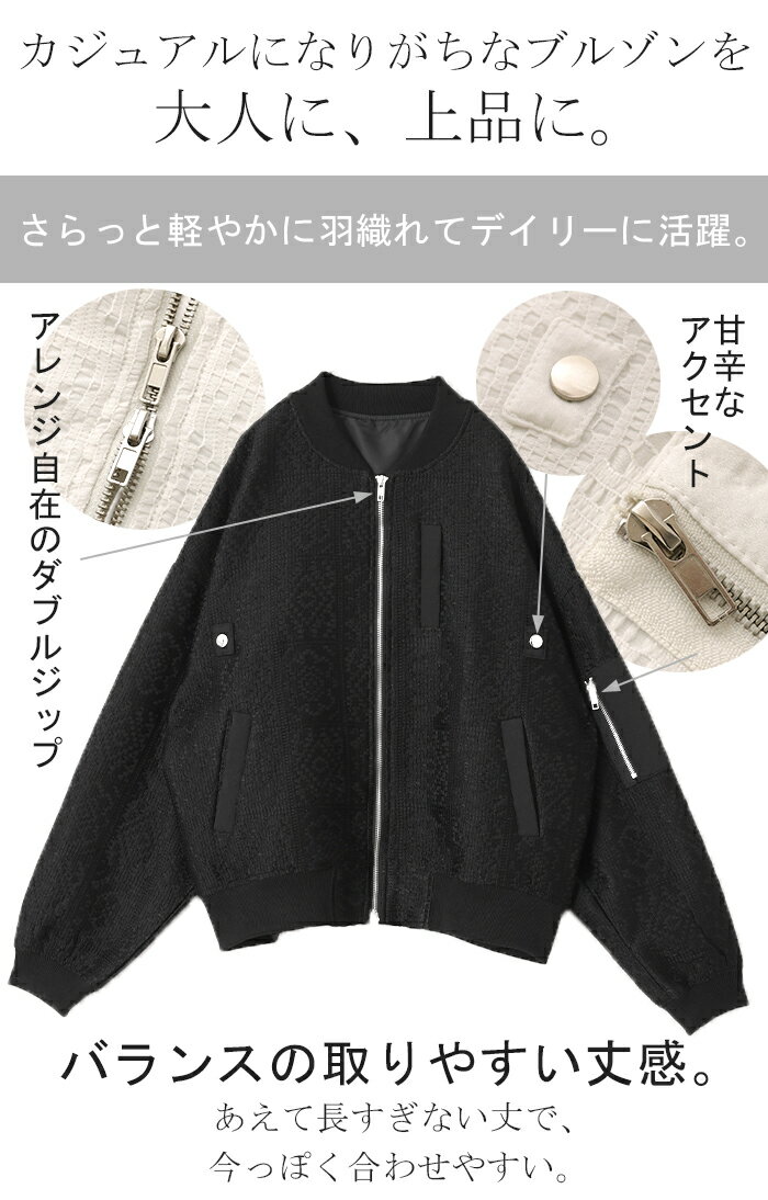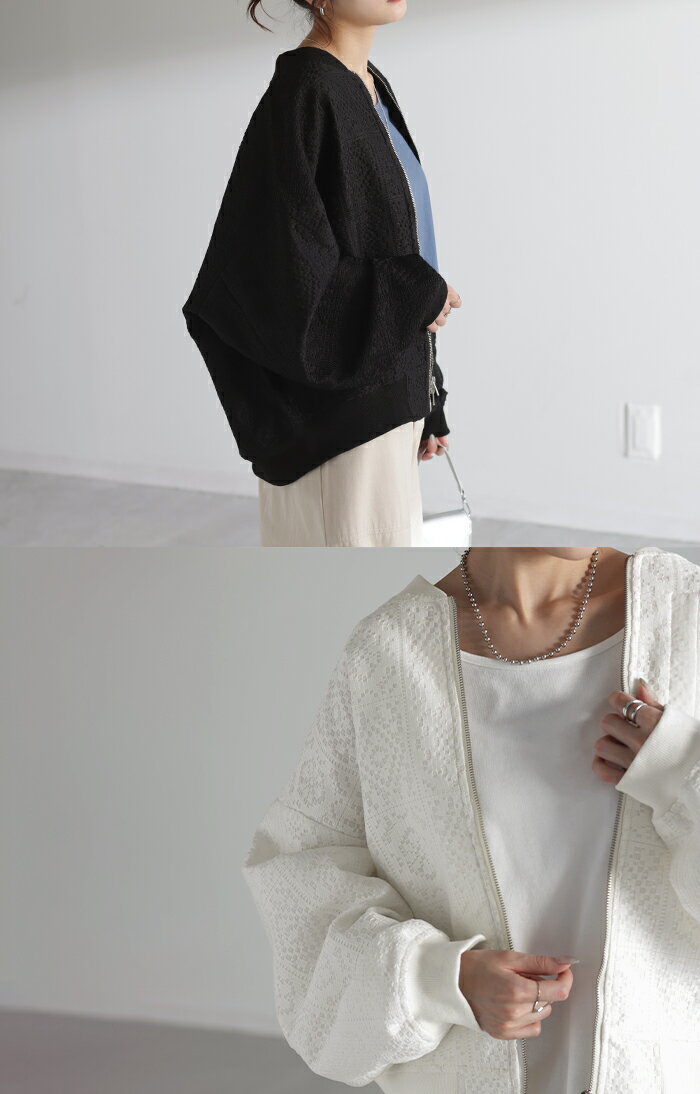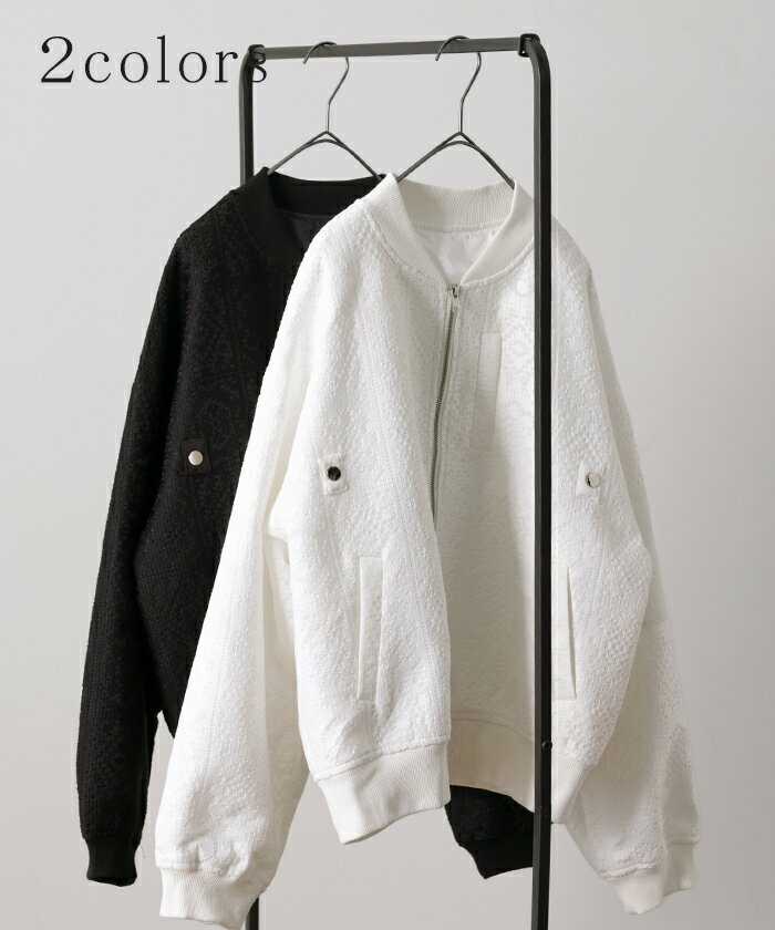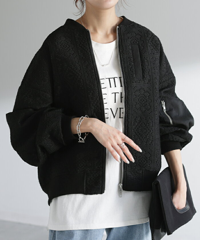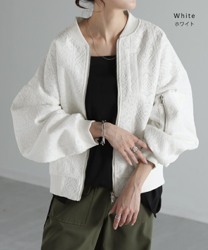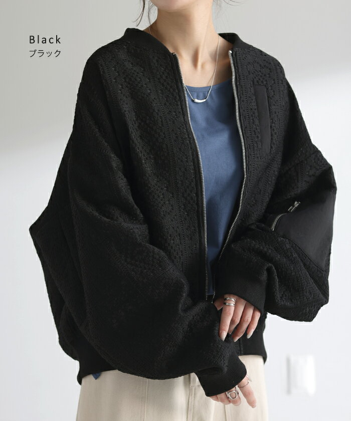 ブルゾン レース 甘辛MIX レディース 【あす楽】 アウター ジャンパー MA-1 ライトアウター 羽織 ドルマン 体型カバー ゆったり きれいめ 長袖 ロング ノーカラー 軽い 大きいサイズ オフィスカジュアル 大人 MA1 上品 お洒落 春 夏 白 黒 HUG.U