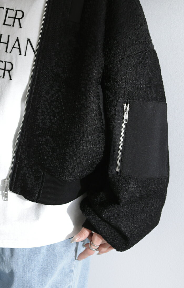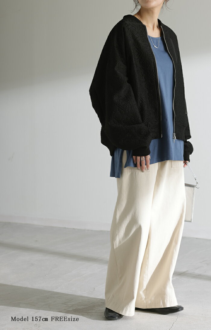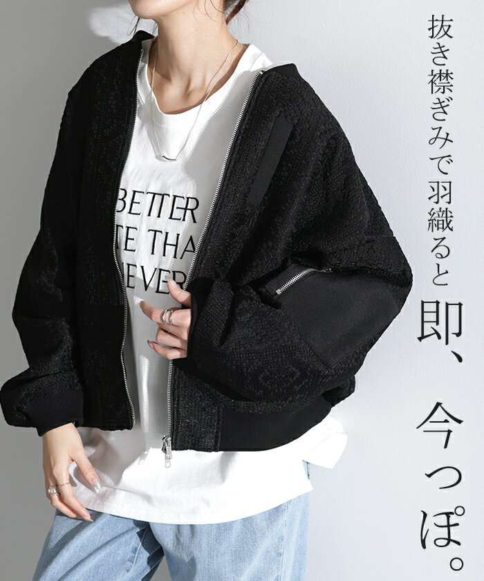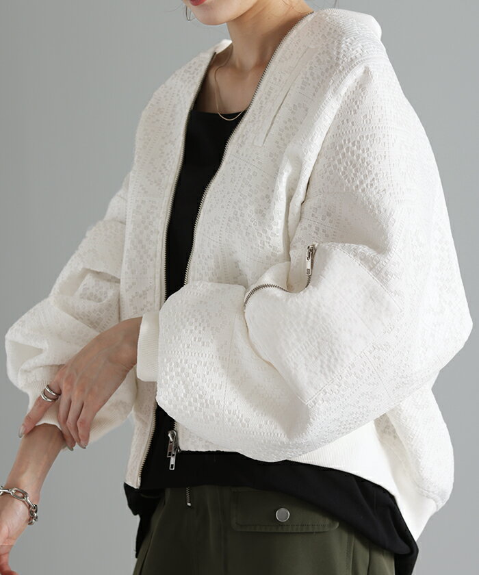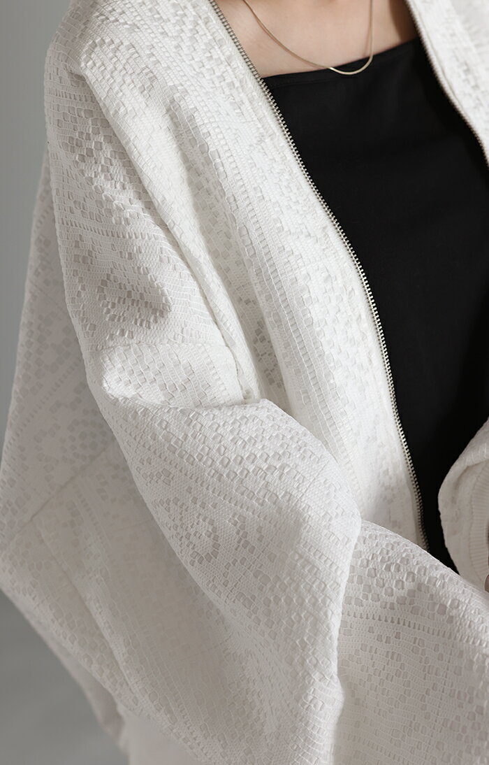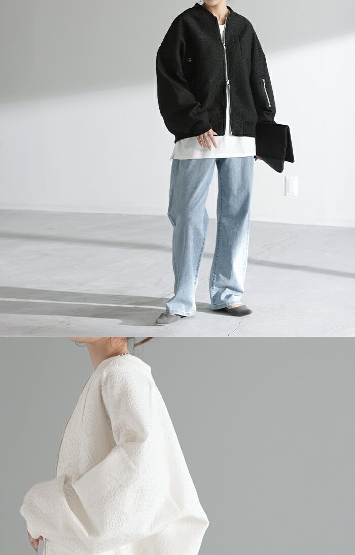 ブルゾン レース 甘辛MIX レディース 【あす楽】 アウター ジャンパー MA-1 ライトアウター 羽織 ドルマン 体型カバー ゆったり きれいめ 長袖 ロング ノーカラー 軽い 大きいサイズ オフィスカジュアル 大人 MA1 上品 お洒落 春 夏 白 黒 HUG.U