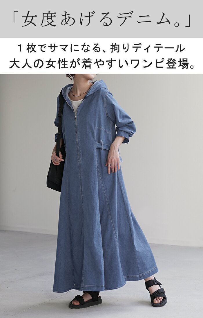 ワンピ デニム タイト目 ワンピース 【即納】 ハーフジップ デニムワンピ デニムワンピース ロングワンピース レディース フーディー パーカー ロング ロングワンピ マキシ Aライン 長袖 薄手 フード パーカーワンピース パーカーワンピ ジップ 黒 秋 冬 HUG.U