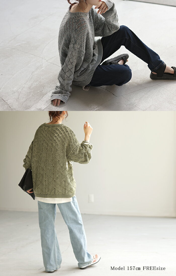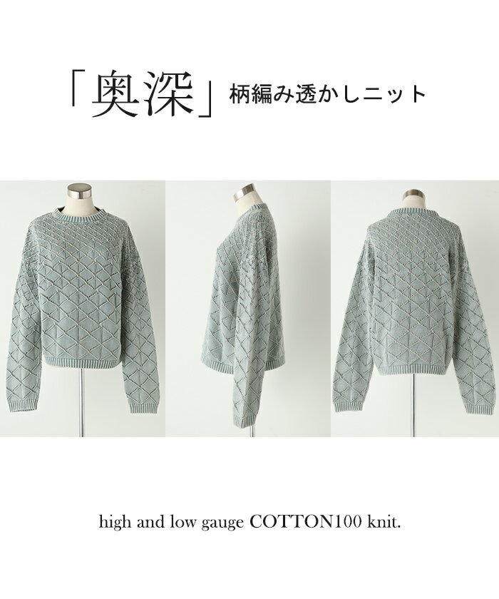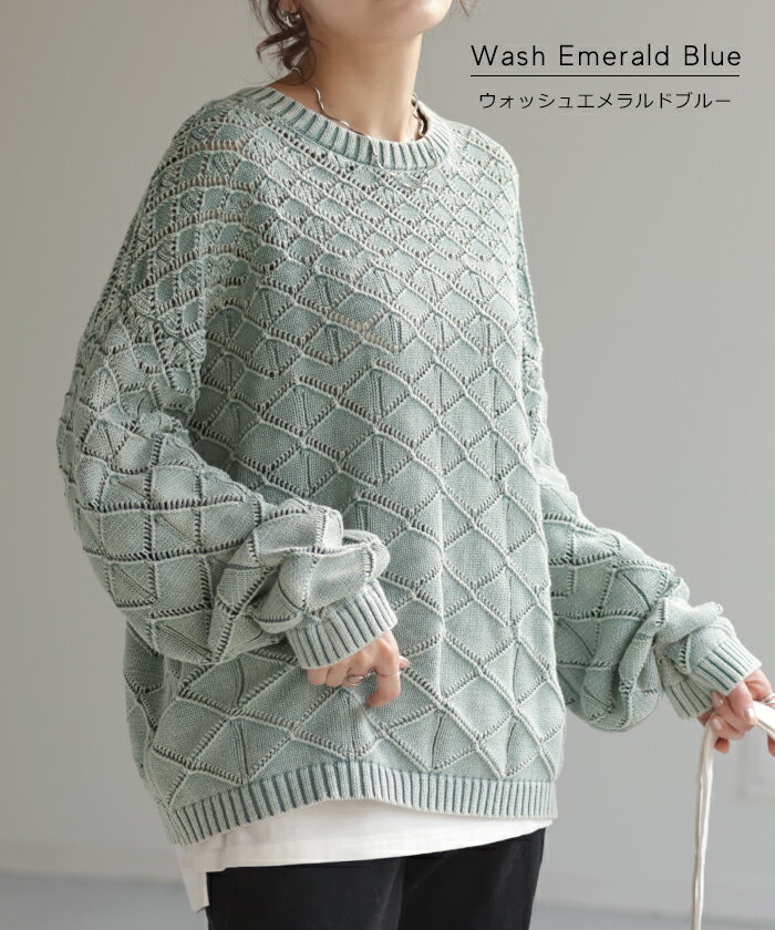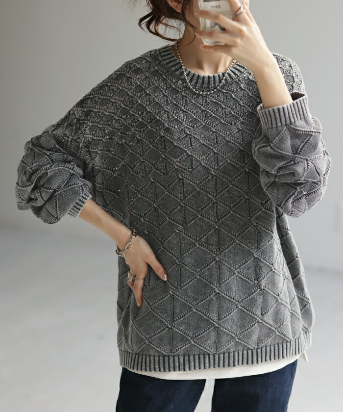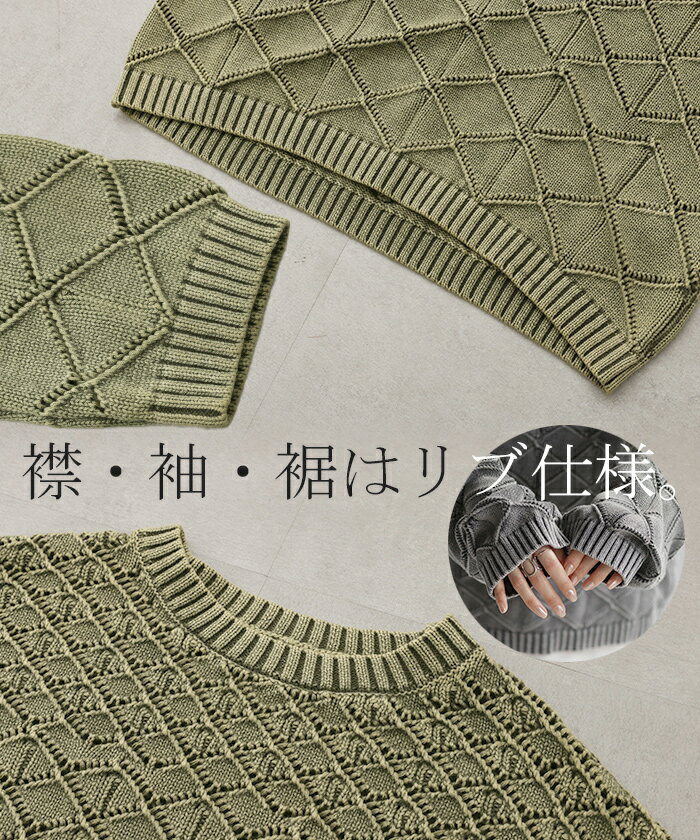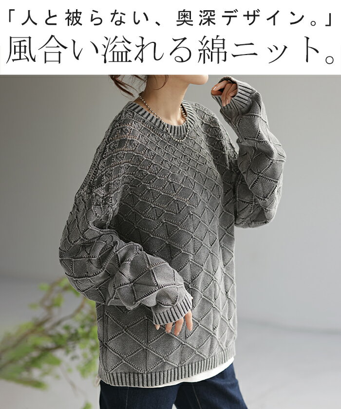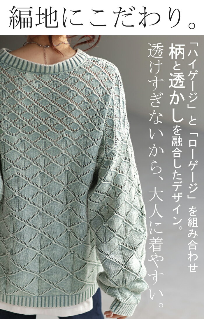 ニット 透かし編み トップス レディース 【即納】 プルオーバー 春ニット セーター 幾何学模様 体型カバー 長袖 二の腕カバー レイヤード ロング Uネック 格子柄 チェック 模様 リブ ゆったり 綿 ヴィンテージ風 大きいサイズ 黒 グレー 青 春 夏 HUG.U