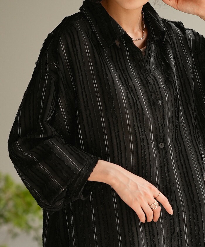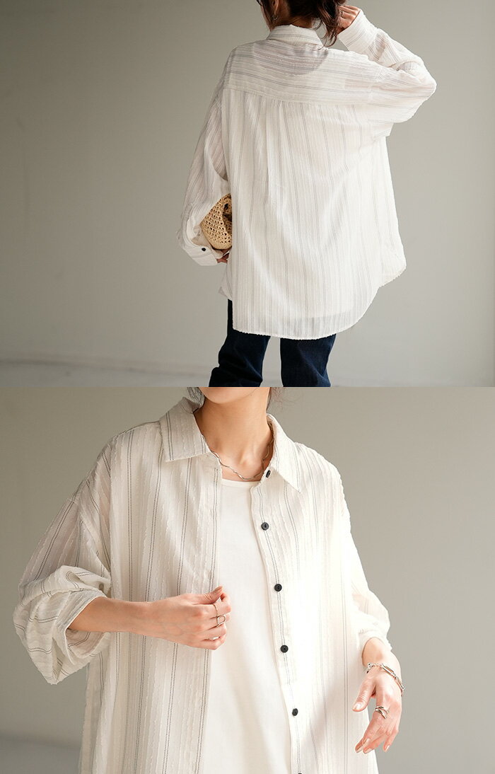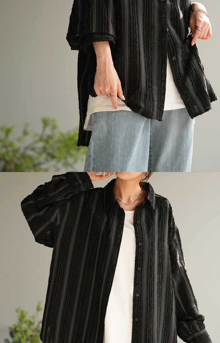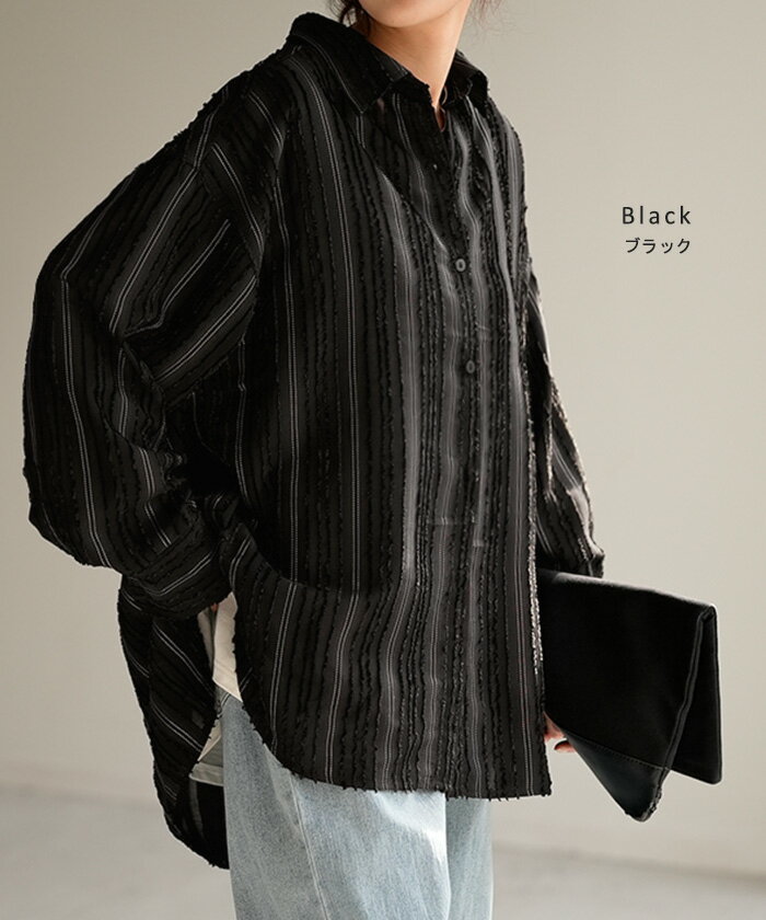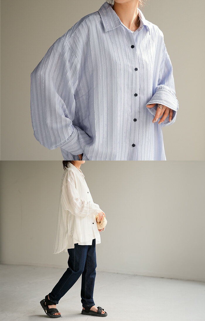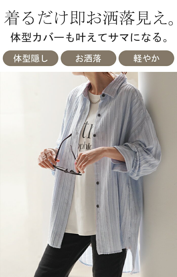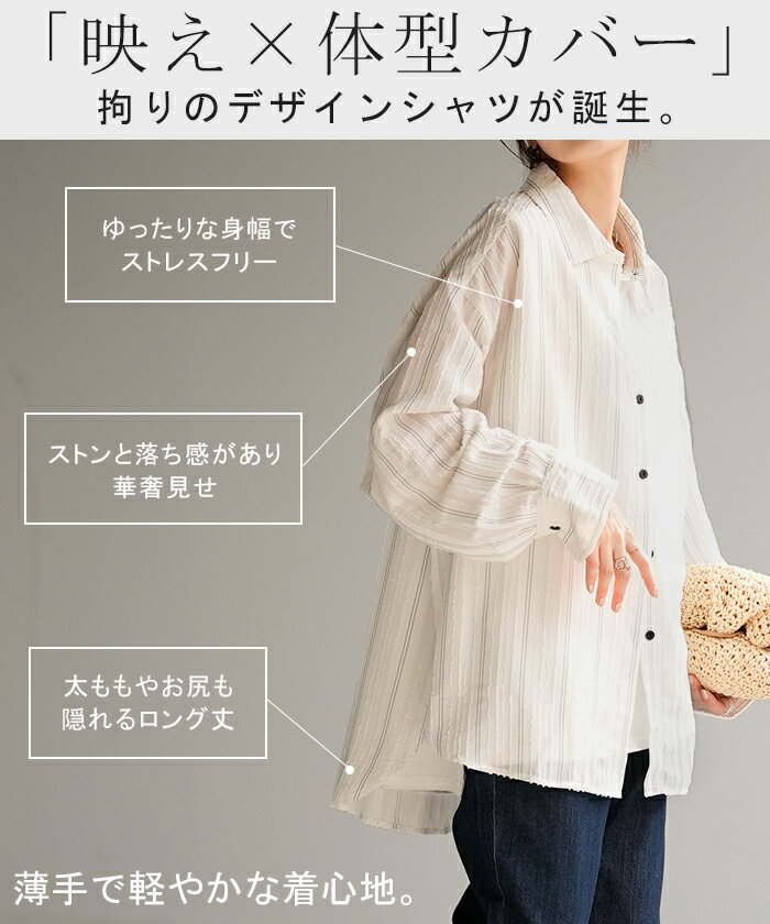 シャツ ストライプ フリンジ 体型カバー シワになりにくい 【即納】 トップス レディース チュニック 長袖 カラーシャツ ストライプシャツ シアー 長い 大きいサイズ ドルマン ロングシャツ ロング ブラウス 重ね着 羽織 オーバーサイズ ビッグ 白 秋 冬 HUG.U