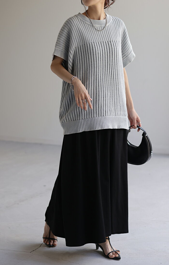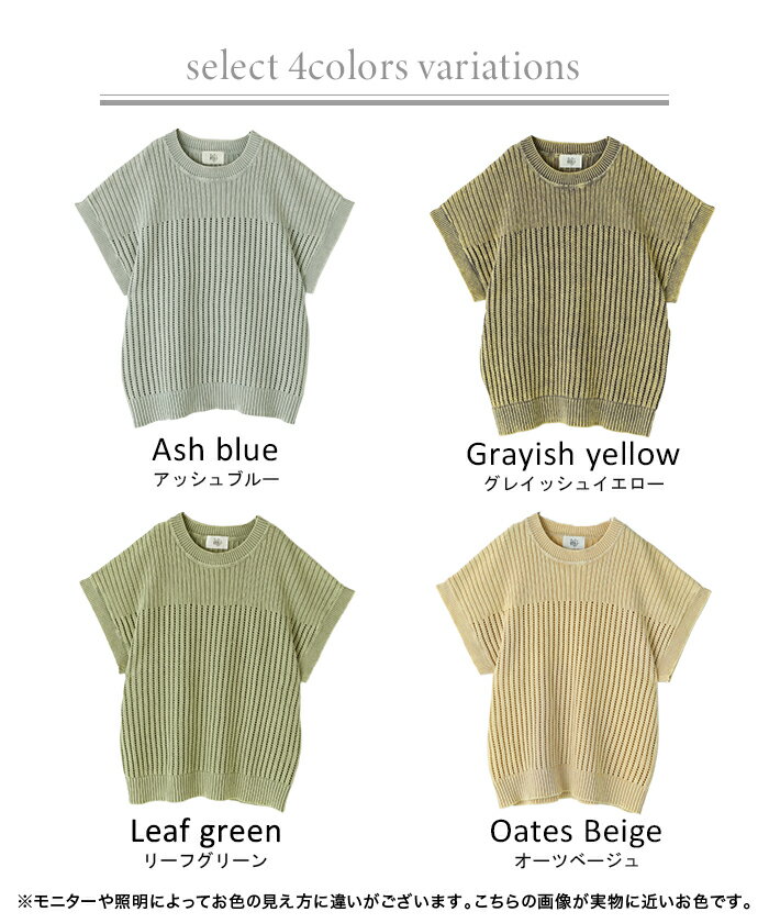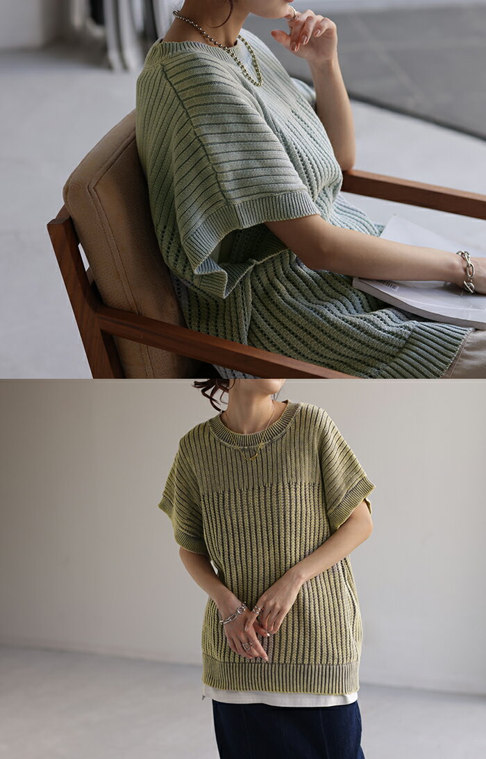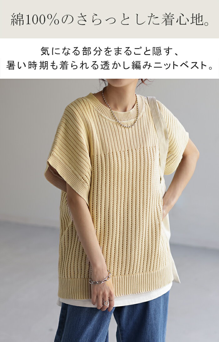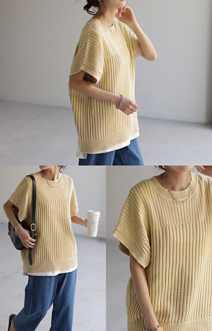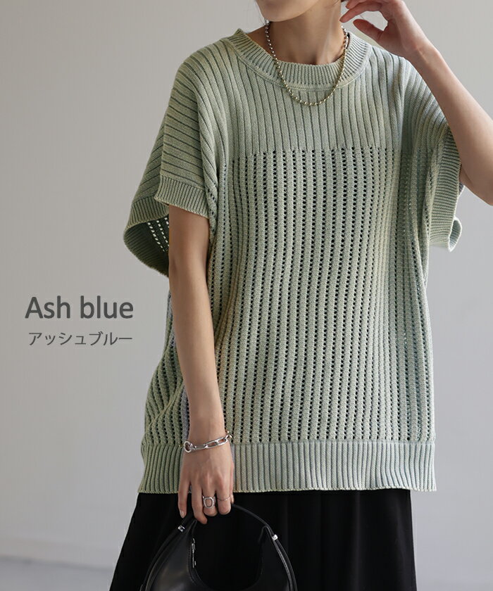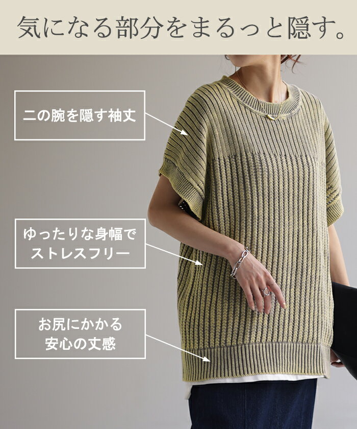 サマーニット 透かし編み ニット 【あす楽】 二の腕カバー レディース トップス Tシャツ コクーン ドルマンスリーブ ニットトップス セーター フレンチスリーブ 丸首 半袖 大きいサイズ ゆったり 変形 ロング 体型カバー お尻が隠れる イエロー 青 春 夏 HUG.U