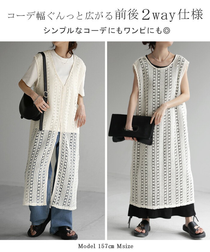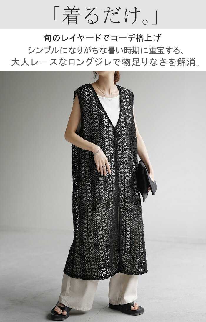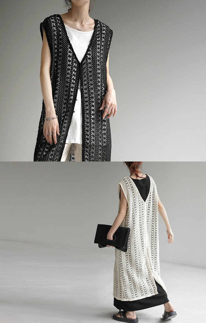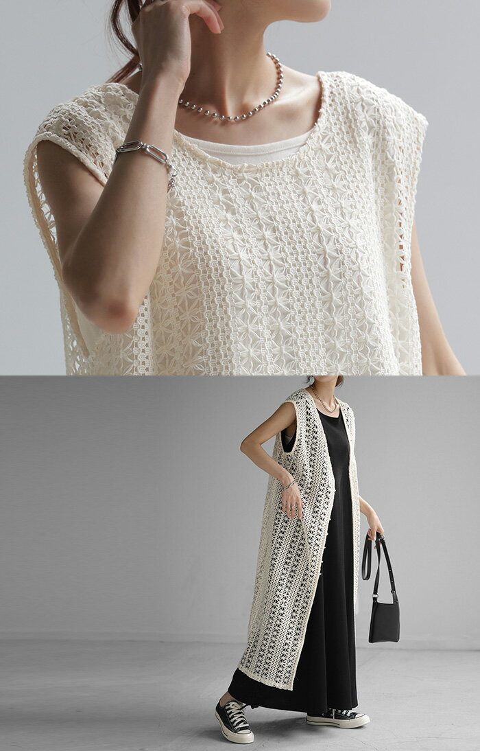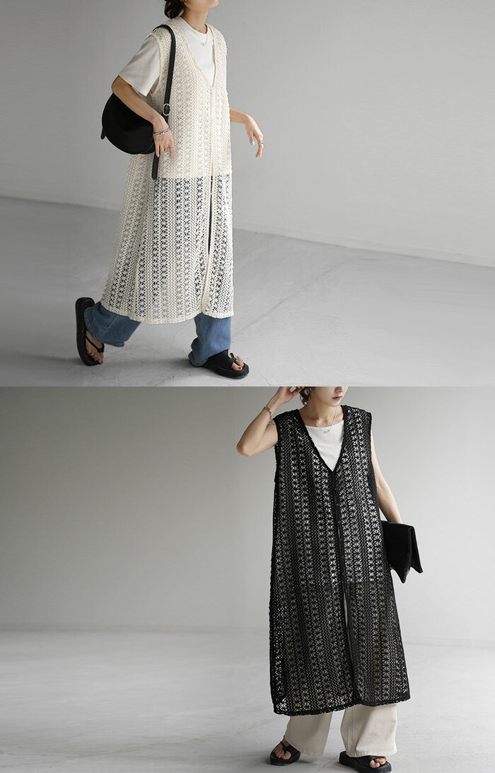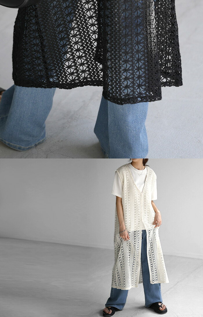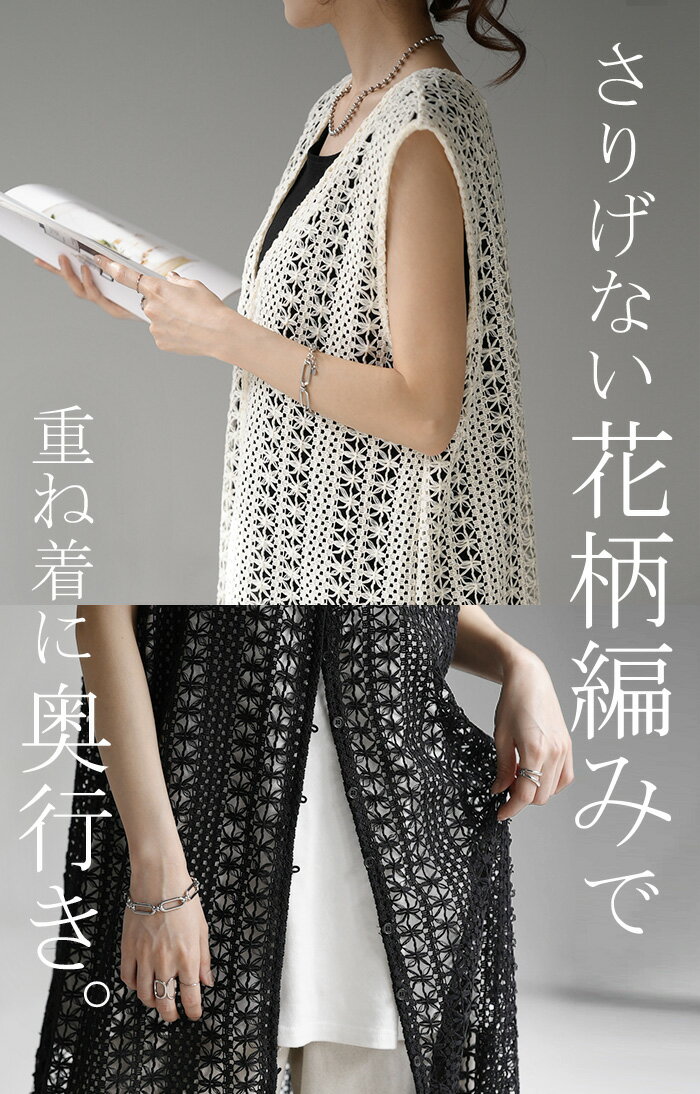 ジレ ベスト ロング レディース 【あす楽】 透かし編み シアー レース サマーニット レイヤード ロングジレ ホロアウト 花柄 メッシュニット ロングベスト 薄手 羽織 深V 2way 着回し お尻が隠れる 縦長効果 トップス 体型カバー 大きいサイズ 白 黒 春 夏 HUG.U