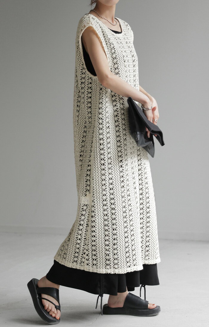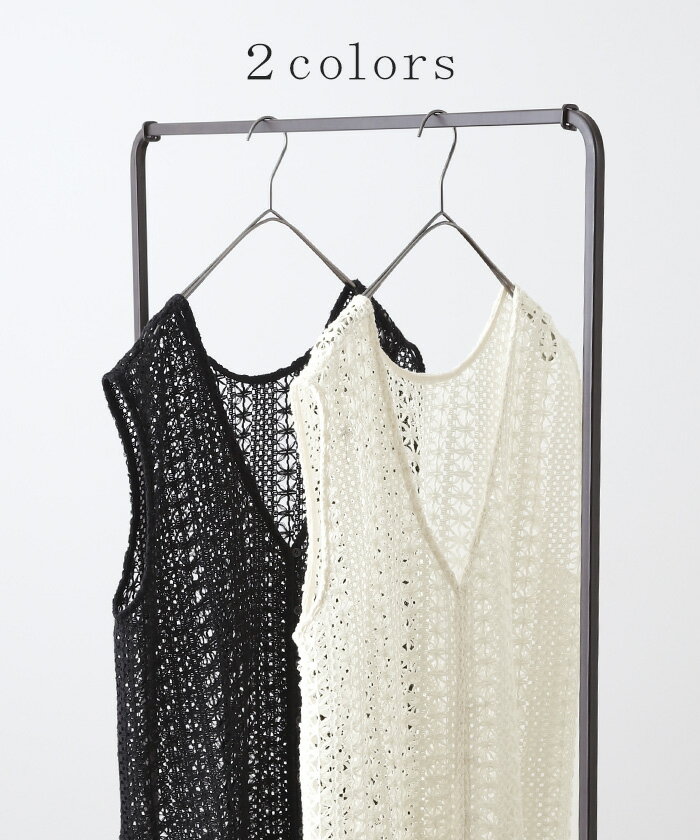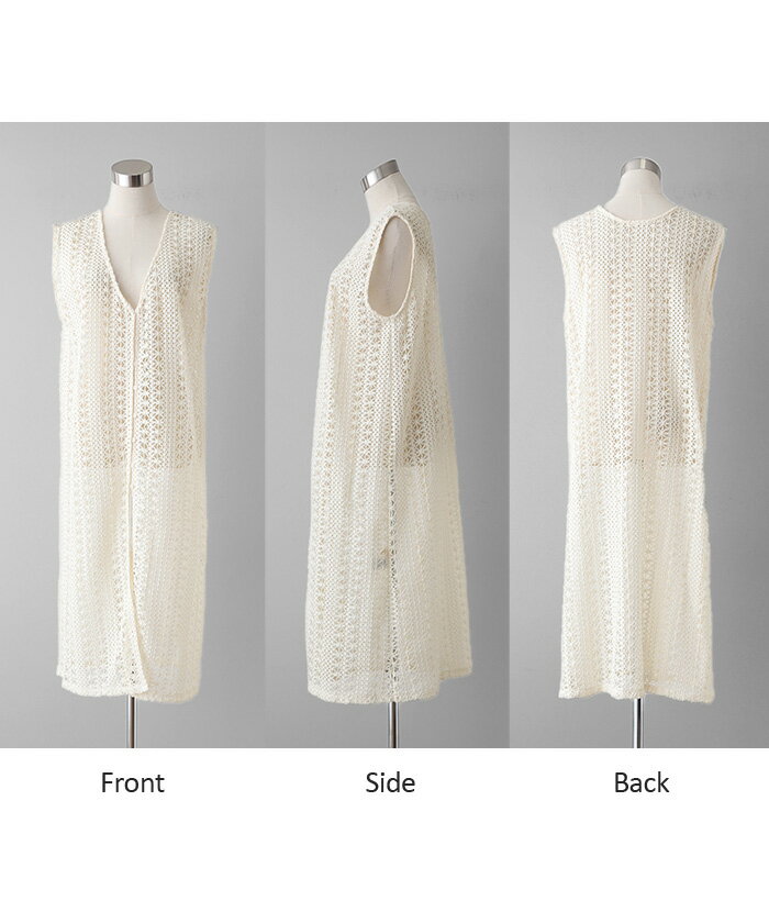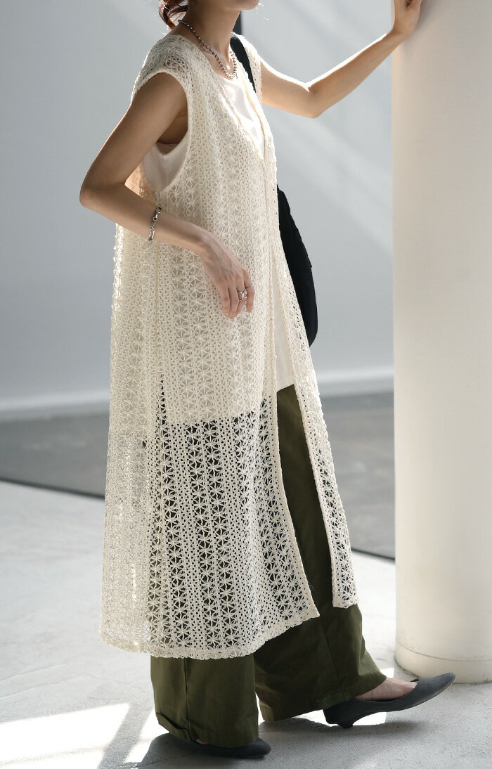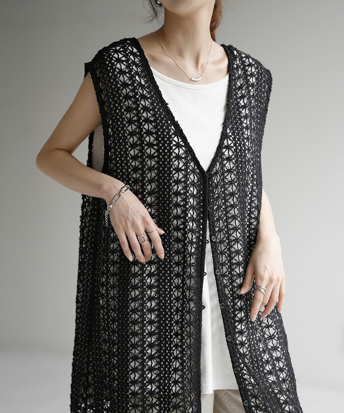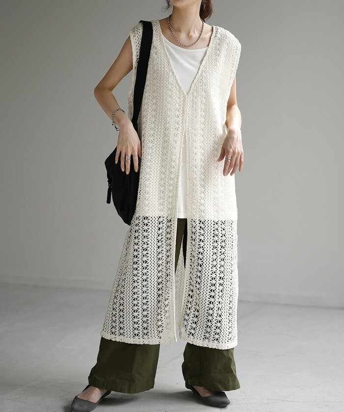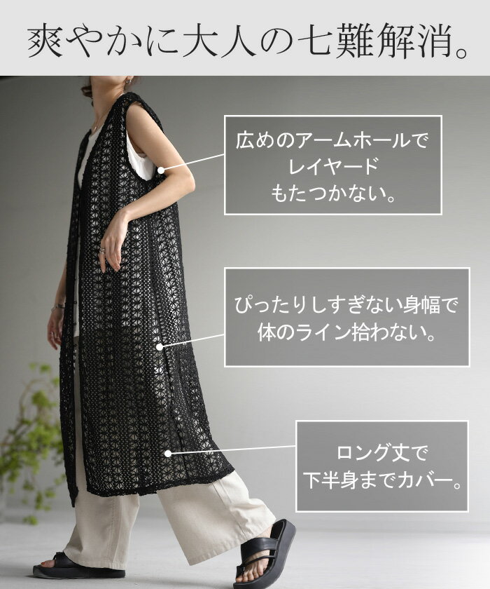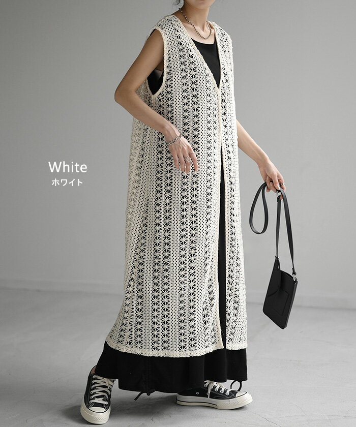 ジレ ベスト ロング レディース 【あす楽】 透かし編み シアー レース サマーニット レイヤード ロングジレ ホロアウト 花柄 メッシュニット ロングベスト 薄手 羽織 深V 2way 着回し お尻が隠れる 縦長効果 トップス 体型カバー 大きいサイズ 白 黒 春 夏 HUG.U