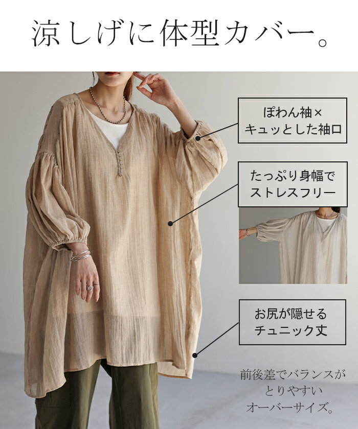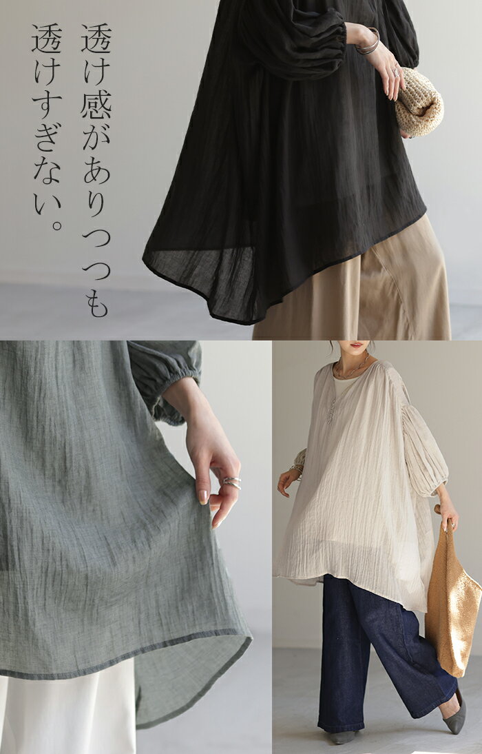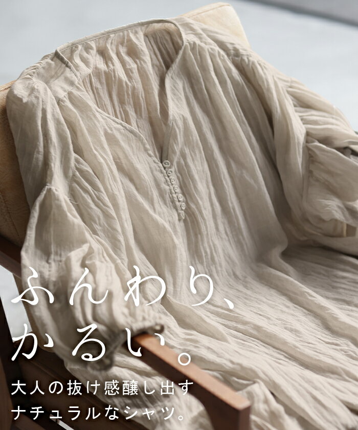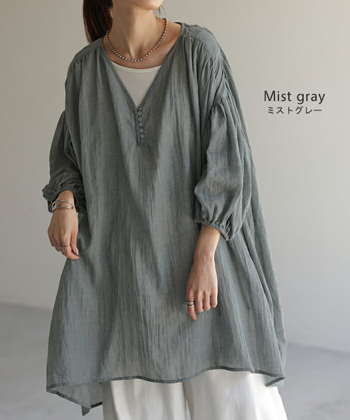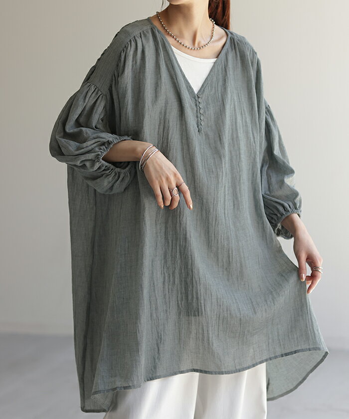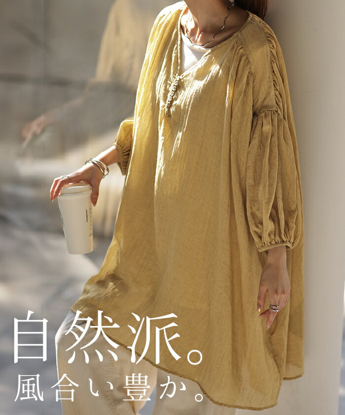 シャツ ナチュラル スキッパー チュニック 【あす楽】 バンドカラー トップス レディース ギャザー ロングシャツ 長袖 半袖 ノーカラー ロング ブラウス シャツワンピ シボ感 ゆる 体型カバー 長い オーバーサイズ 大きいサイズ きれいめ 無地 白 春 夏 HUG.U