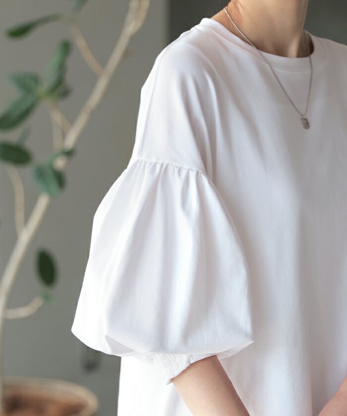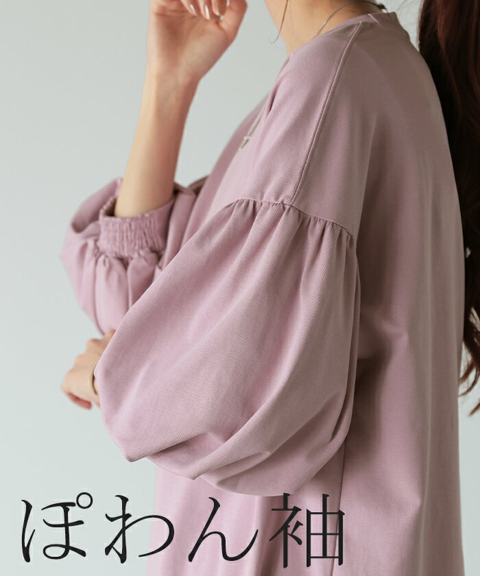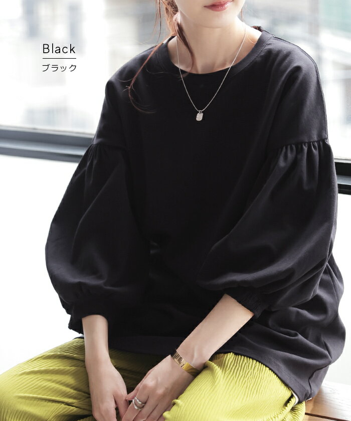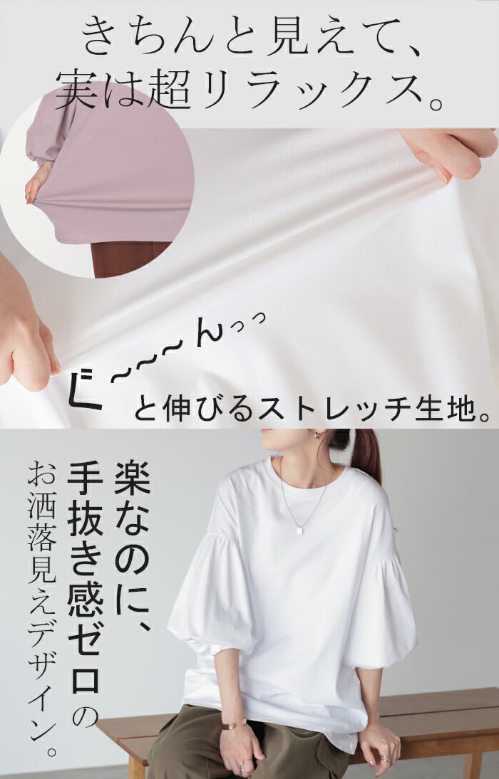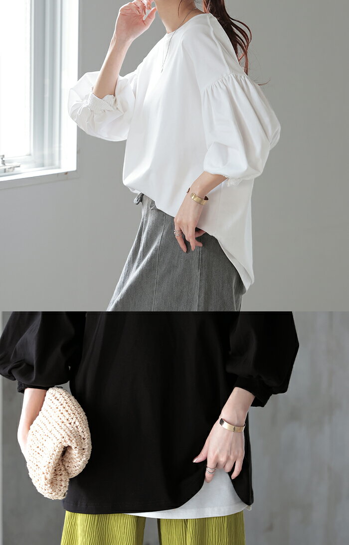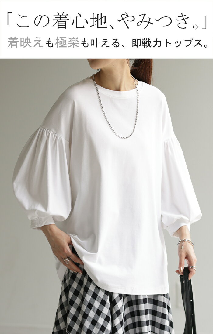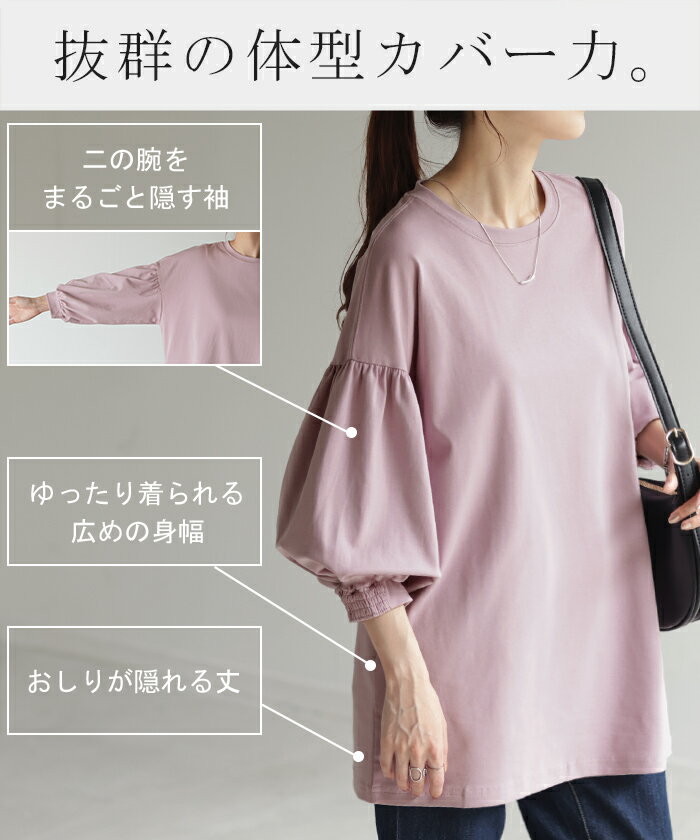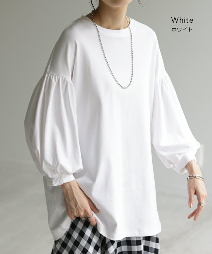 Tシャツ ぽわん袖 ロンT トップス 【あす楽】 ティーシャツ レディース カットソー 二の腕カバー ドルマン ビッグ チュニック 体型カバー 長袖 ロング ゆったり ボリューム パフスリーブ 無地 ストレッチ きれいめ お尻が隠れる 大きいサイズ 白 黒 秋 夏 HUG.U