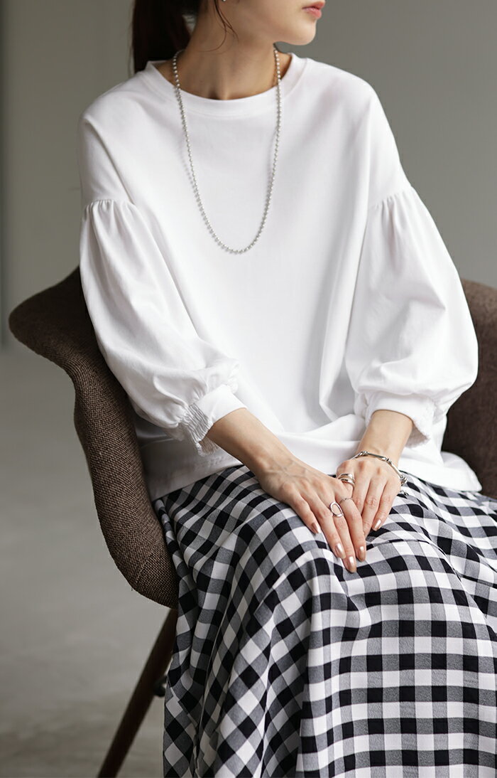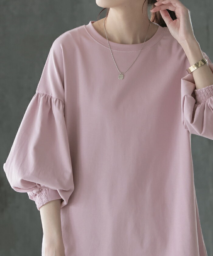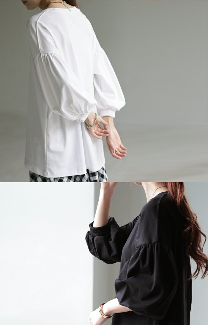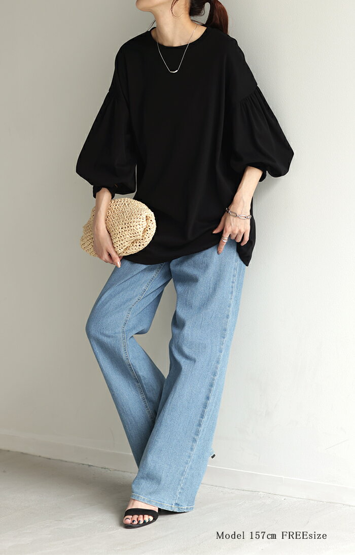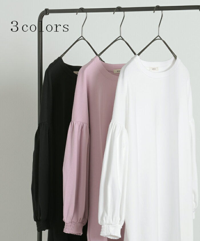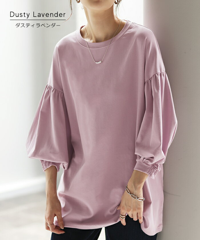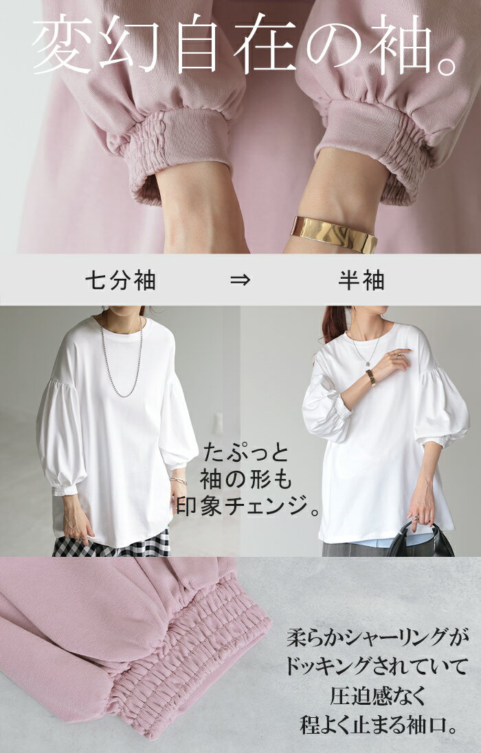 Tシャツ ぽわん袖 ロンT トップス 【あす楽】 ティーシャツ レディース カットソー 二の腕カバー ドルマン ビッグ チュニック 体型カバー 長袖 ロング ゆったり ボリューム パフスリーブ 無地 ストレッチ きれいめ お尻が隠れる 大きいサイズ 白 黒 秋 夏 HUG.U