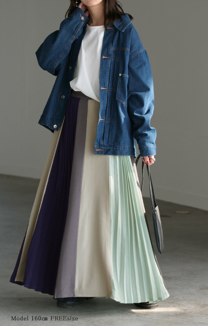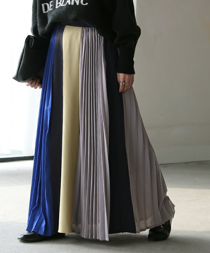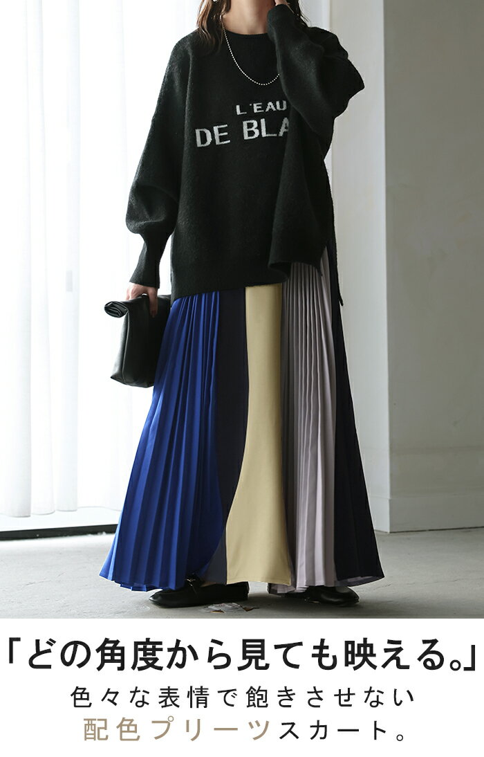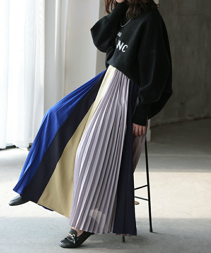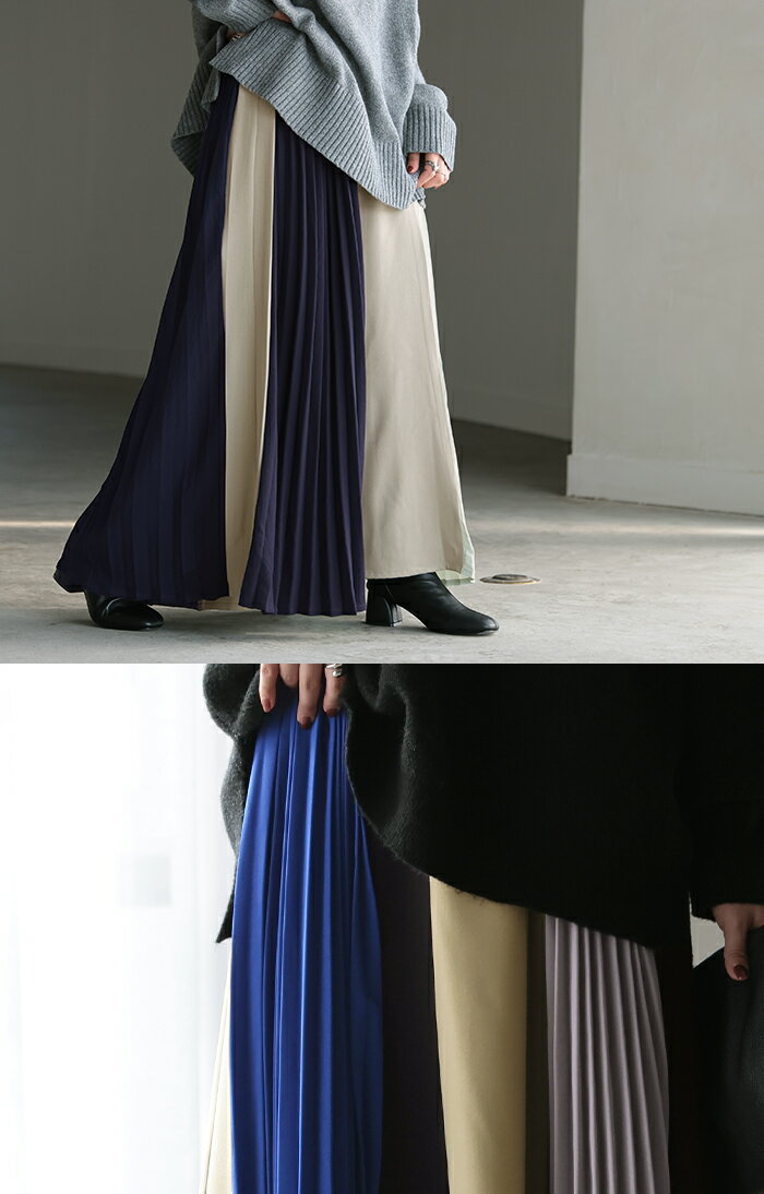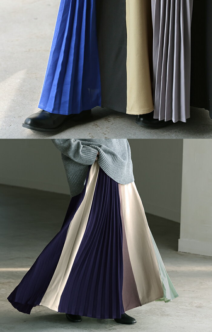 スカート 配色 プリーツ ■8月下旬入荷 プリーツスカート レディース ボトムス ロングスカート ロング マキシ マキシスカート 長い 体型カバー フレア ゴム ウエストゴム Aライン 大きいサイズ 無地 高身長 きれいめ 切り替え 黒 ブルー 春 夏 HUG.U