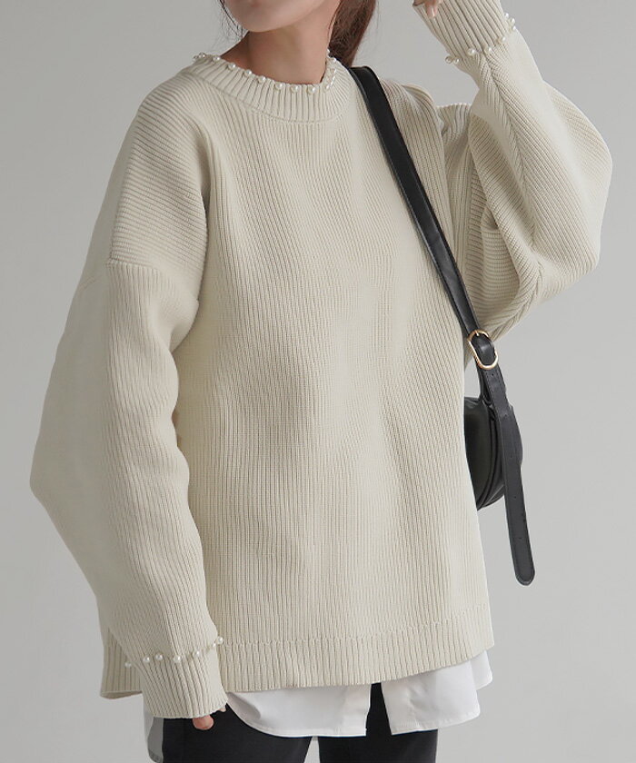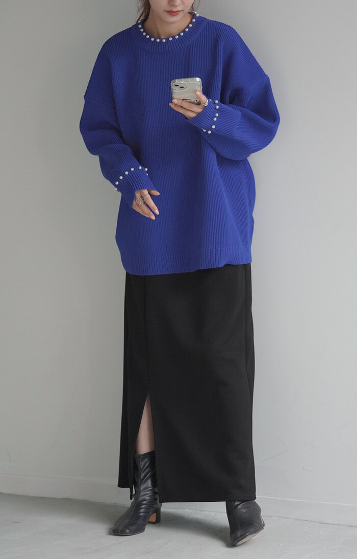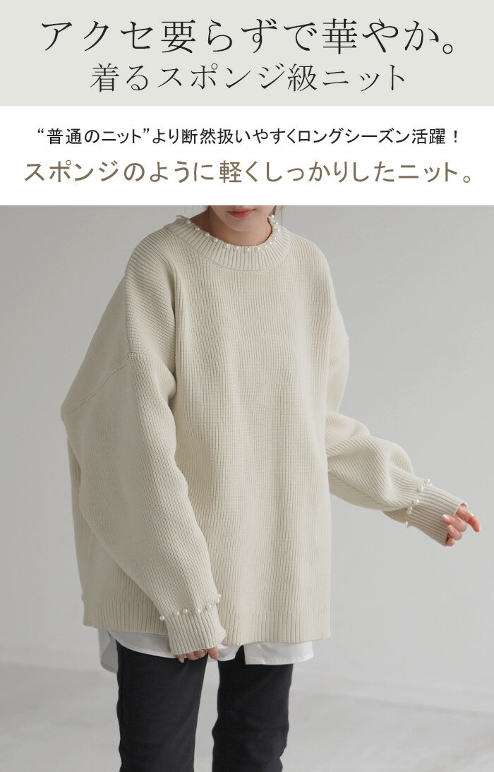 ニット パール ロング 【即納】 レディース トップス チュニック ドルマン リブ スポンジニット ストレッチ 無地 ロングニット セーター コクーン 長袖 ビーズ ドロップショルダー Uネック 大きいサイズ 体型カバー 上品 きれいめ ブルー 白 秋 冬 HUG.U