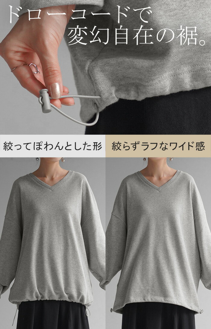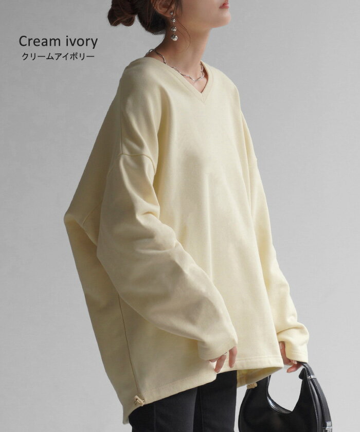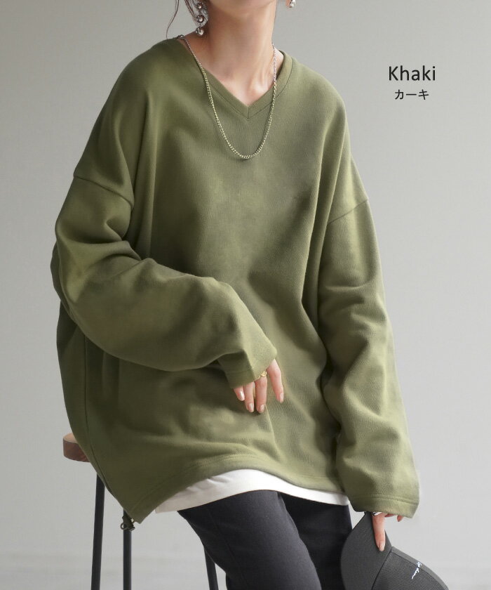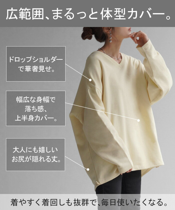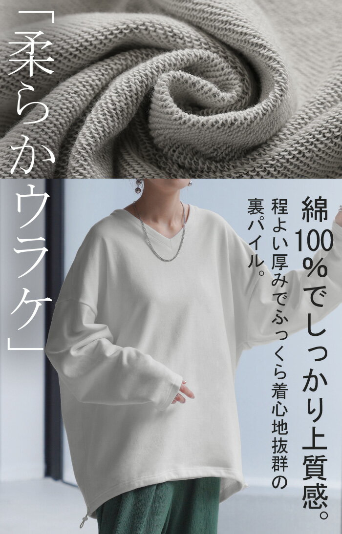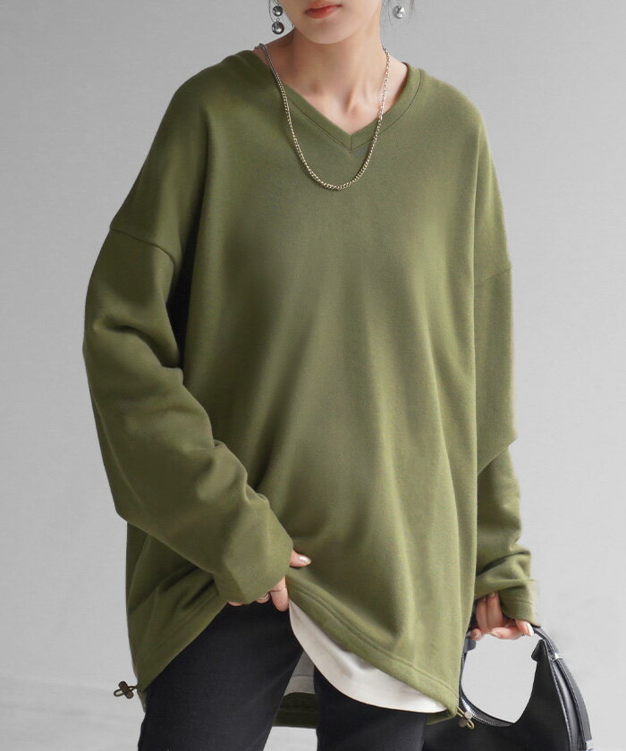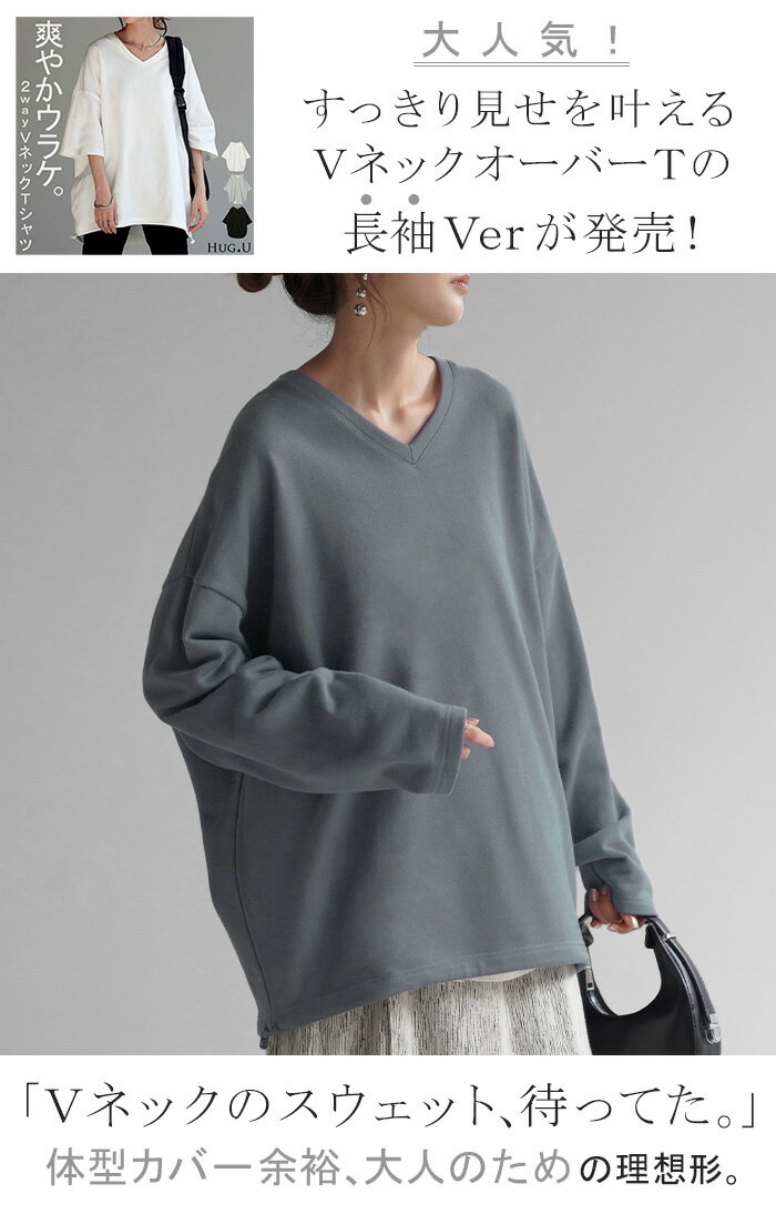 スウェット レディース トップス 【即納】 ドロスト オーバーサイズ トレーナー ストレッチ 体型カバー シンプル 無地 長袖 ロング チュニック ビッグ 大きいサイズ シャーリング ゆる 楽 Vネック 変形 裾 長い 綿 大人 おしゃれ グリーン 黒 秋 夏 HUG.U