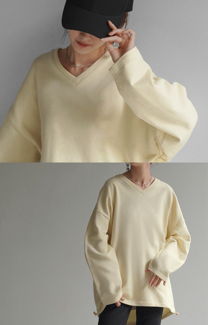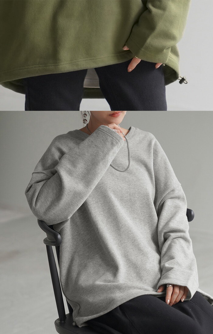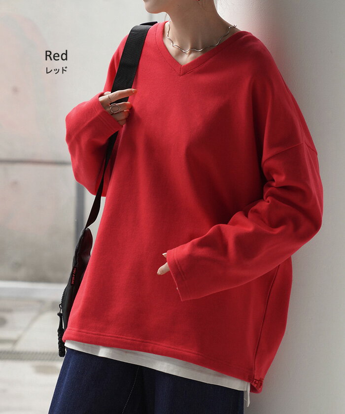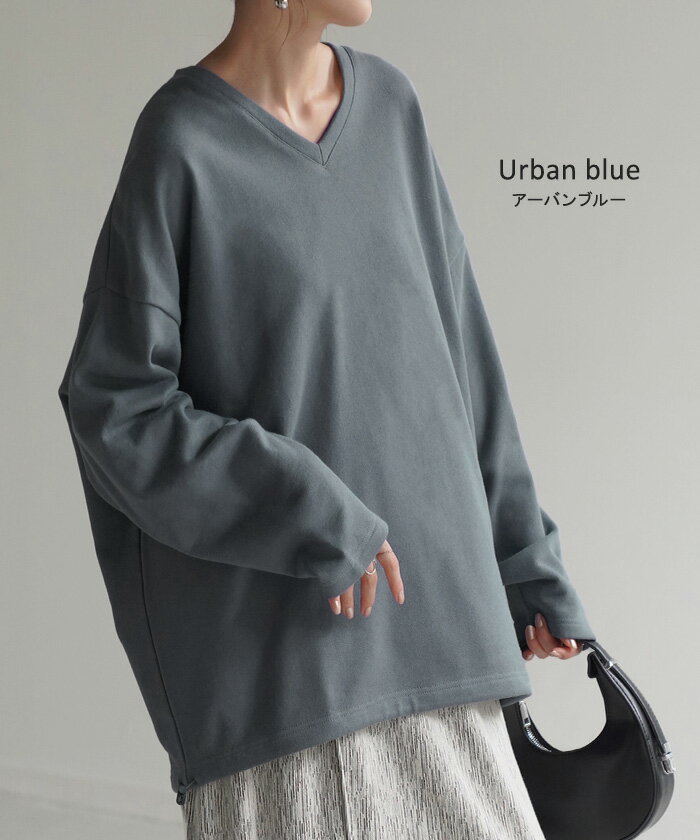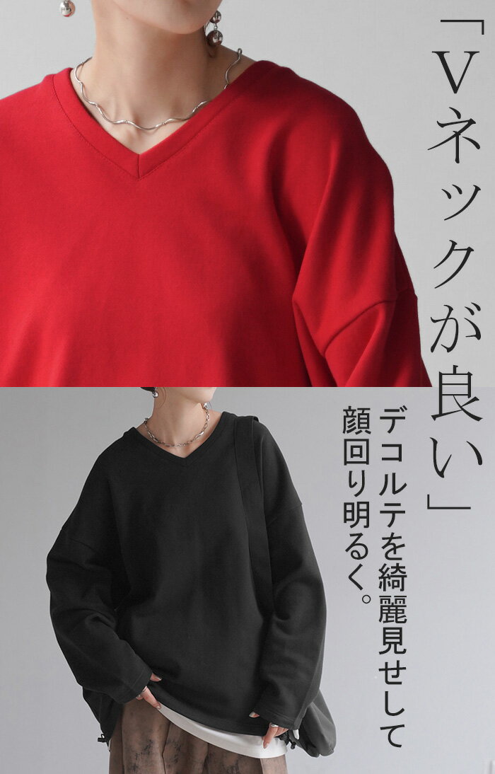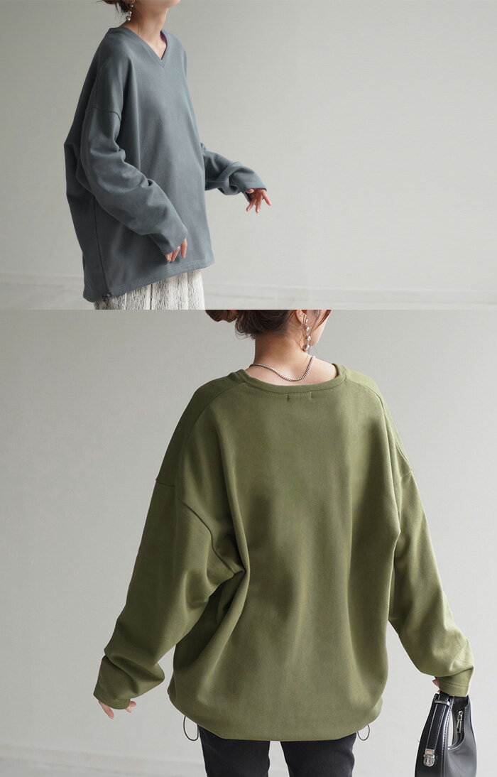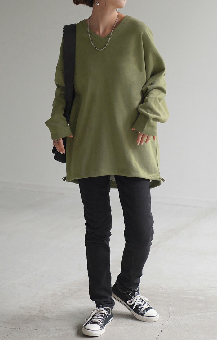 スウェット レディース トップス 【即納】 ドロスト オーバーサイズ トレーナー ストレッチ 体型カバー シンプル 無地 長袖 ロング チュニック ビッグ 大きいサイズ シャーリング ゆる 楽 Vネック 変形 裾 長い 綿 大人 おしゃれ グリーン 黒 秋 夏 HUG.U