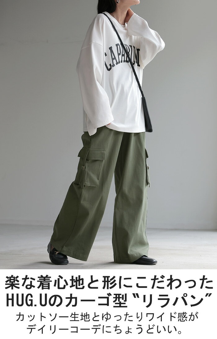 パンツ カーゴ ワイド ロング 綿100% 【即納】 レディース ボトムス ボトム ハイウエスト ズボン ずぼん ロングパンツ ウエストゴム ワイドパンツ カーゴパンツ コットン 無地 ポケット ストレッチ 大きいサイズ 体型カバー カジュアル 白 黒 秋 冬 HUG.U