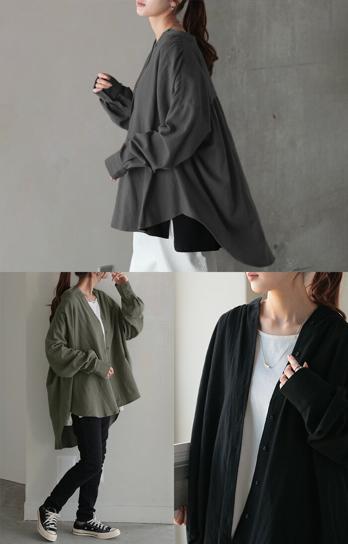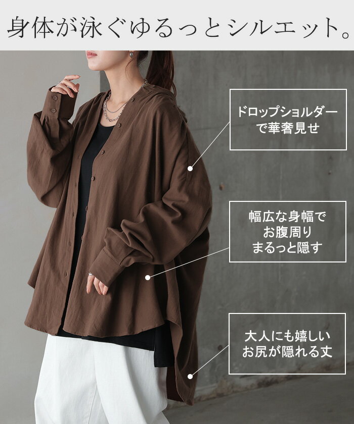 シャツ 微起毛 トップス ロング 綿100% 【即納】 レディース ロングシャツ チュニック ブラウス ノーカラー バンドカラー オーバーサイズ ゆったり 二の腕カバー ドルマン 体型カバー お尻が隠れる 羽織 長袖 きれいめ 大きいサイズ 黒 白 カーキ 秋 冬 HUG.U