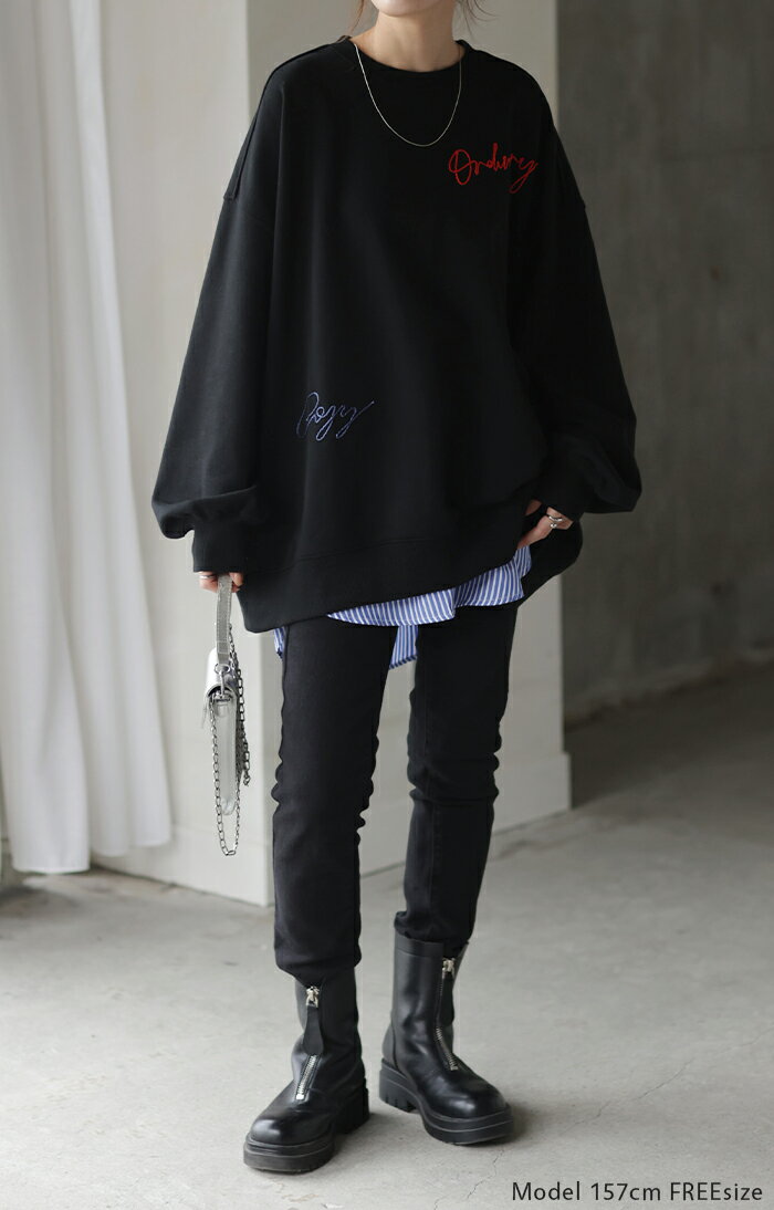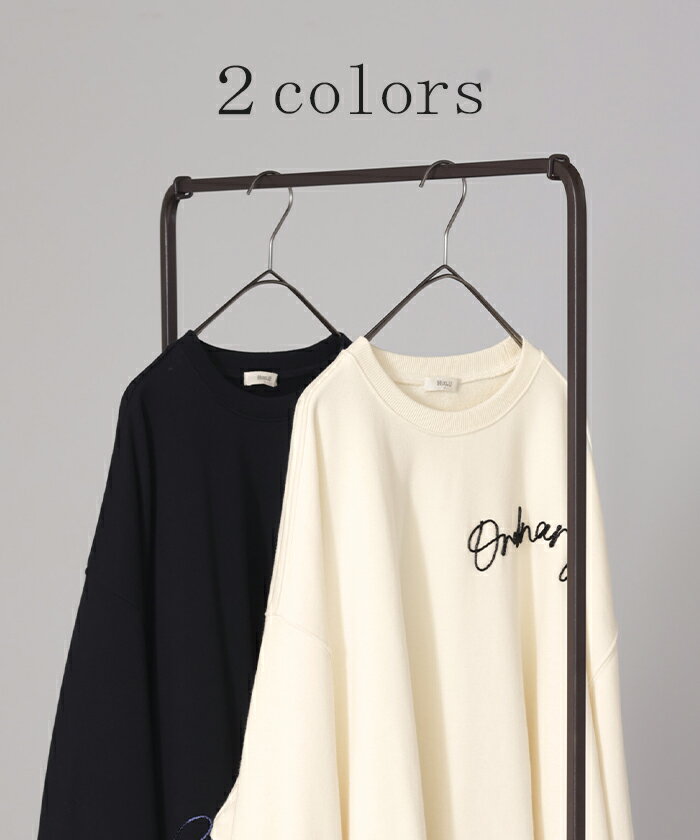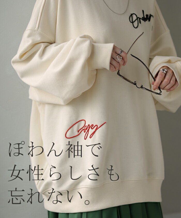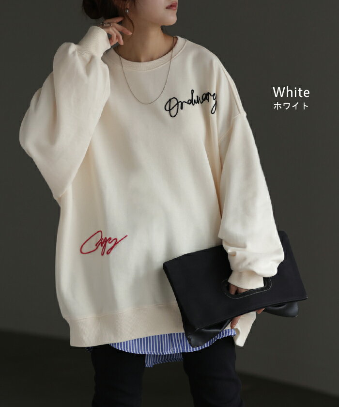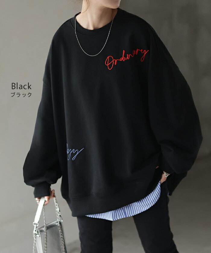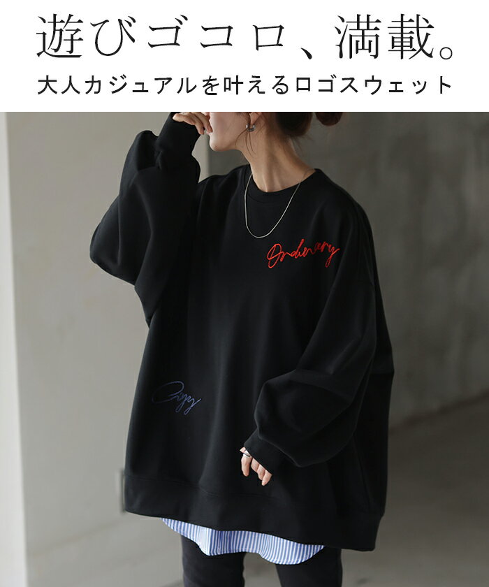 ロゴ 刺繍 スウェット レディース 【即納】 カジュアル レーナー トップス 体型カバー チュニック 大きいサイズ 無地 ドルマンスリーブ スエット プルオーバー ビッグ ロング ドロップショルダー ビッグシルエット ゆる ぽわん袖 長袖 黒 白 秋 冬 HUG.U