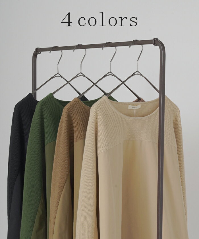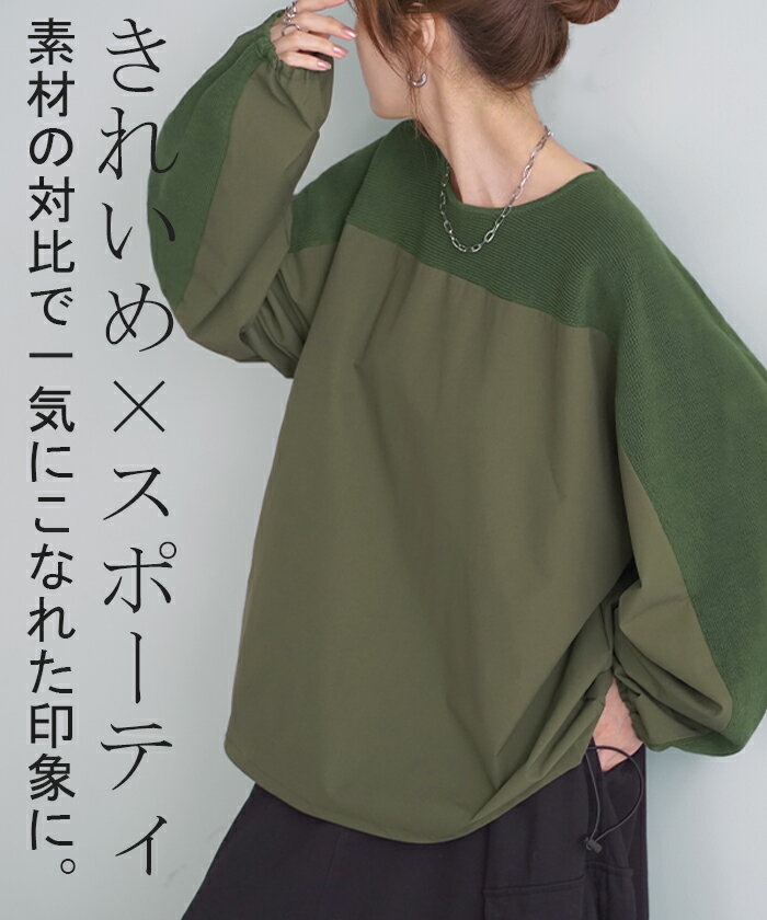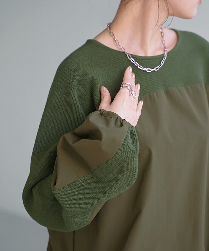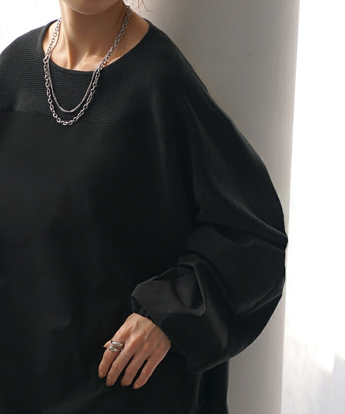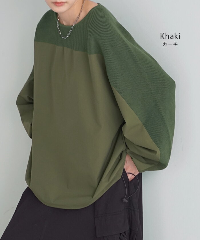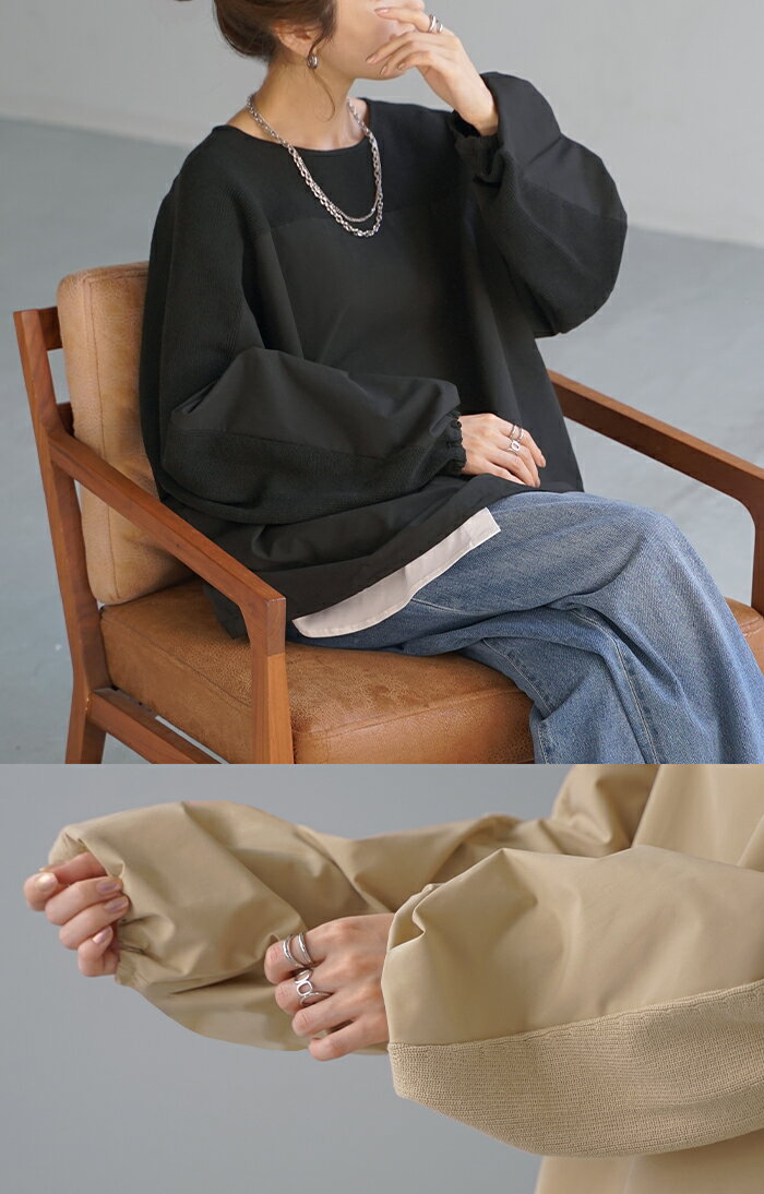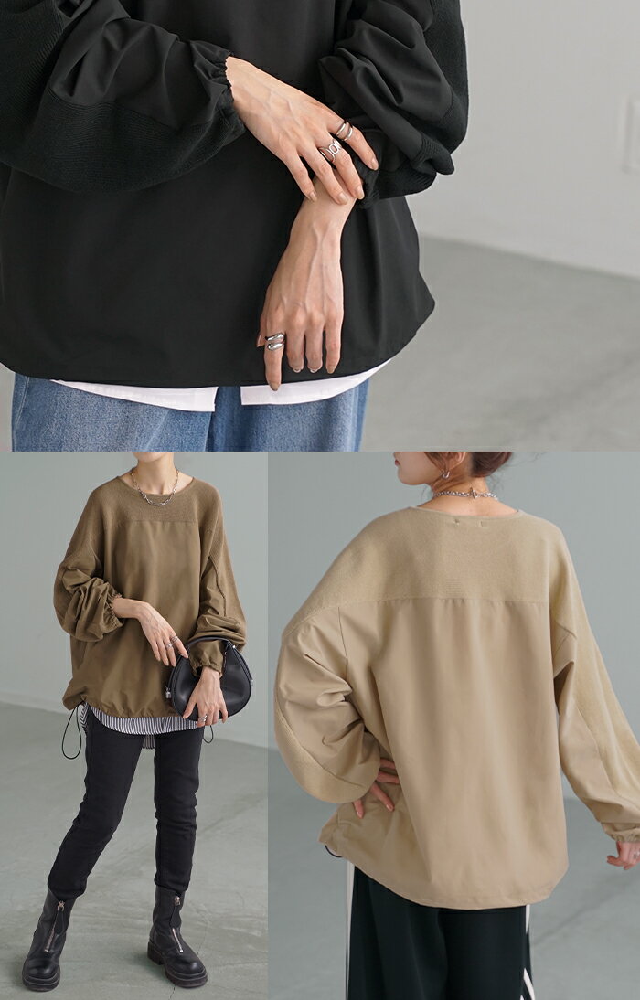 異素材 ニット スウェット トレーナー 【即納】 レディース ドッキング トップス プルオーバー セーター モックネック ブラウス バルーン ぽわん袖 長袖 ギャザー 異素材 大きいサイズ 体型カバー きれいめ 黒 緑 ブラウン ベージュ ブラック シャツ 秋 冬 HUG.U