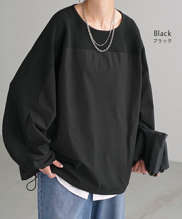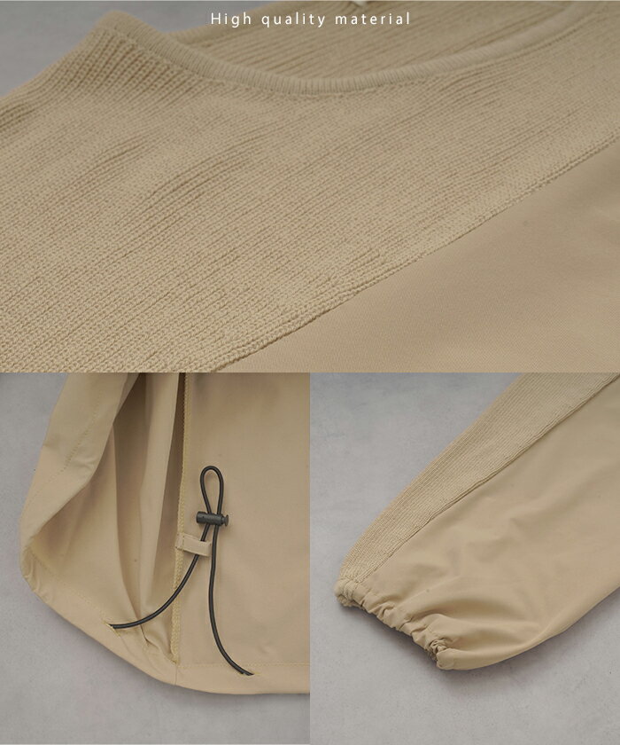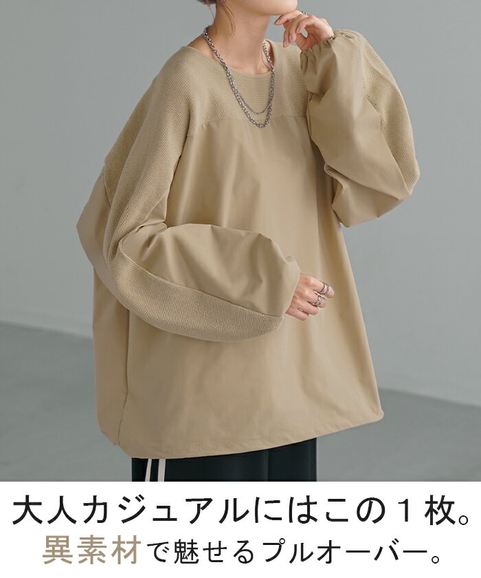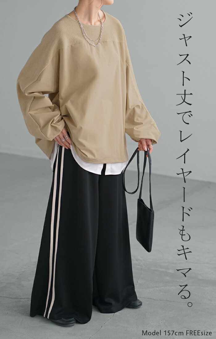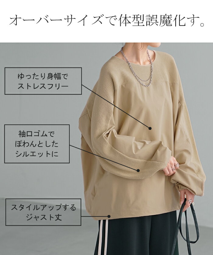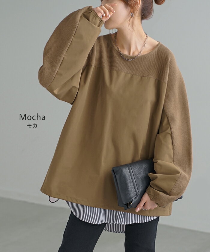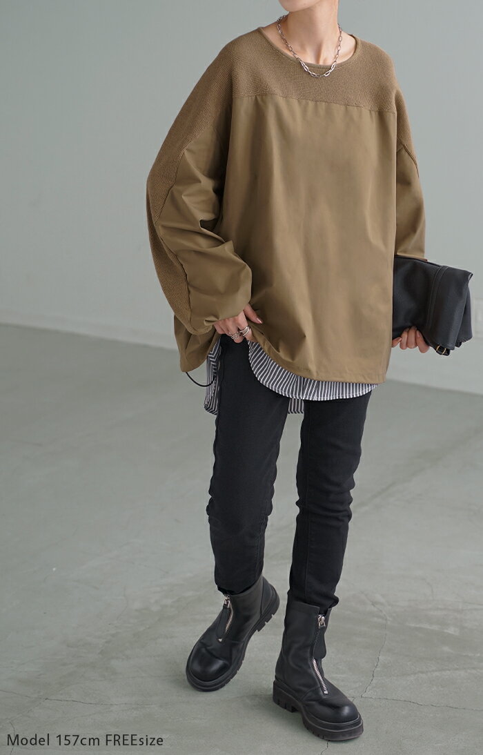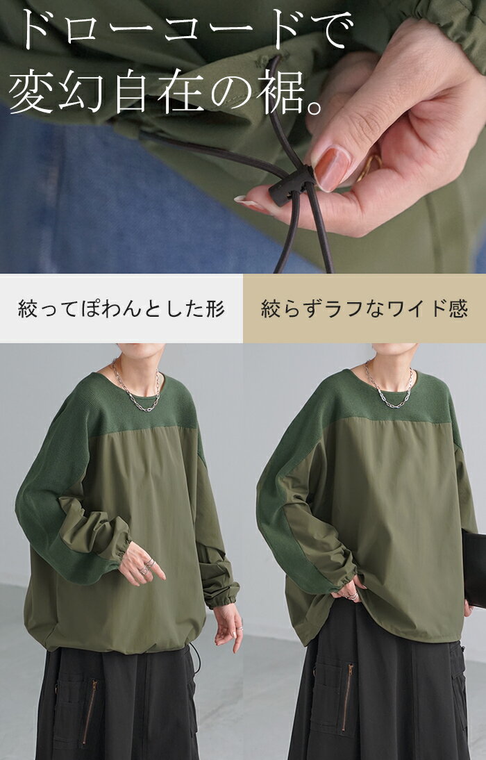 異素材 ニット スウェット トレーナー 【即納】 レディース ドッキング トップス プルオーバー セーター モックネック ブラウス バルーン ぽわん袖 長袖 ギャザー 異素材 大きいサイズ 体型カバー きれいめ 黒 緑 ブラウン ベージュ ブラック シャツ 秋 冬 HUG.U