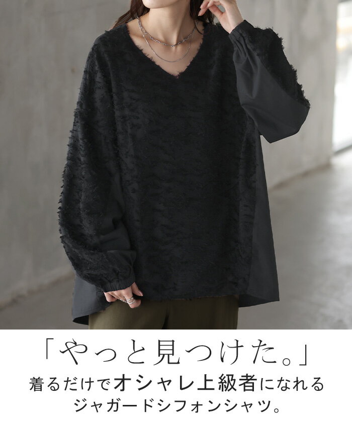 シャツ 別売り セットアップ可 【即納】 シフォン トップス フリンジ ブラウス Vネック チュニック オーバーサイズ 長い ロング ロングシャツ 長袖 きれいめ ゆる ドロップショルダー ドルマン 異素材 ドッキング 大きいサイズ 体型カバー 黒 秋 冬 HUG.U