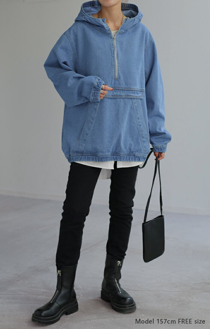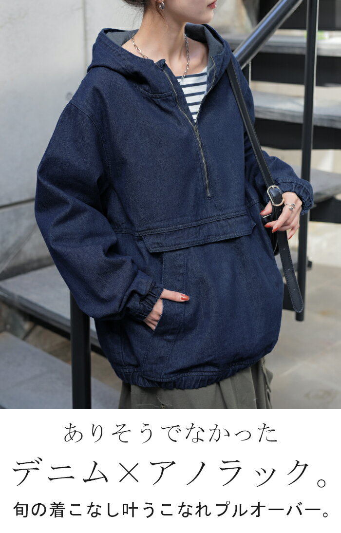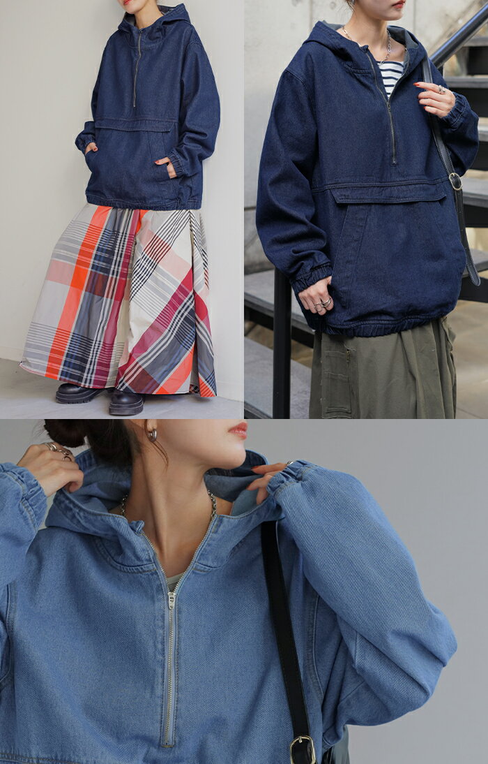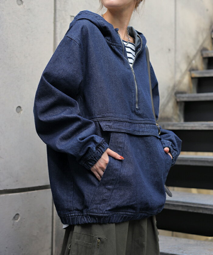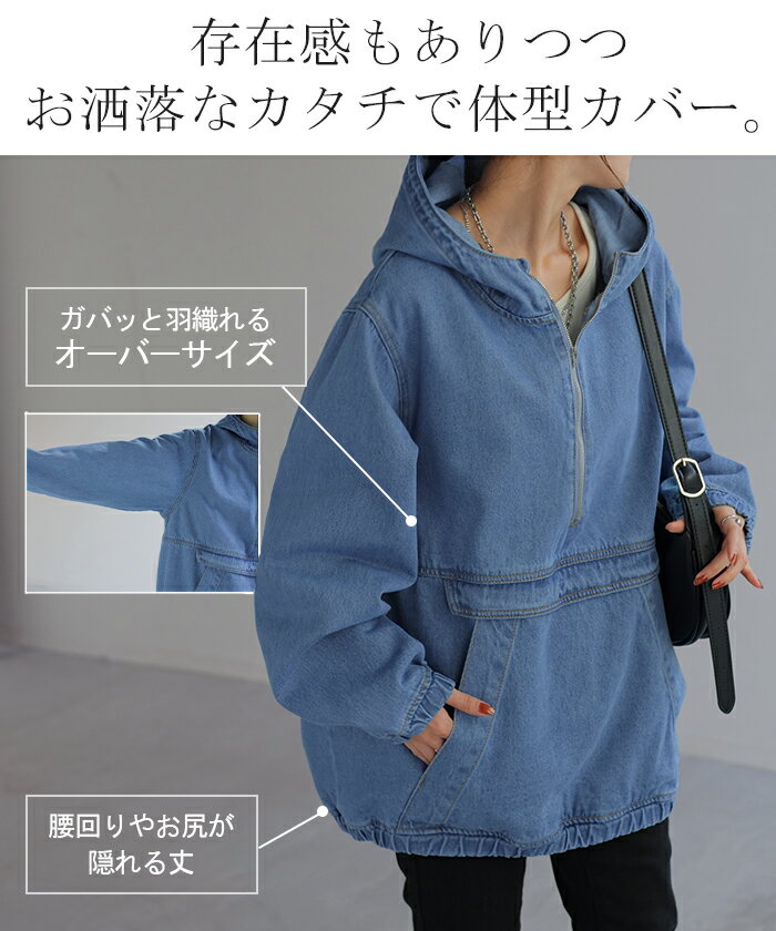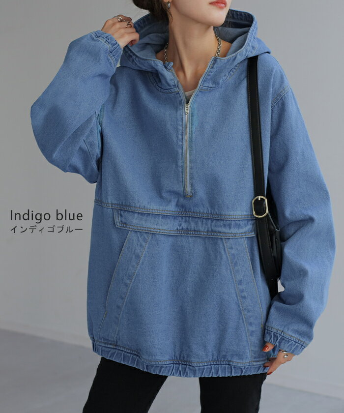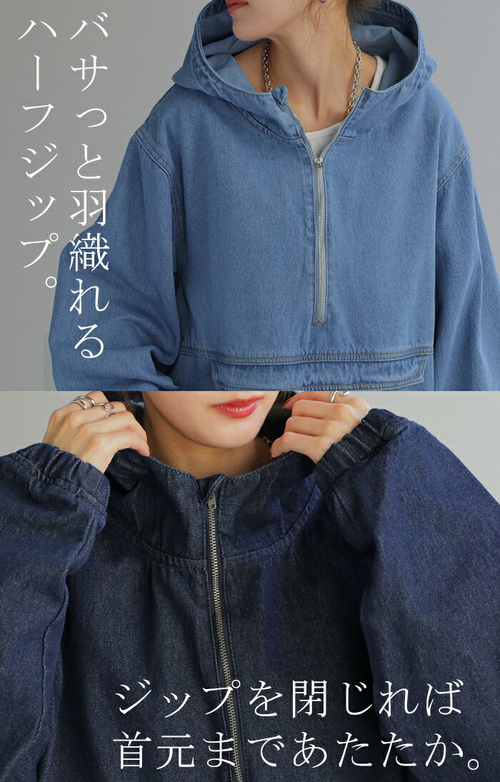 パーカー デニム ハーフジップ トップス レディース 【即納】 アノラック オーバーサイズ アウター アノラックパーカー ロング Gジャン デニムパーカー 羽織 お尻が隠れる フーディー ドロップショルダー ビッグ 無地 体型カバー 大きいサイズ 青 秋 冬 HUG.U