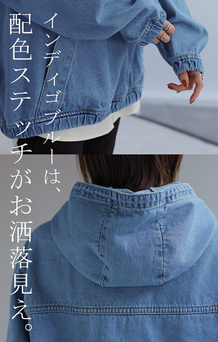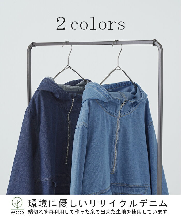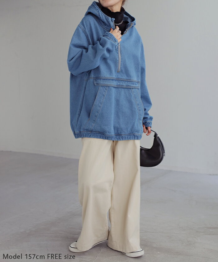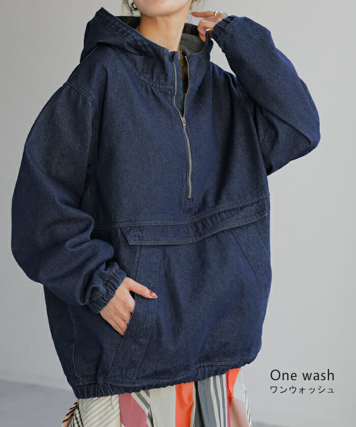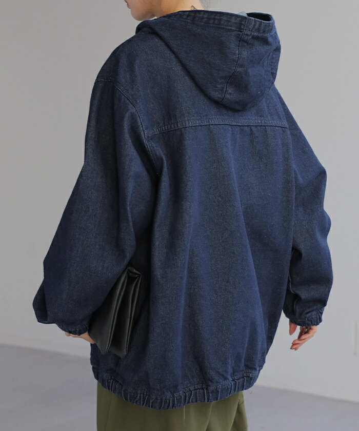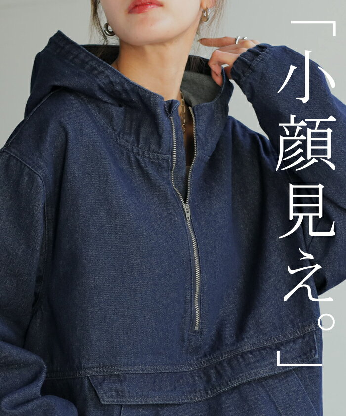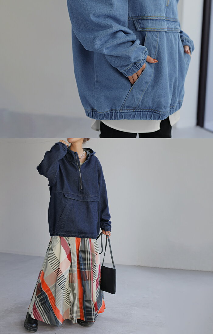 パーカー デニム ハーフジップ トップス レディース 【即納】 アノラック オーバーサイズ アウター アノラックパーカー ロング Gジャン デニムパーカー 羽織 お尻が隠れる フーディー ドロップショルダー ビッグ 無地 体型カバー 大きいサイズ 青 秋 冬 HUG.U