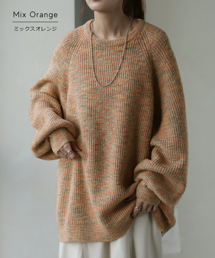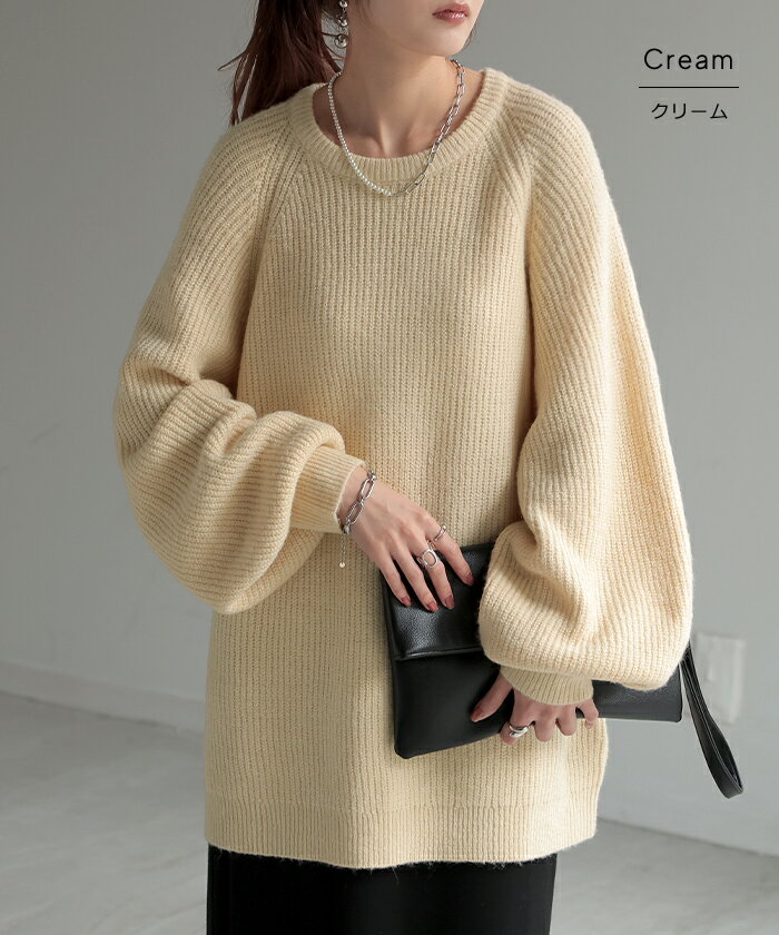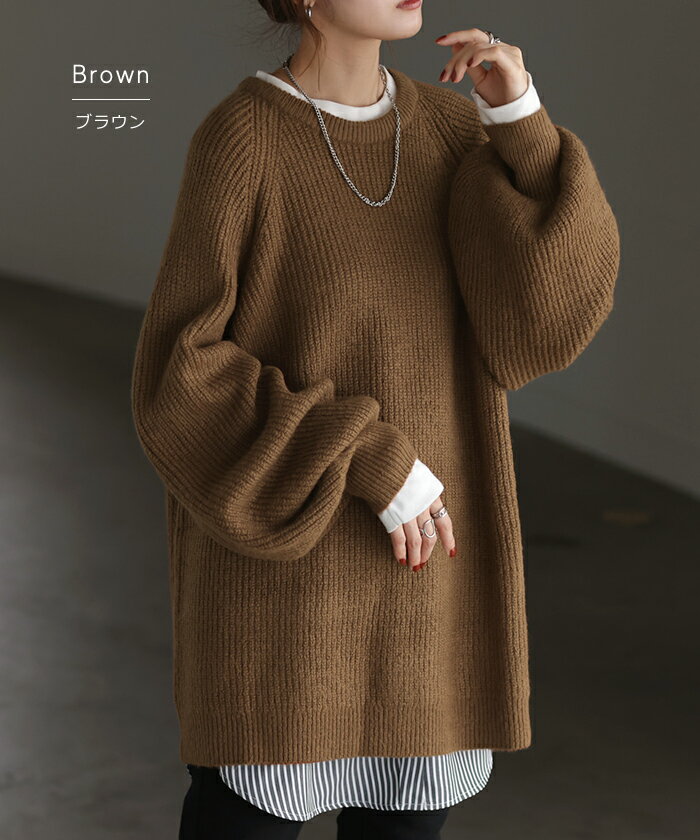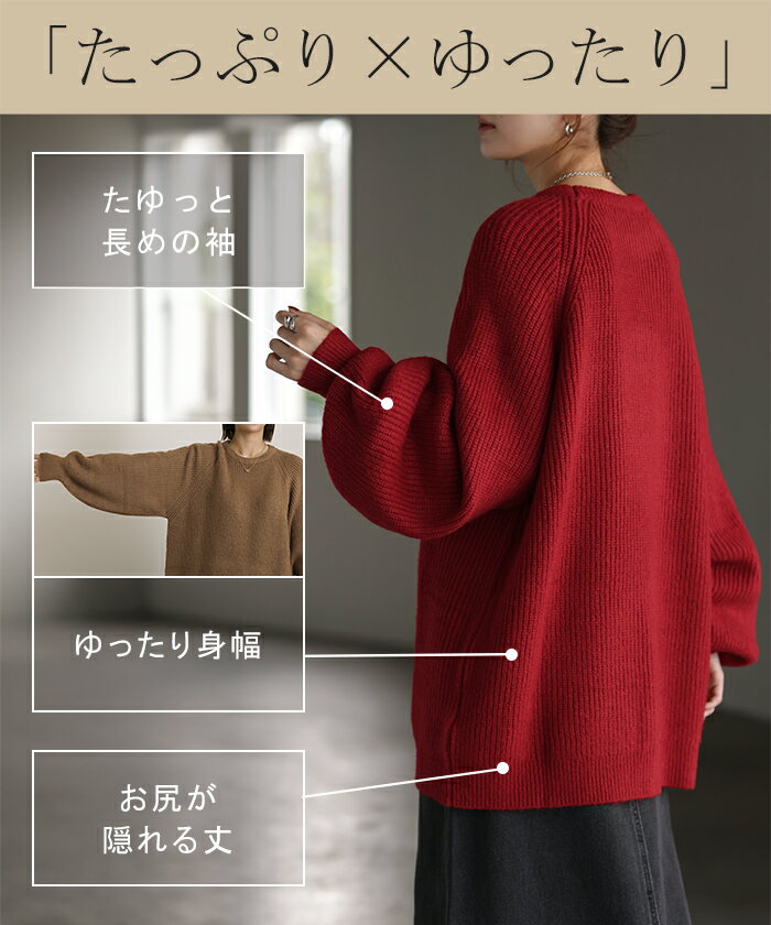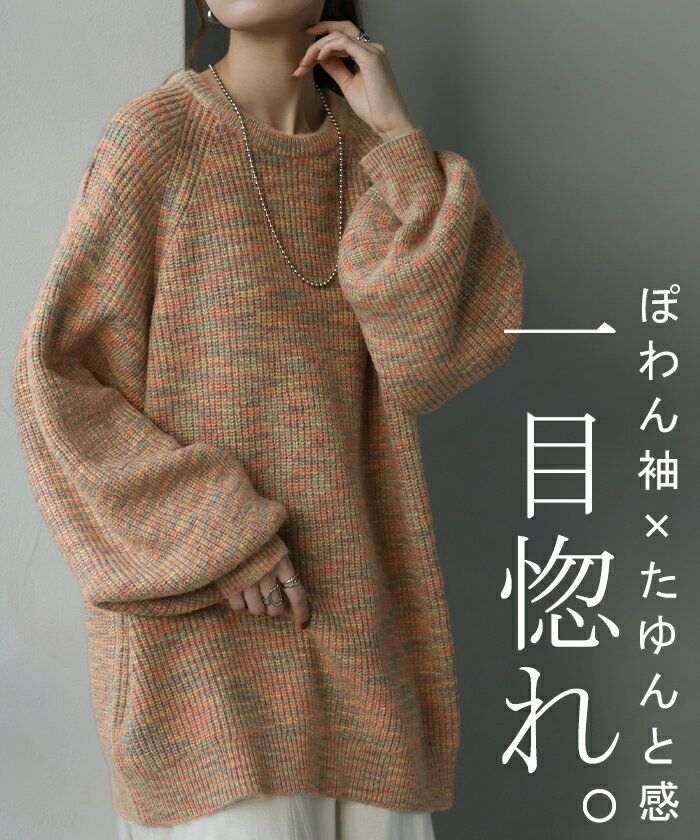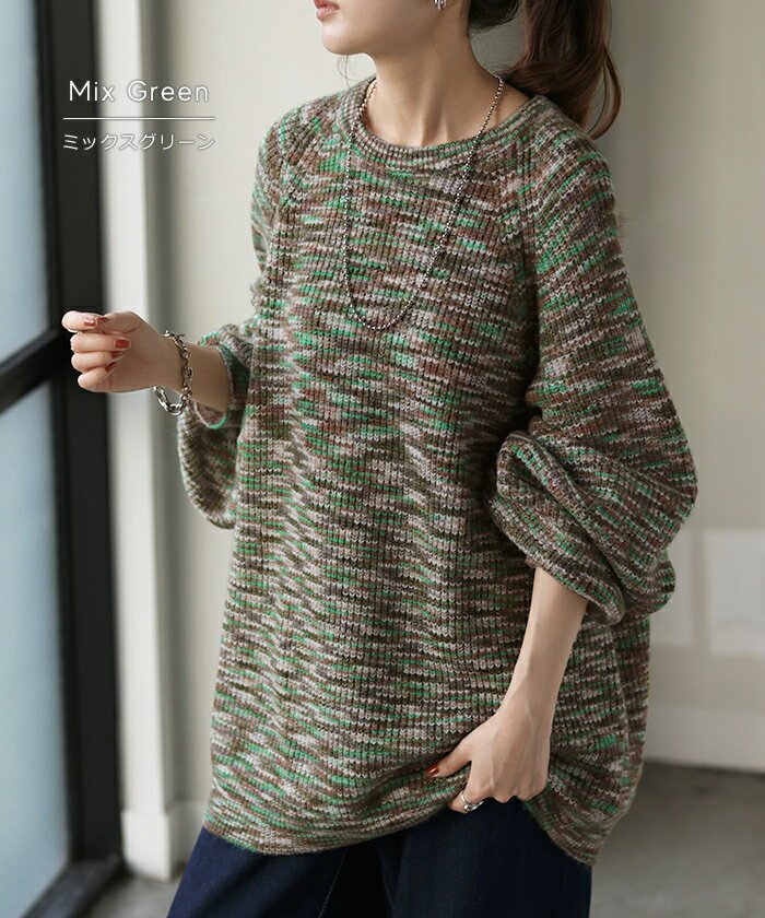 ニット ボリュームスリーブ ロング 【即納】 レディース トップス 長袖 無地 クルーネック ミックスカラー チュニック ロングニット お尻が隠れる チクチクしない セーター プルオーバー ドルマン ゆったり 大きいサイズ 体型カバー 赤 黒 秋 冬 HUG.U