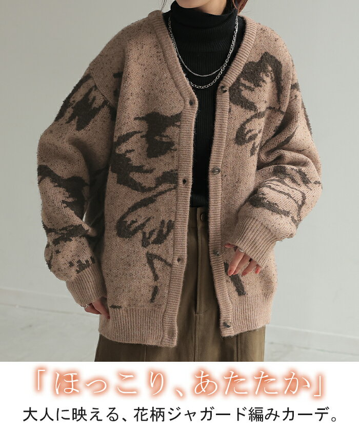 カーディガン 花柄 ニット 【即納】 レディース セーター カーデ トップス ロング オーバー ニットカーディガン ジャガード 柄 チクチクしない 長袖 羽織 Vネック ゆったり オーバーサイズ 体型カバー お尻が隠れる カジュアル ストレッチ 黒 秋 冬 HUG.U
