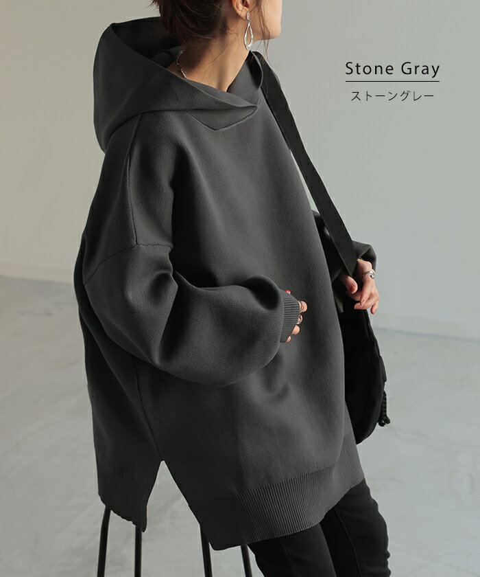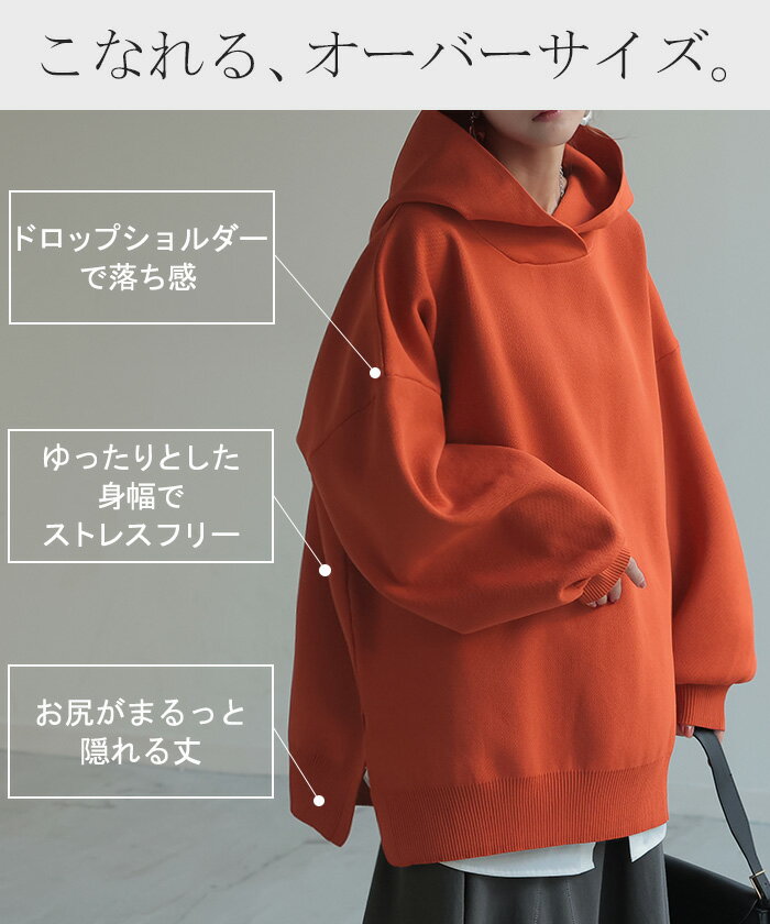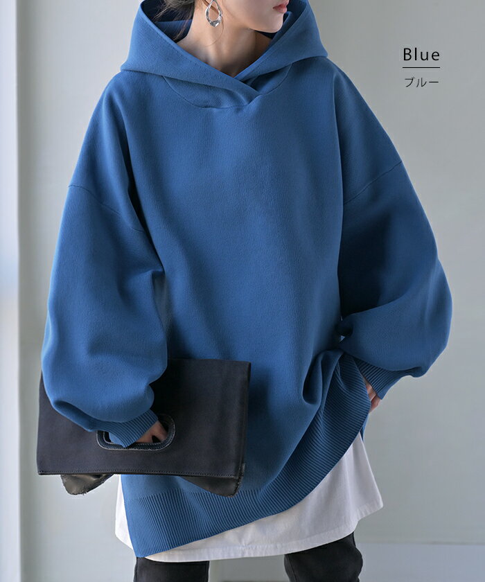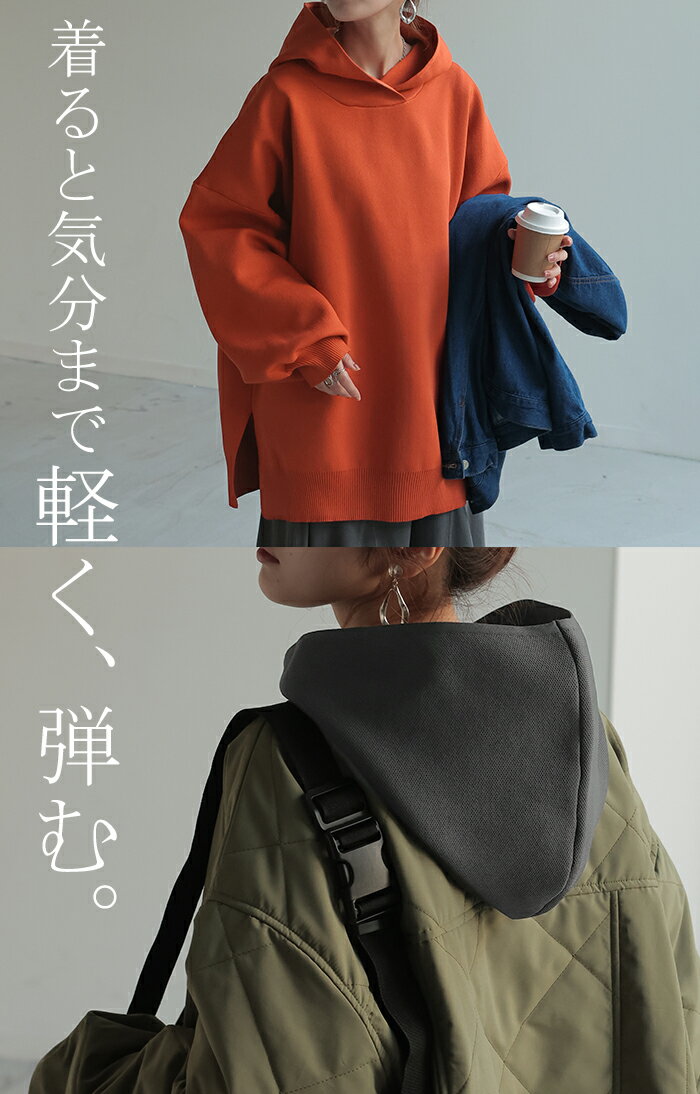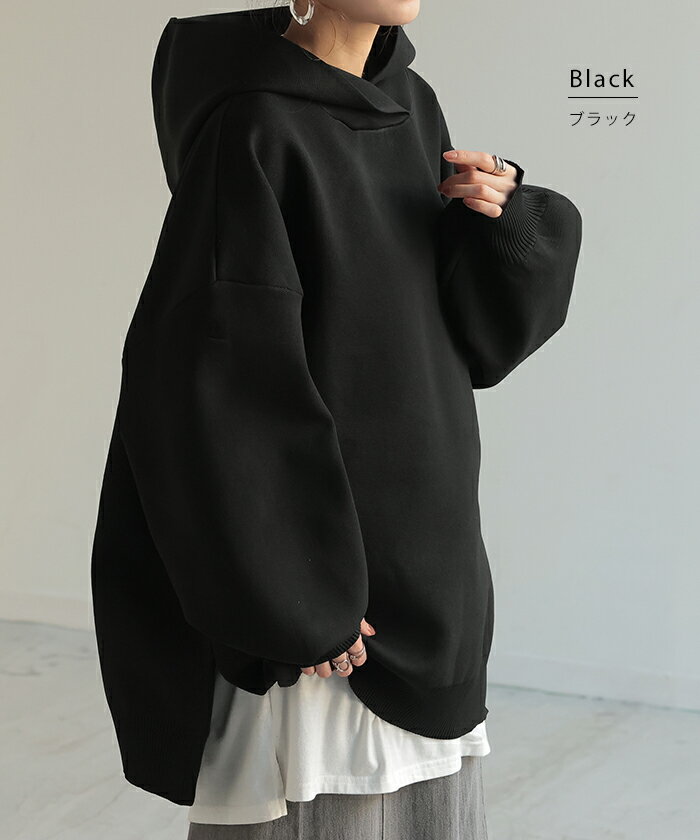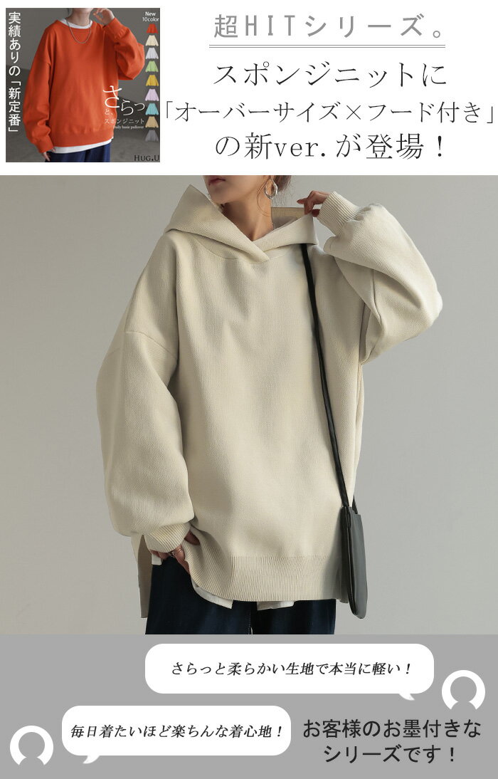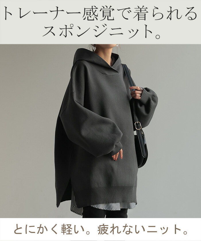パーカー スポンジニット ニットパーカー ■1月上旬入荷 ニット スポーティー レディース ライトアウター トップス プルオーバー フード フーディー ビッグ ドルマン ゆったり オーバーサイズ チュニック 体型カバー 大きいサイズ お尻が隠れる 黒 秋 冬 HUG.U