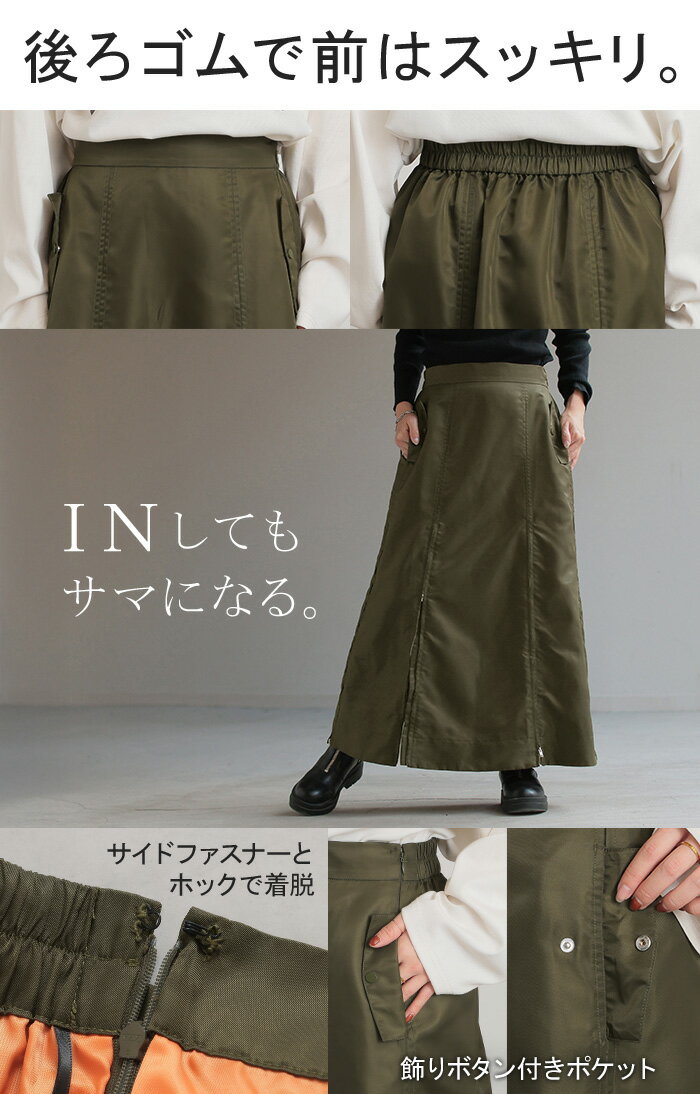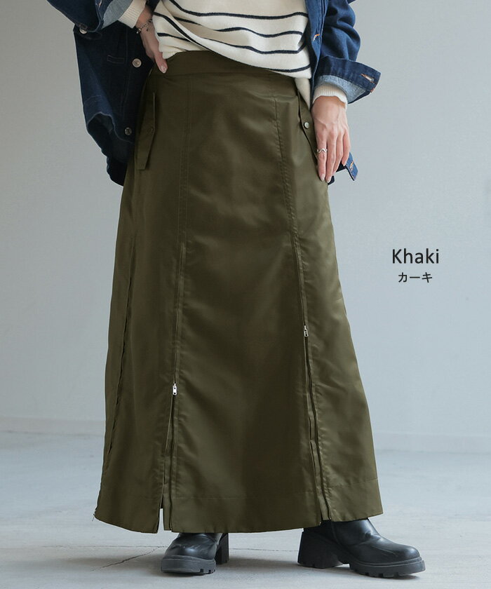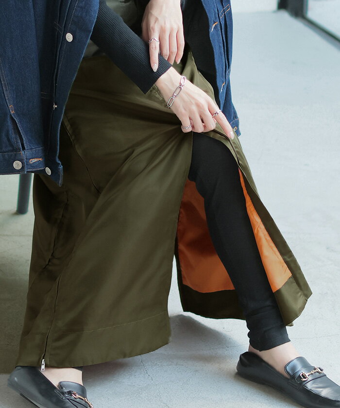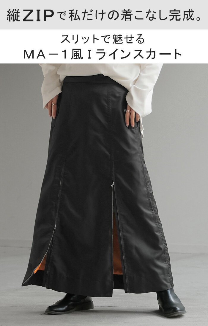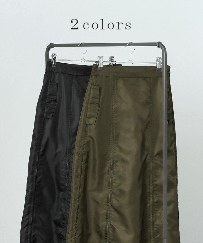 スカート MA-1 ロング ■1月中旬入荷予定 レディース ボトムス ロングスカート フレア フレアスカート マキシ マキシスカート ハイウエスト Iライン ジップ スリット 体型カバー 大きいサイズ 無地 ゆったり ミリタリー カジュアル モード カーキ 黒 秋 冬 HUG.U